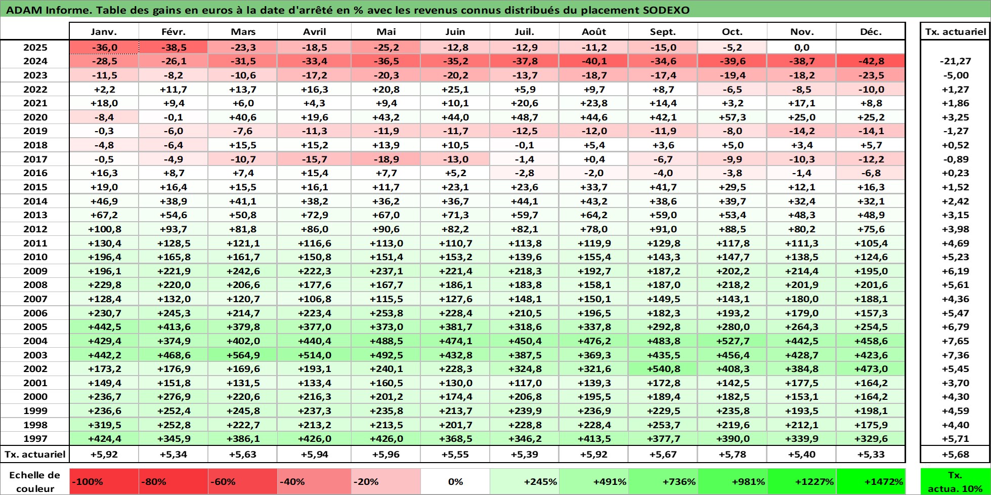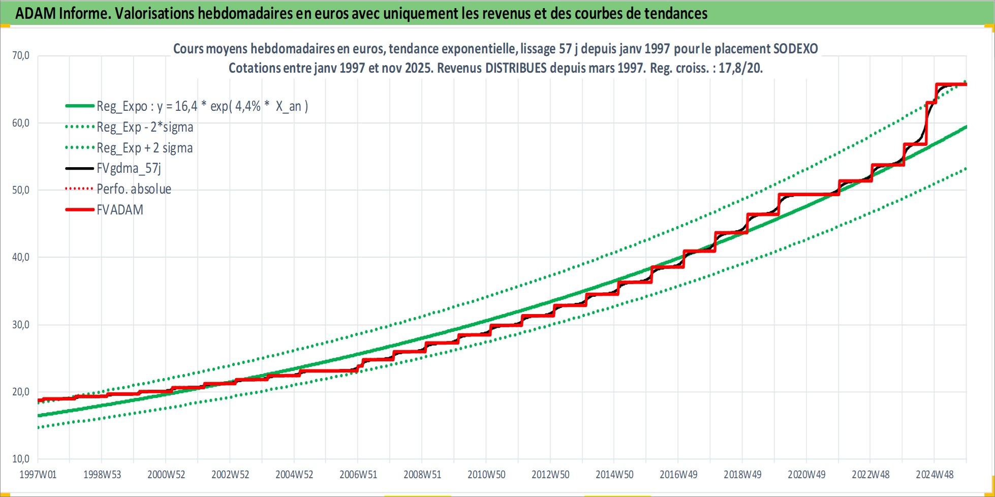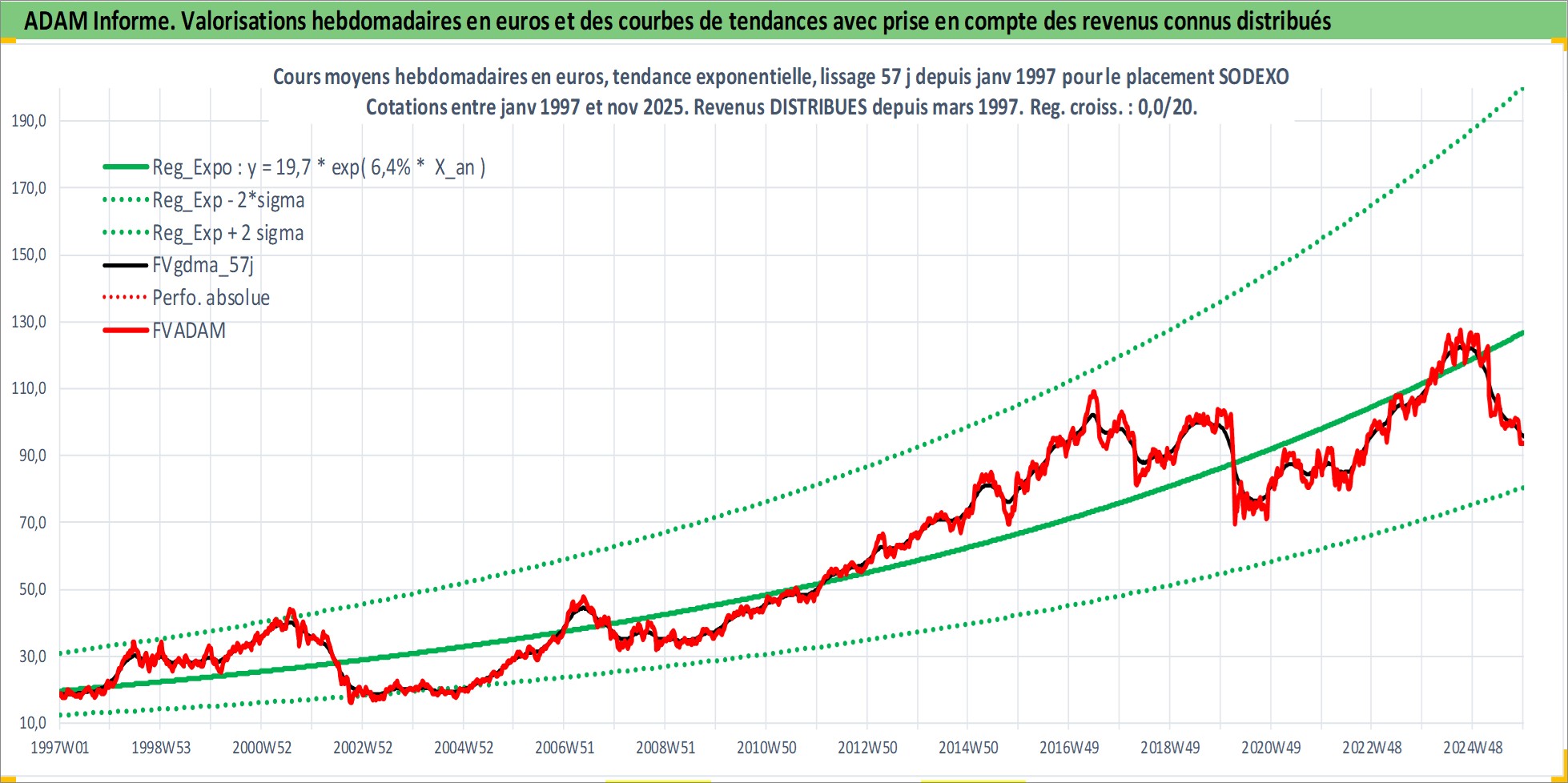 Site dédié aux investisseursPage dédiée sur site financeAnalyse des valorisations hebdomadaires de l'action SODEXO. Cet actif est cote en EUR. Les valorisations couvrent les semaines 1997W01 a 2025W48. Les revenus de cet actif financier sont pris en compte depuis la semaine 1997W10. La note globale ESG de cet actif est estimee a 9.0 (apres rebasage entre 0 et 20).