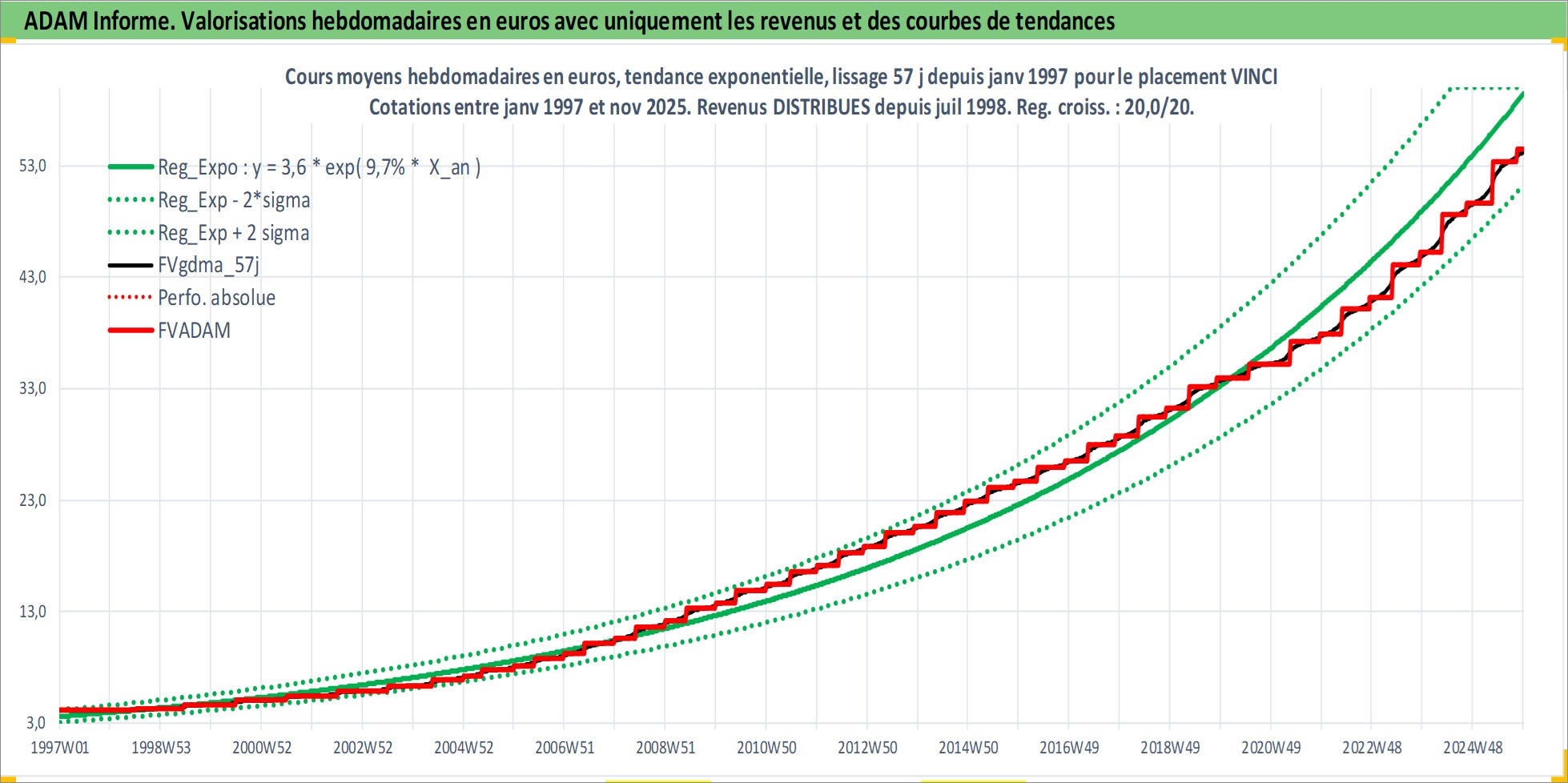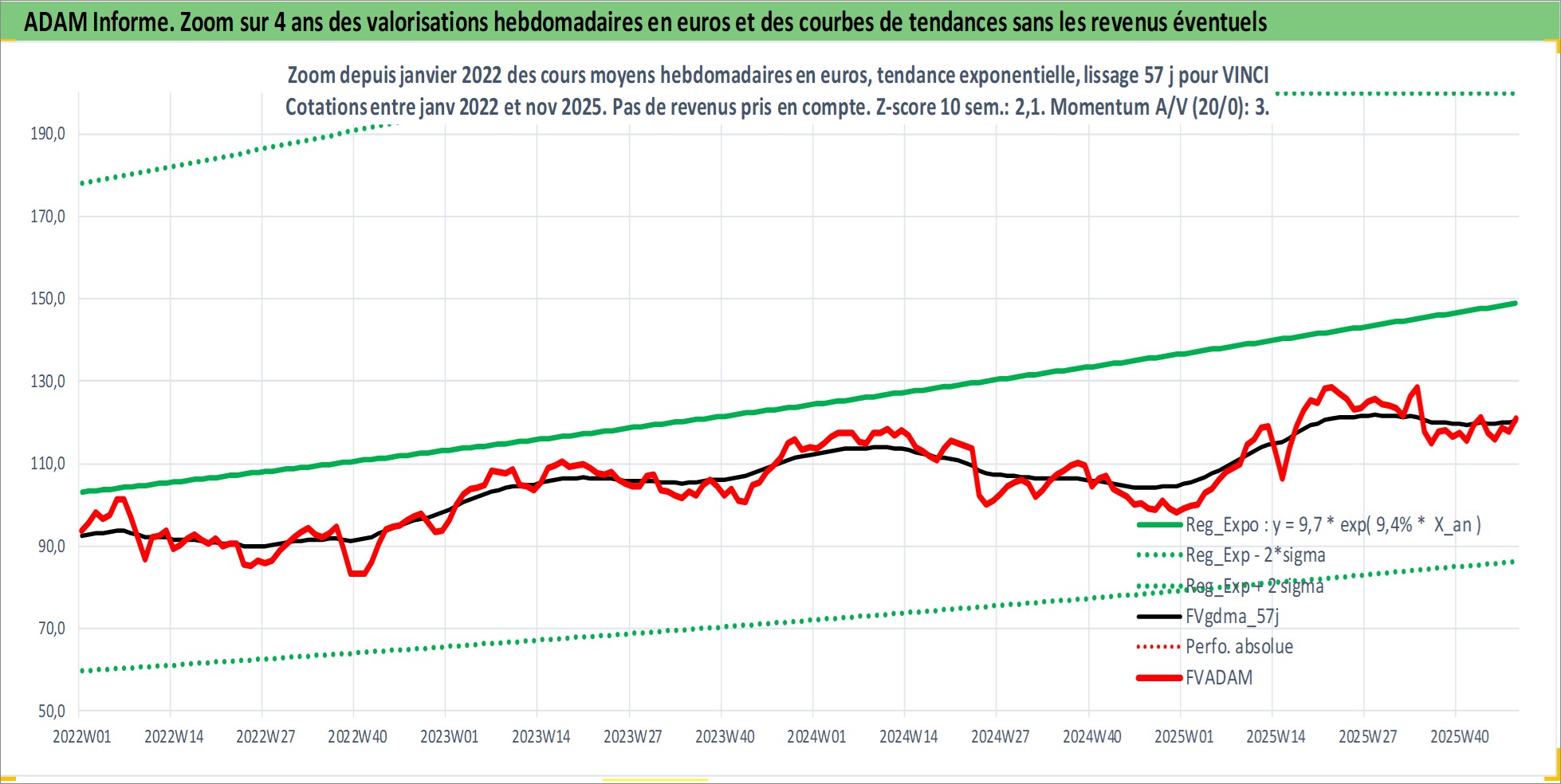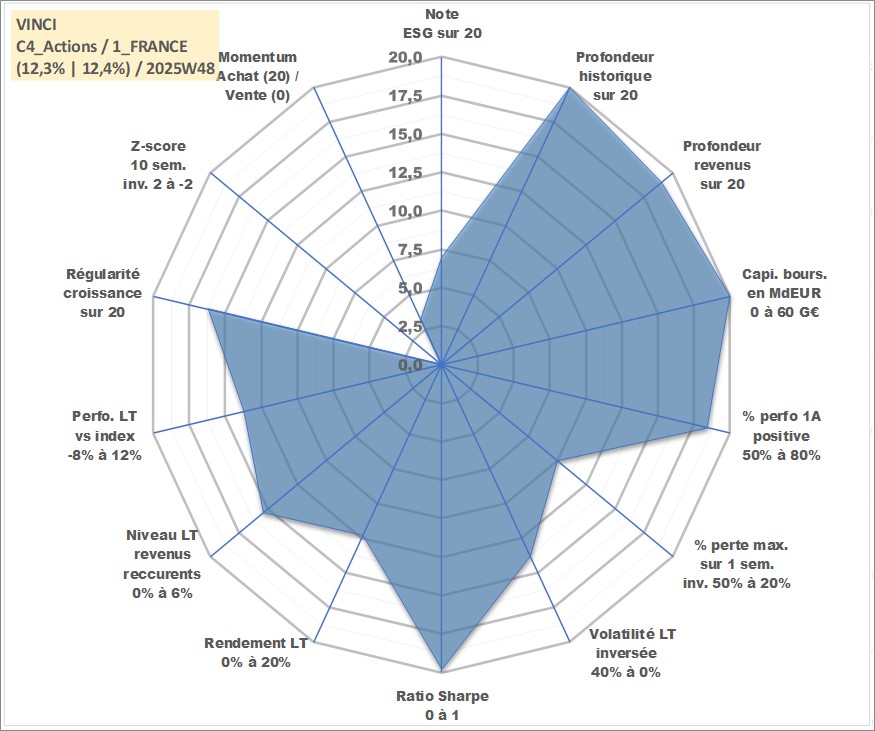 Site dédié aux investisseursPage dédiée sur site financeAnalyse des valorisations hebdomadaires de l'action VINCI. Cet actif est cote en EUR. Les valorisations couvrent les semaines 1997W01 a 2025W48. Les revenus de cet actif financier sont pris en compte depuis la semaine 1998W28. La note globale ESG de cet actif est estimee a 7.0 (apres rebasage entre 0 et 20).