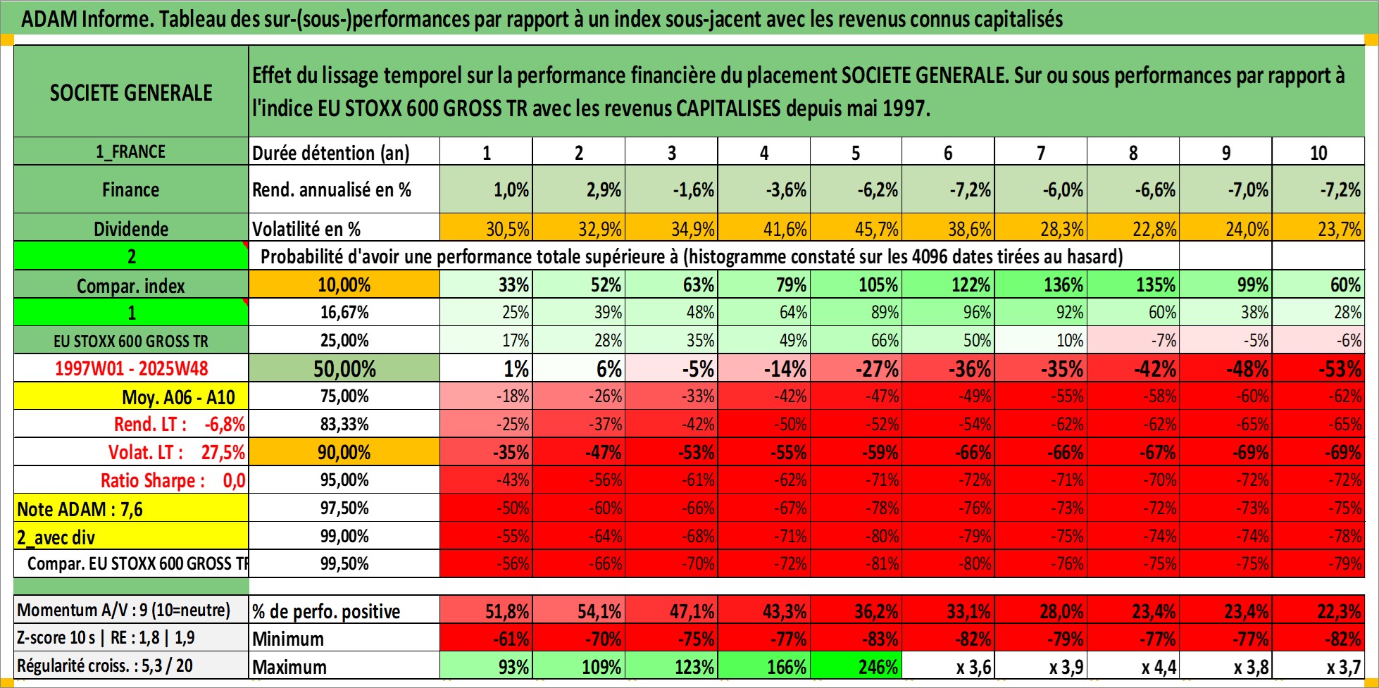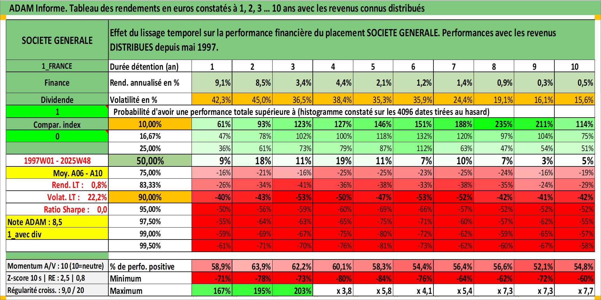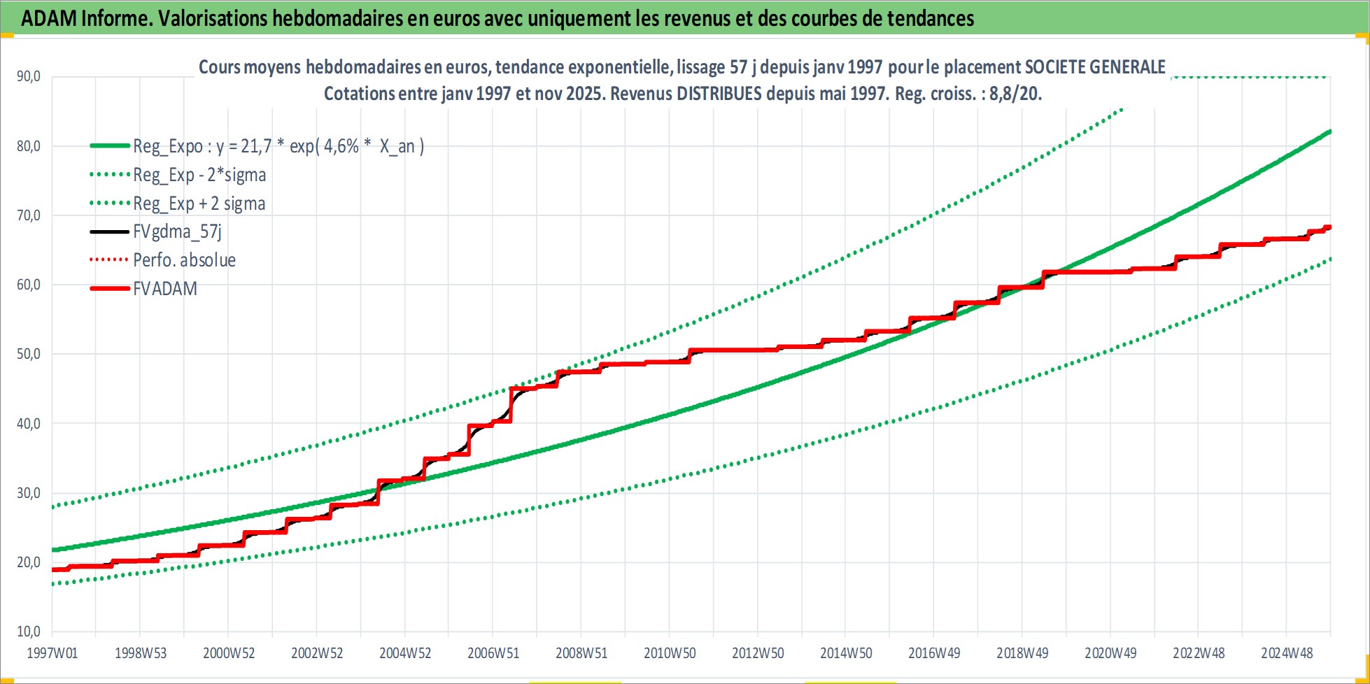 Site dédié aux investisseursPage dédiée sur site financeAnalyse des valorisations hebdomadaires de l'action SOCIETE GENERALE. Cet actif est cote en EUR. Les valorisations couvrent les semaines 1997W01 a 2025W48. Les revenus de cet actif financier sont pris en compte depuis la semaine 1997W21. La note globale ESG de cet actif est estimee a 10.0 (apres rebasage entre 0 et 20).