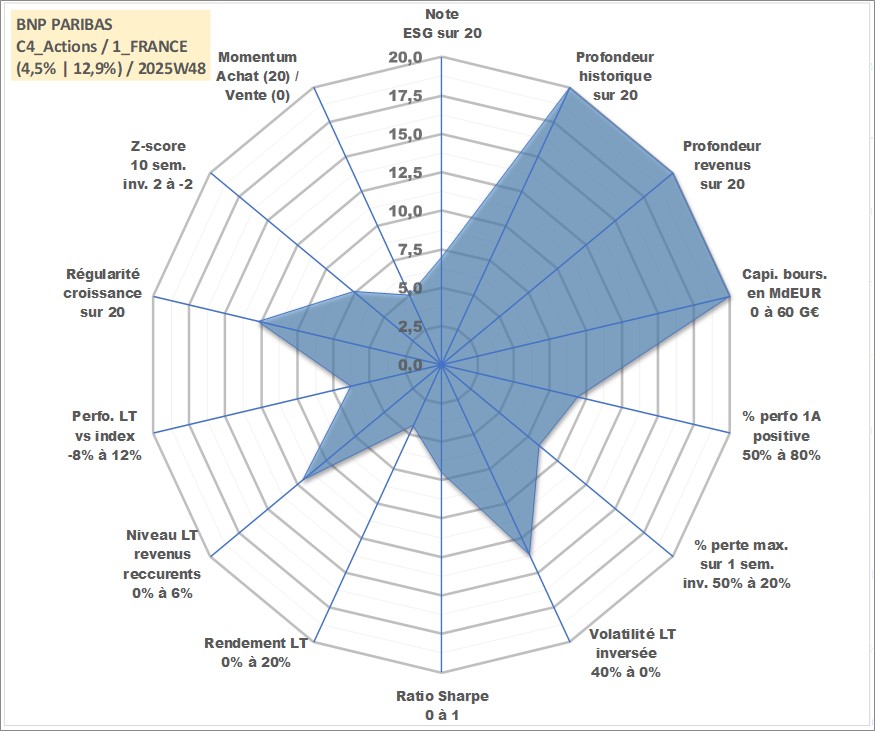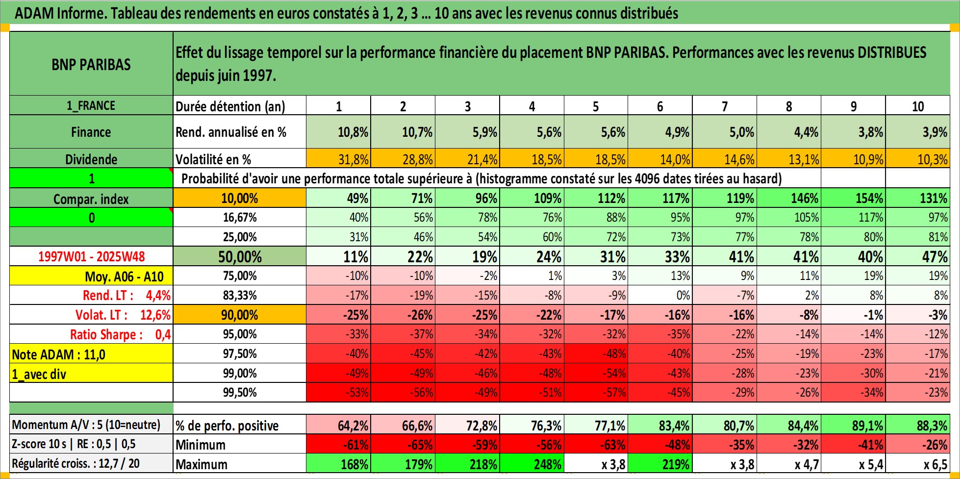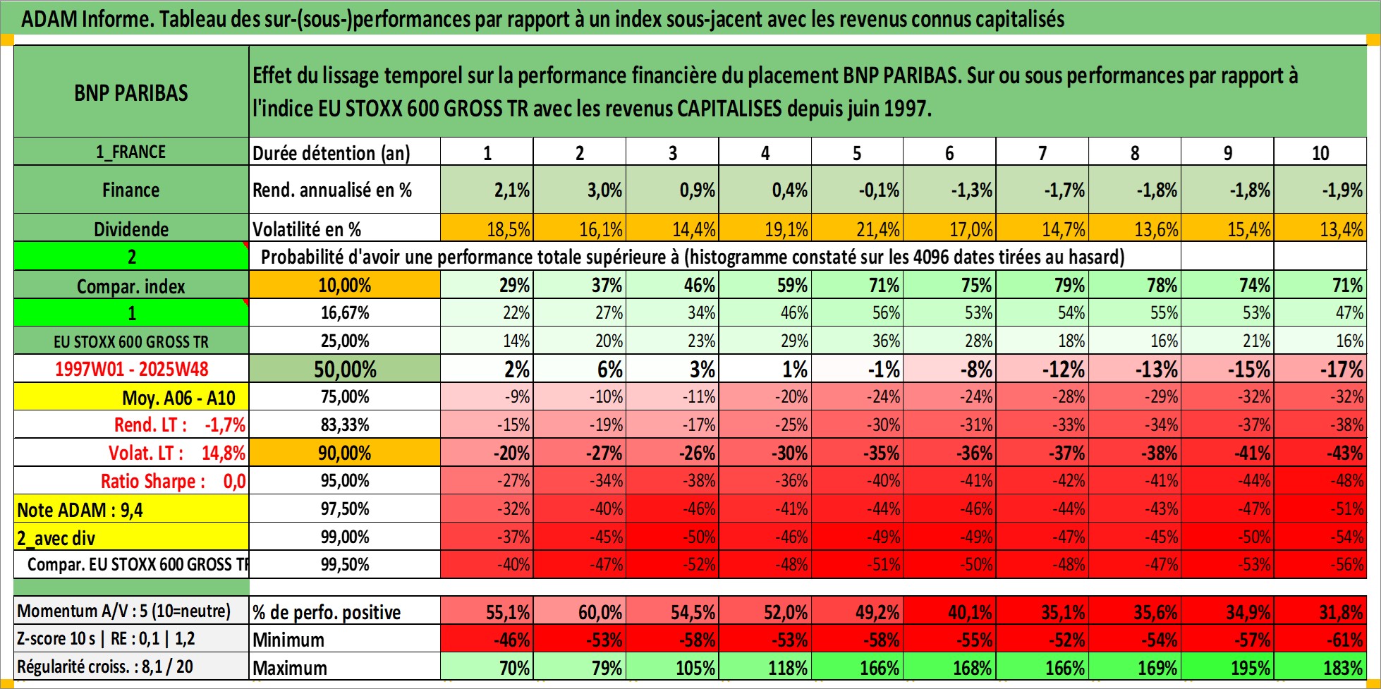 Site dédié aux investisseursPage dédiée sur site financeAnalyse des valorisations hebdomadaires de l'action BNP PARIBAS. Cet actif est cote en EUR. Les valorisations couvrent les semaines 1997W01 a 2025W48. Les revenus de cet actif financier sont pris en compte depuis la semaine 1997W24. La note globale ESG de cet actif est estimee a 7.0 (apres rebasage entre 0 et 20).