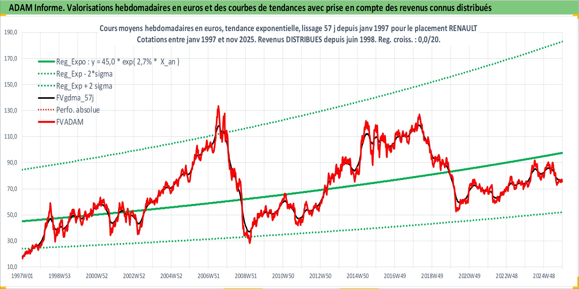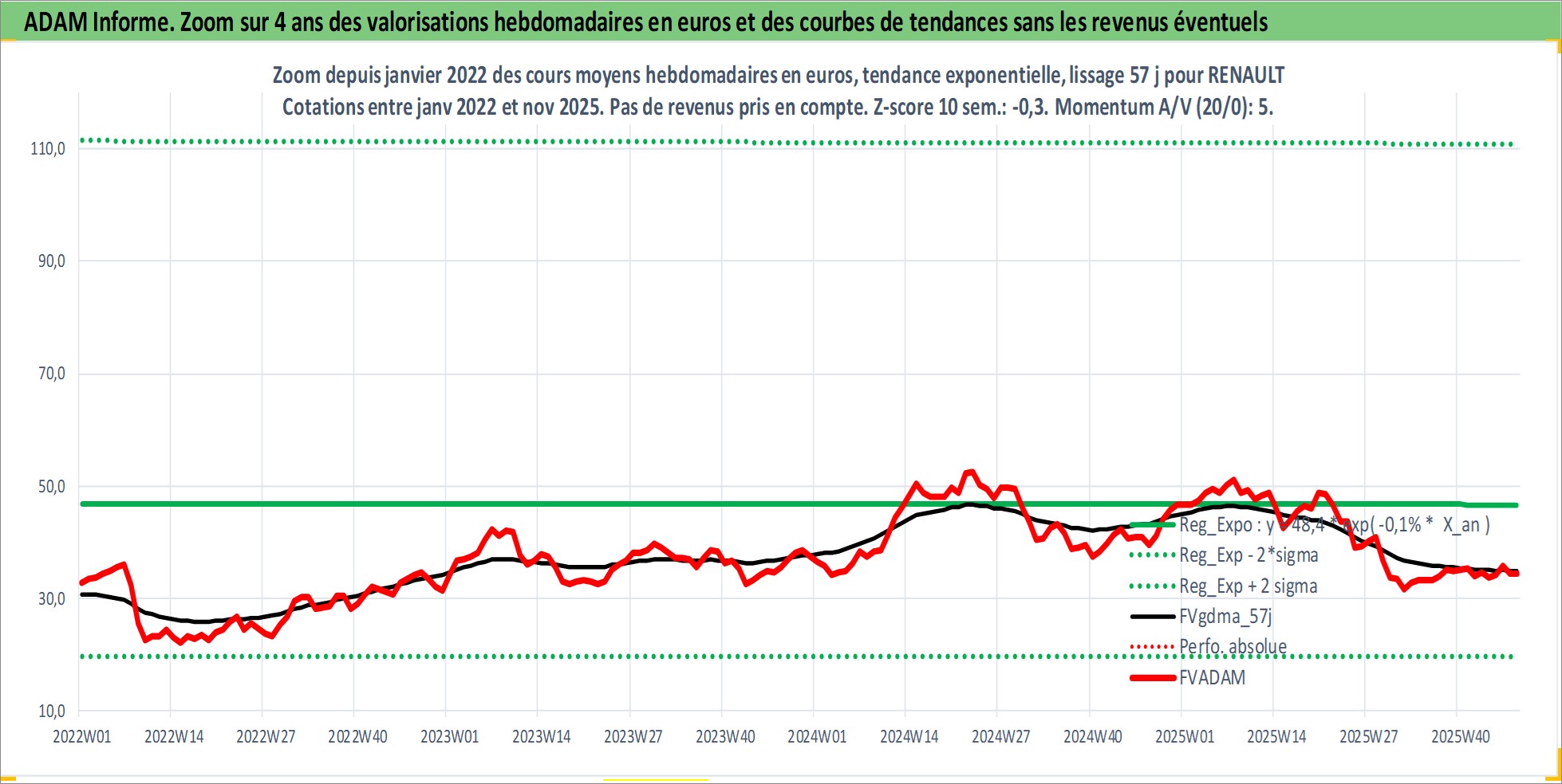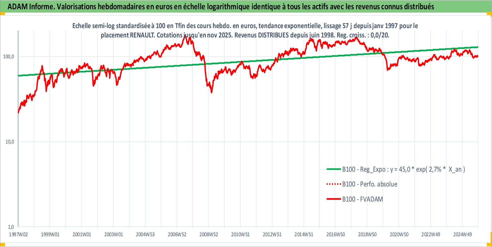 Site dédié aux investisseursPage dédiée sur site financeAnalyse des valorisations hebdomadaires de l'action RENAULT. Cet actif est cote en EUR. Les valorisations couvrent les semaines 1997W01 a 2025W48. Les revenus de cet actif financier sont pris en compte depuis la semaine 1998W27. La note globale ESG de cet actif est estimee a 9.0 (apres rebasage entre 0 et 20).