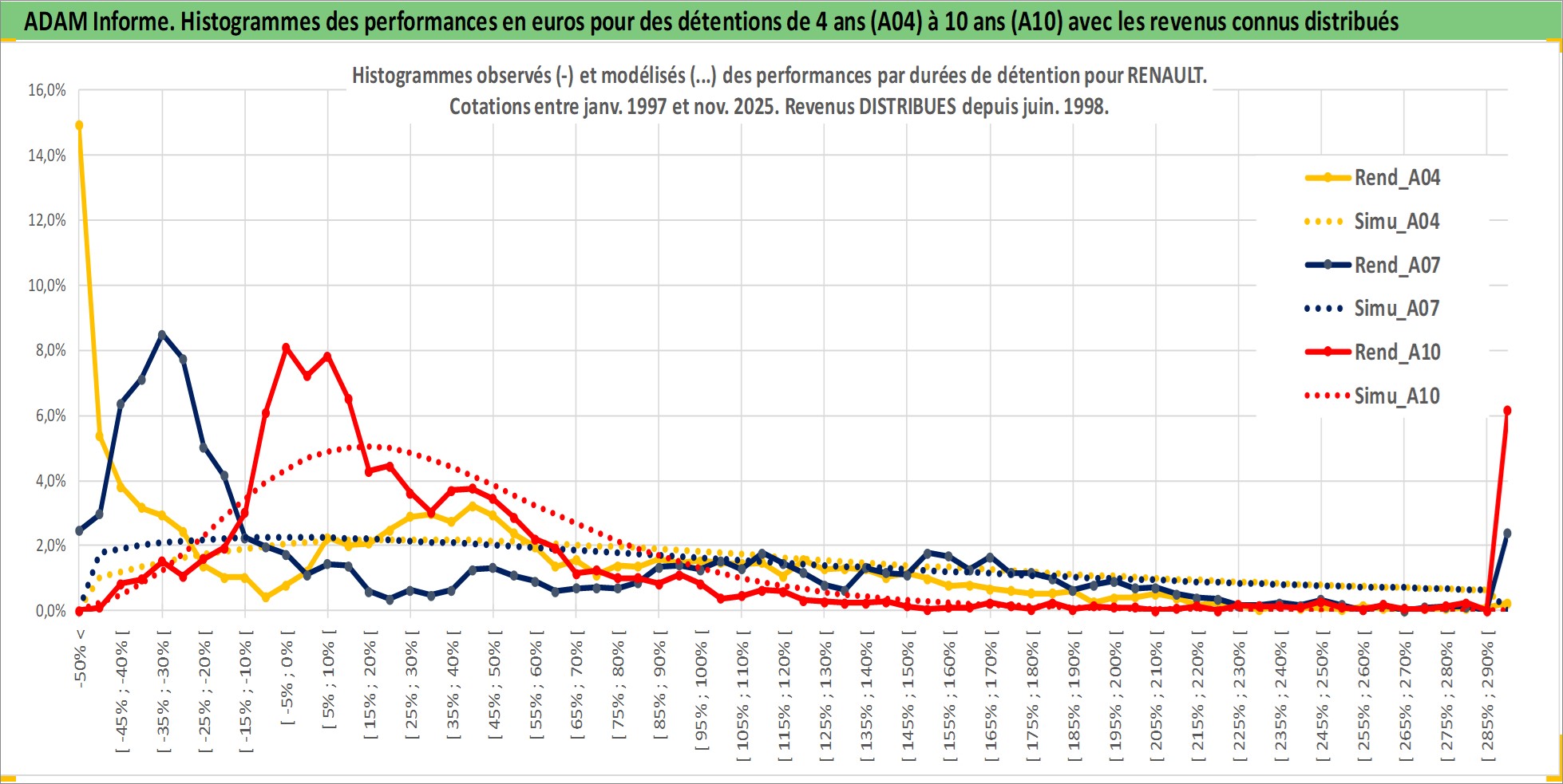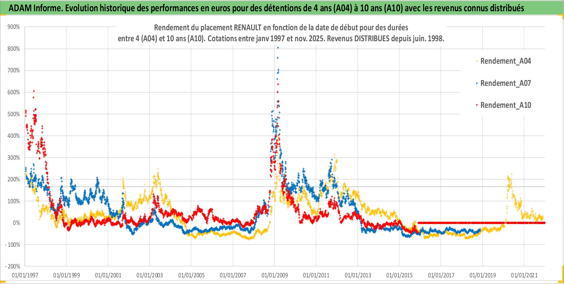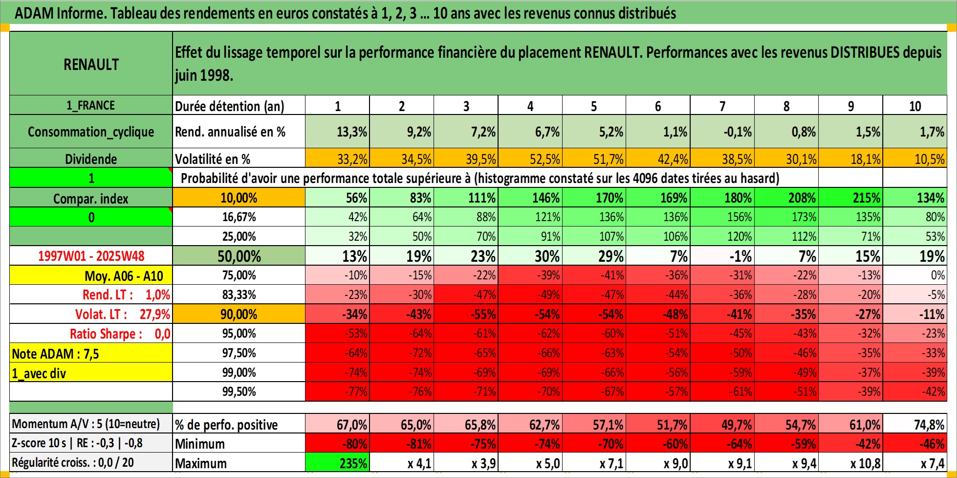 Site dédié aux investisseursPage dédiée sur site financeAnalyse des valorisations hebdomadaires de l'action RENAULT. Cet actif est cote en EUR. Les valorisations couvrent les semaines 1997W01 a 2025W48. Les revenus de cet actif financier sont pris en compte depuis la semaine 1998W27. La note globale ESG de cet actif est estimee a 9.0 (apres rebasage entre 0 et 20).