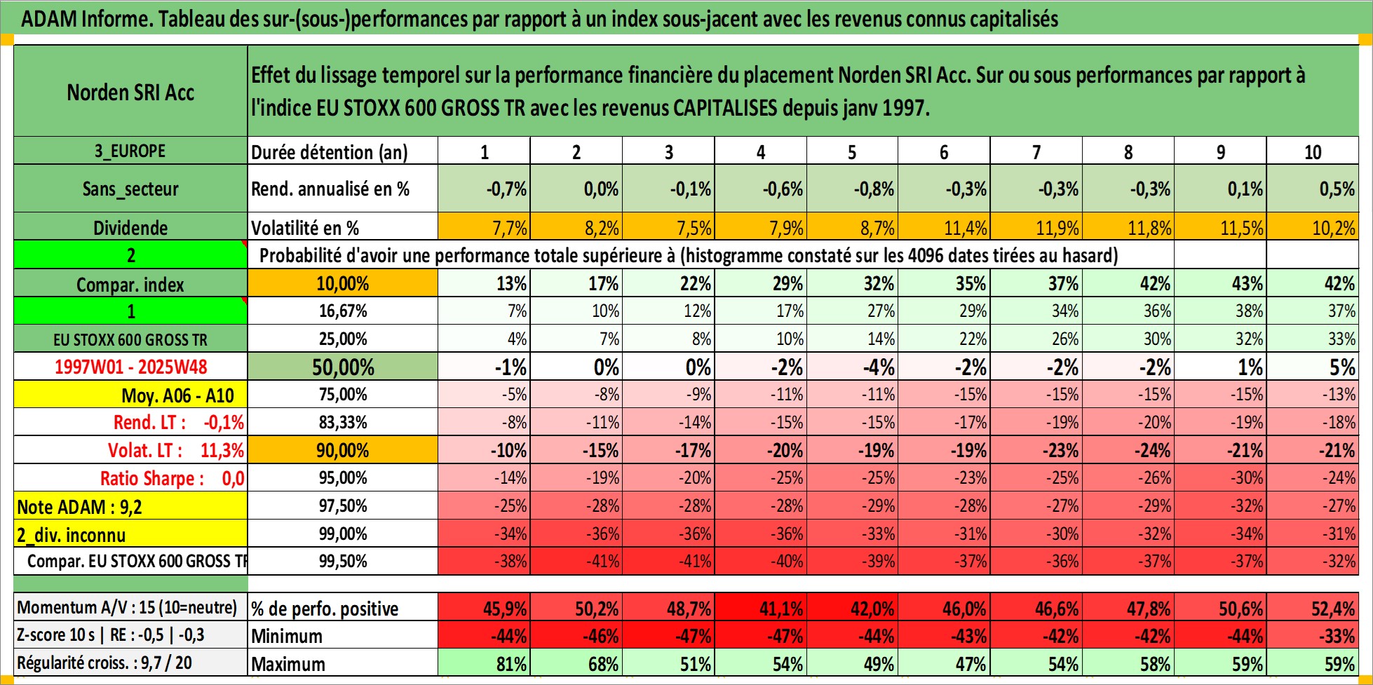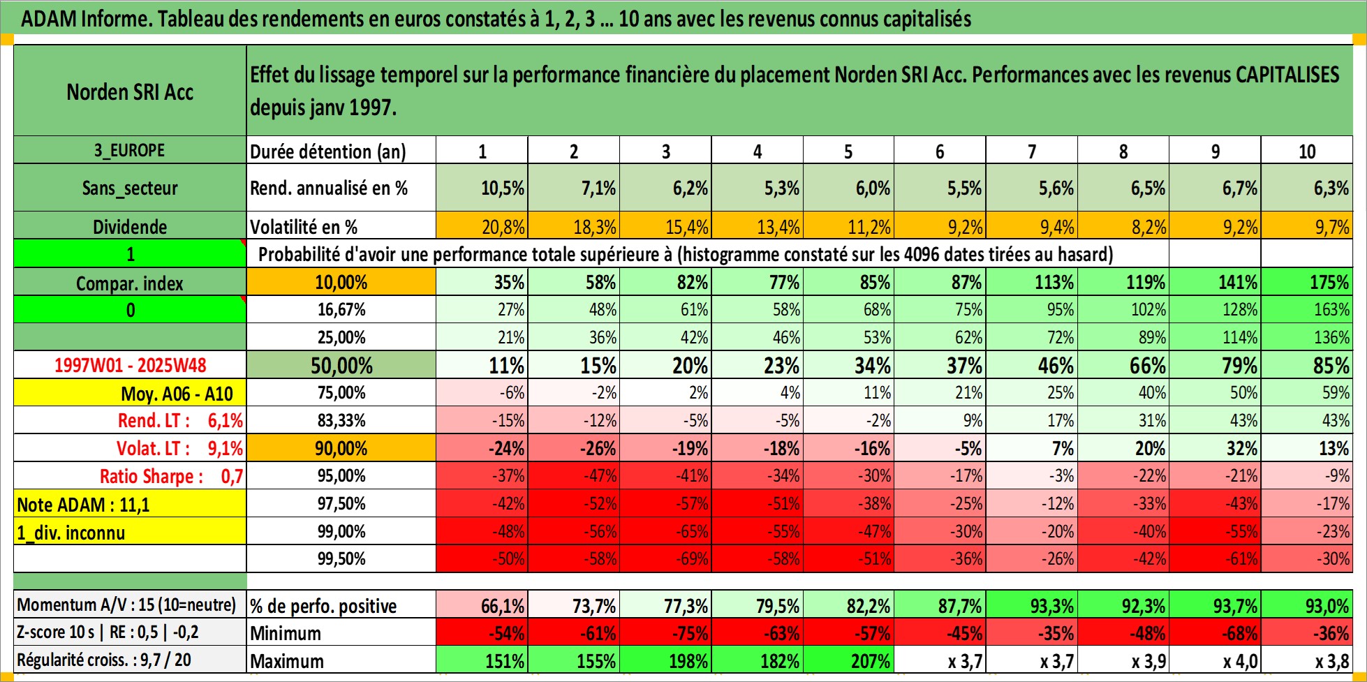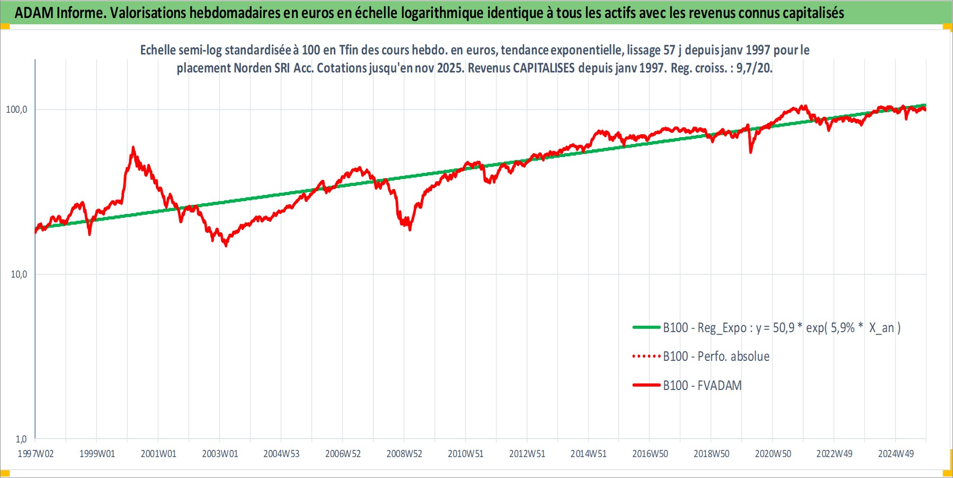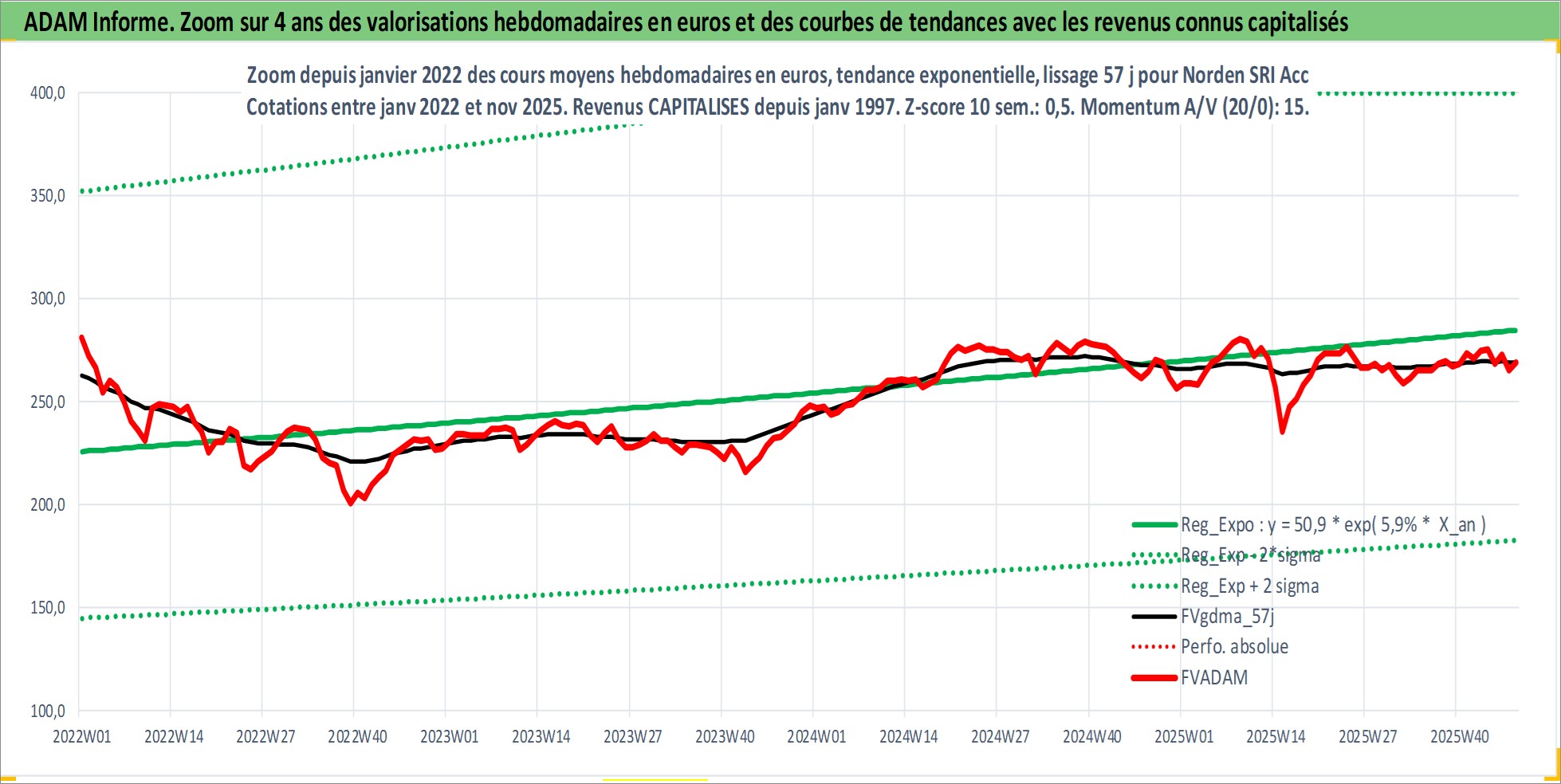 Site dédié aux investisseursPage dédiée sur site financeAnalyse des valorisations hebdomadaires du fonds Norden SRI Acc. Cet actif est cote en EUR. Les valorisations couvrent les semaines 1997W01 a 2025W48. Les revenus de cet actif financier sont pris en compte depuis la semaine 1997W01. La note globale ESG de cet actif est estimee a 10.0 (apres rebasage entre 0 et 20).