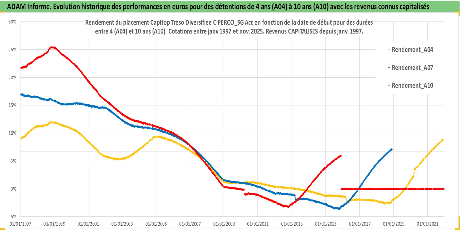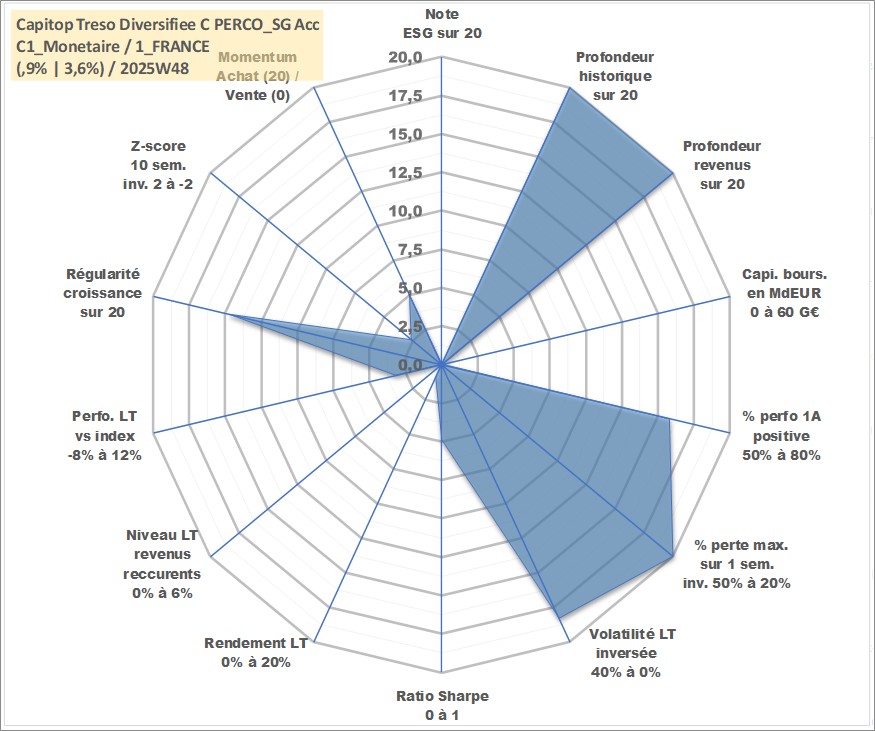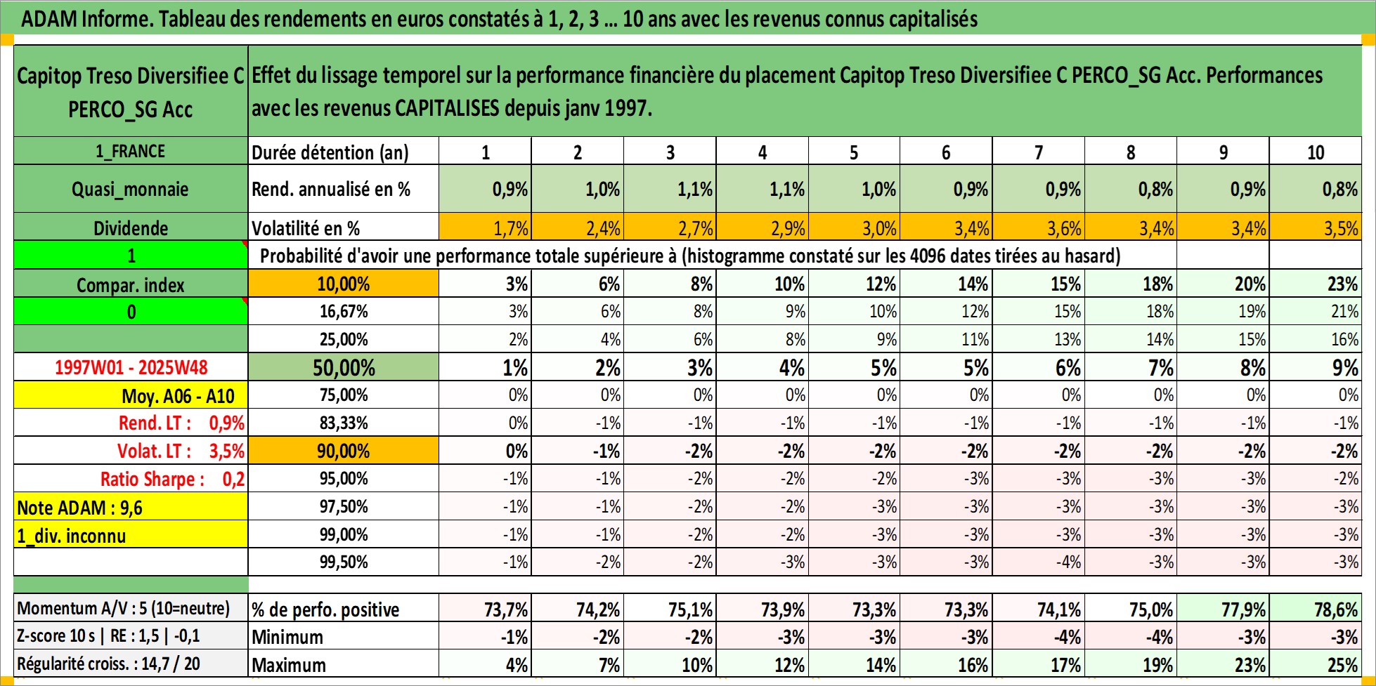 Site dédié aux investisseursPage dédiée sur site financeAnalyse des valorisations hebdomadaires du fonds Capitop Treso Diversifiee C PERCO_SG Acc. Cet actif est cote en EUR. Les valorisations couvrent les semaines 1997W01 a 2025W48. Les revenus de cet actif financier sont pris en compte depuis la semaine 1997W01. La note ESG de cet actif n'est pas connue.