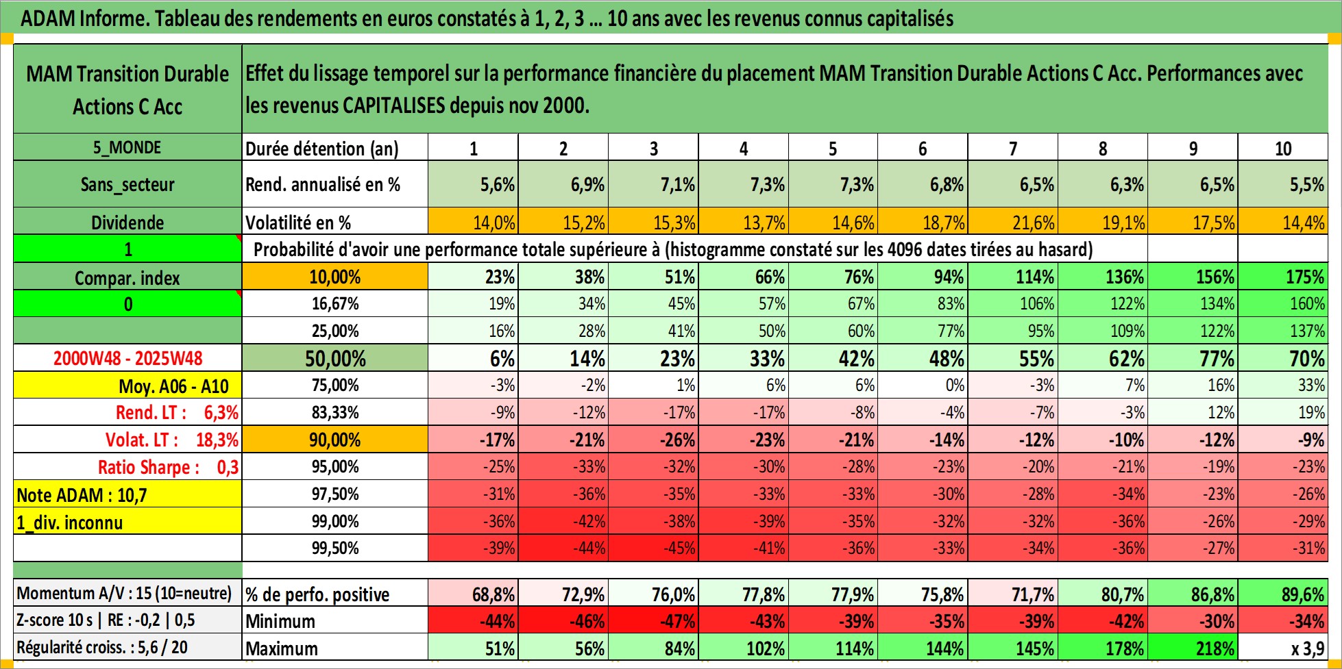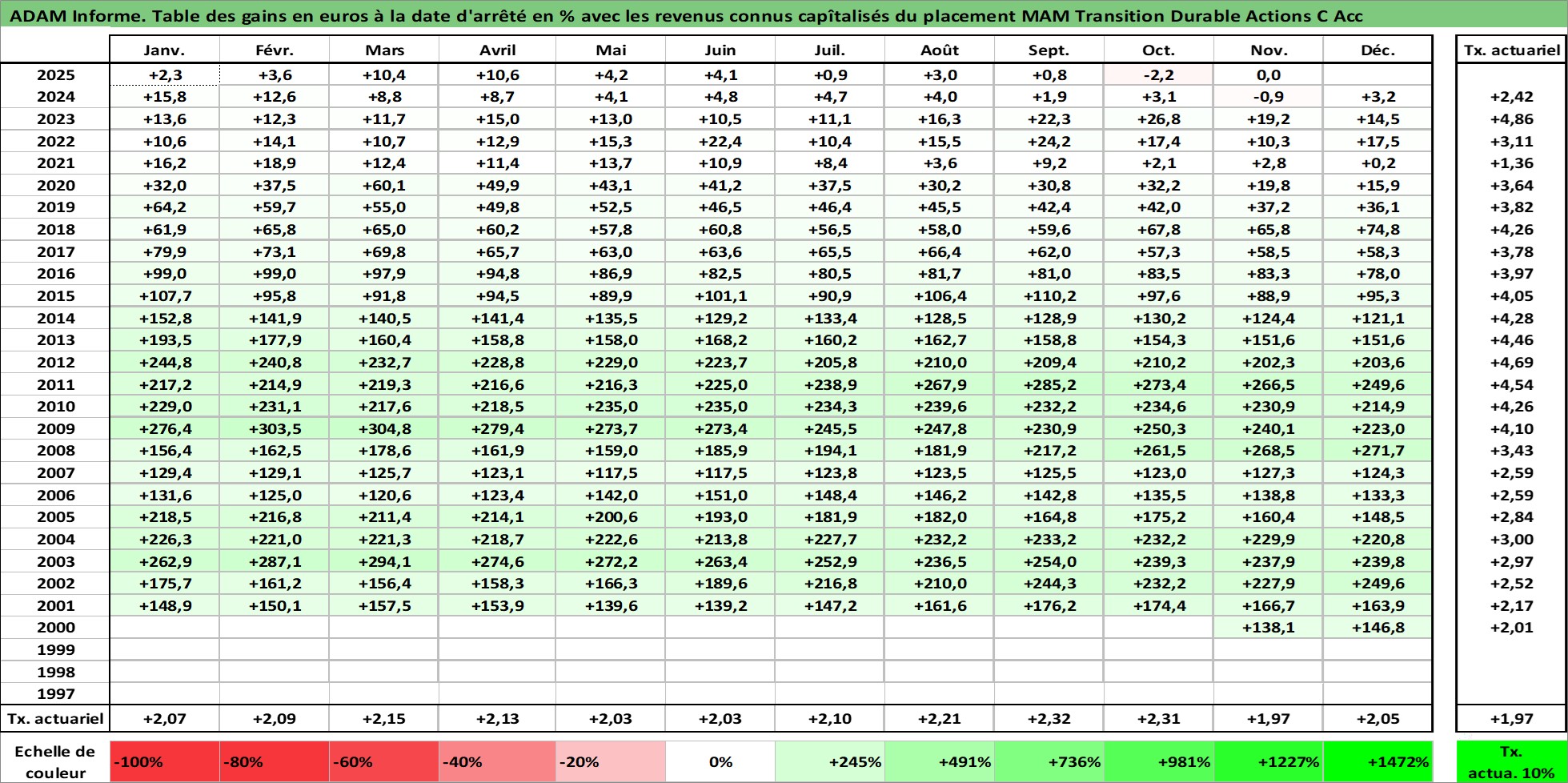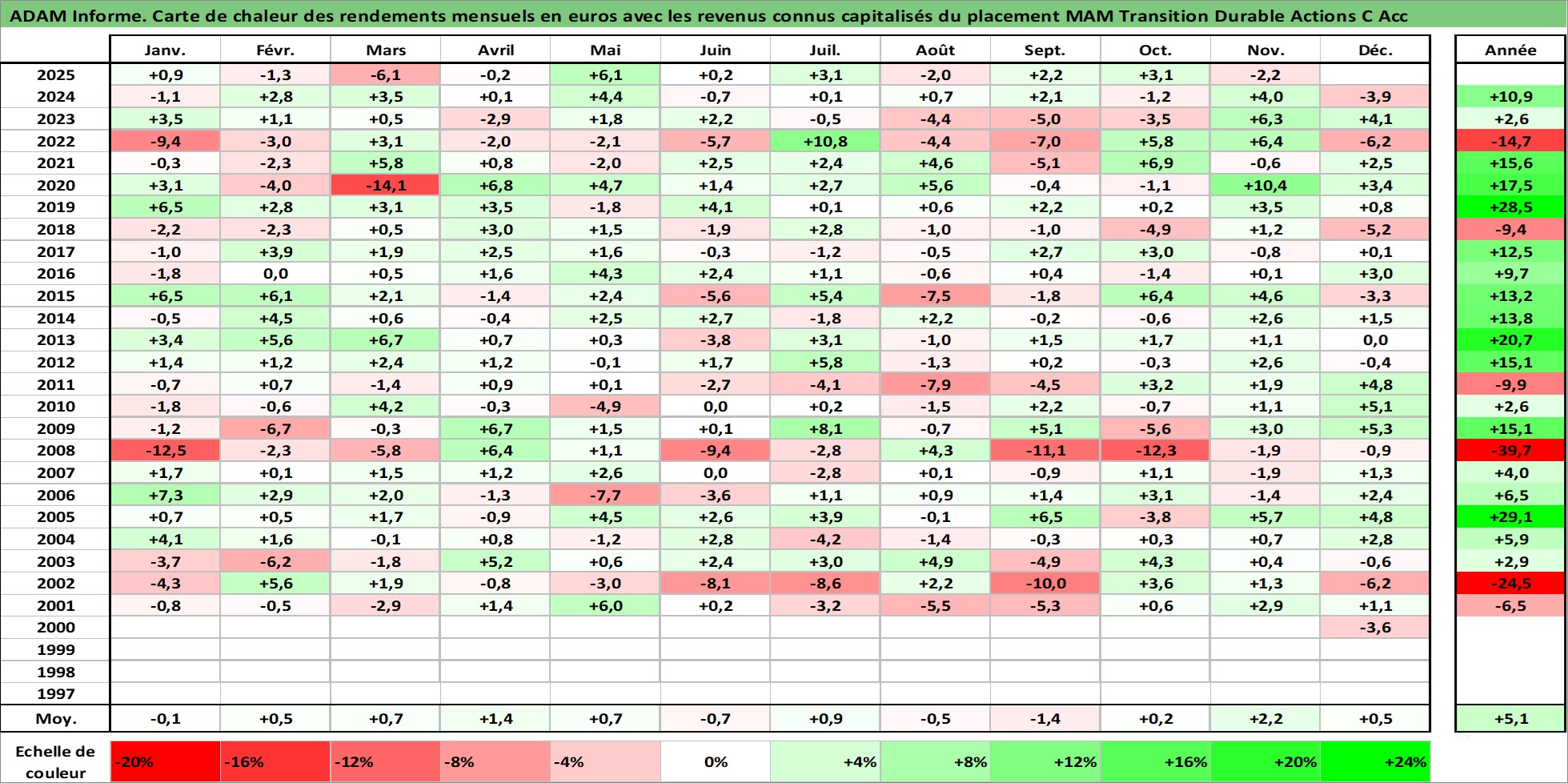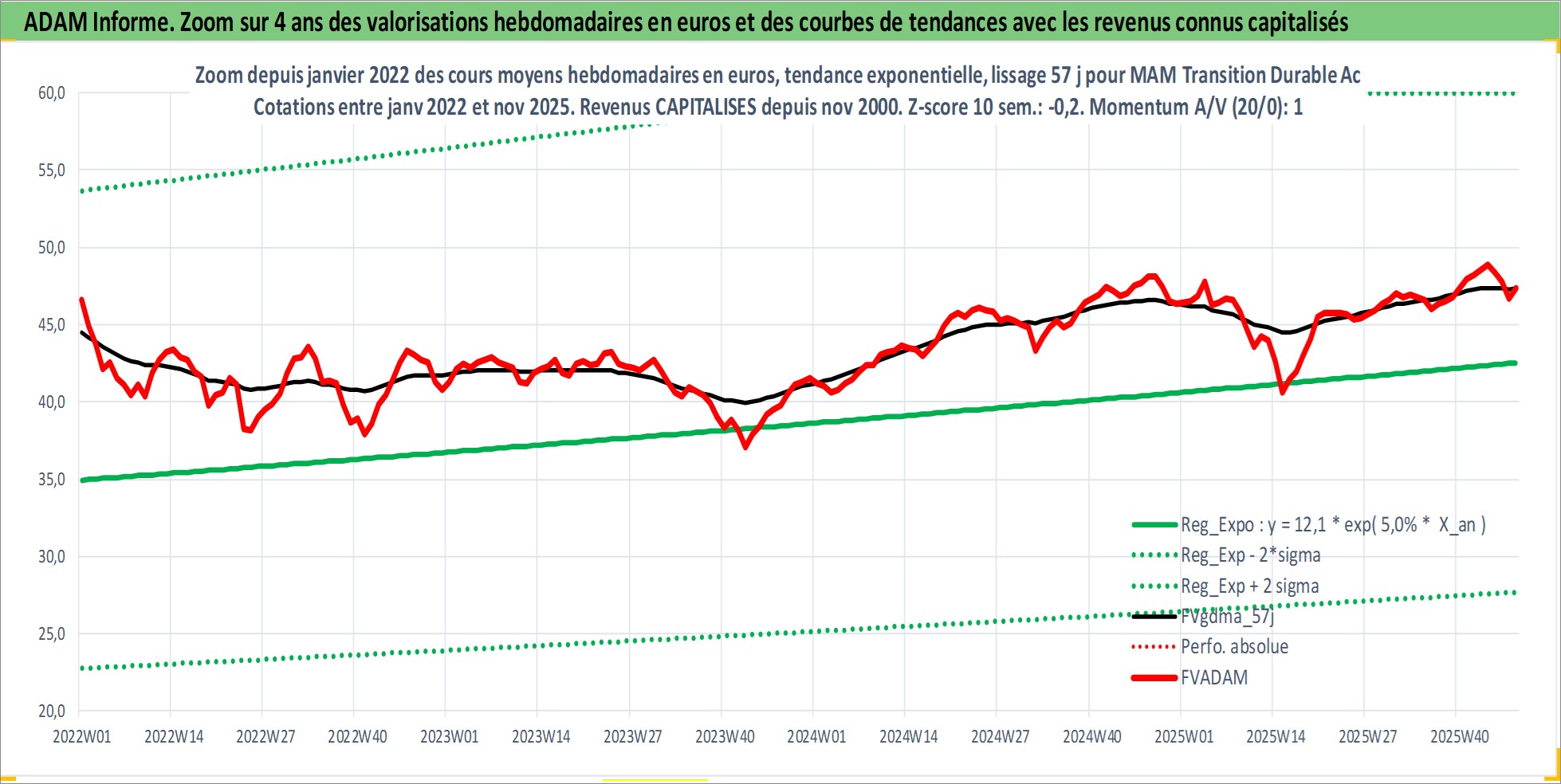 Site dédié aux investisseursPage dédiée sur site financeAnalyse des valorisations hebdomadaires du fonds MAM Transition Durable Actions C Acc. Cet actif est cote en EUR. Les valorisations couvrent les semaines 2000W48 a 2025W48. Les revenus de cet actif financier sont pris en compte depuis la semaine 2000W48. La note globale ESG de cet actif est estimee a 9.0 (apres rebasage entre 0 et 20).