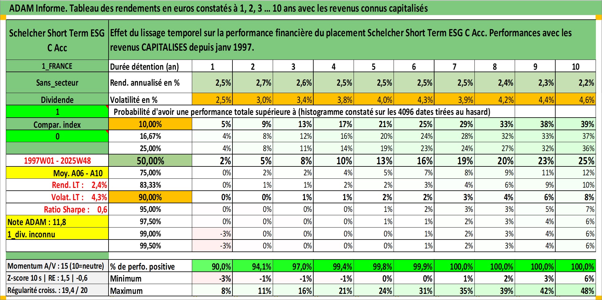 Site dédié aux investisseursPage dédiée sur site financeAnalyse des valorisations hebdomadaires du fonds Schelcher Short Term ESG C Acc. Cet actif est cote en EUR. Les valorisations couvrent les semaines 1997W01 a 2025W48. Les revenus de cet actif financier sont pris en compte depuis la semaine 1997W01. La note ESG de cet actif n'est pas connue.
