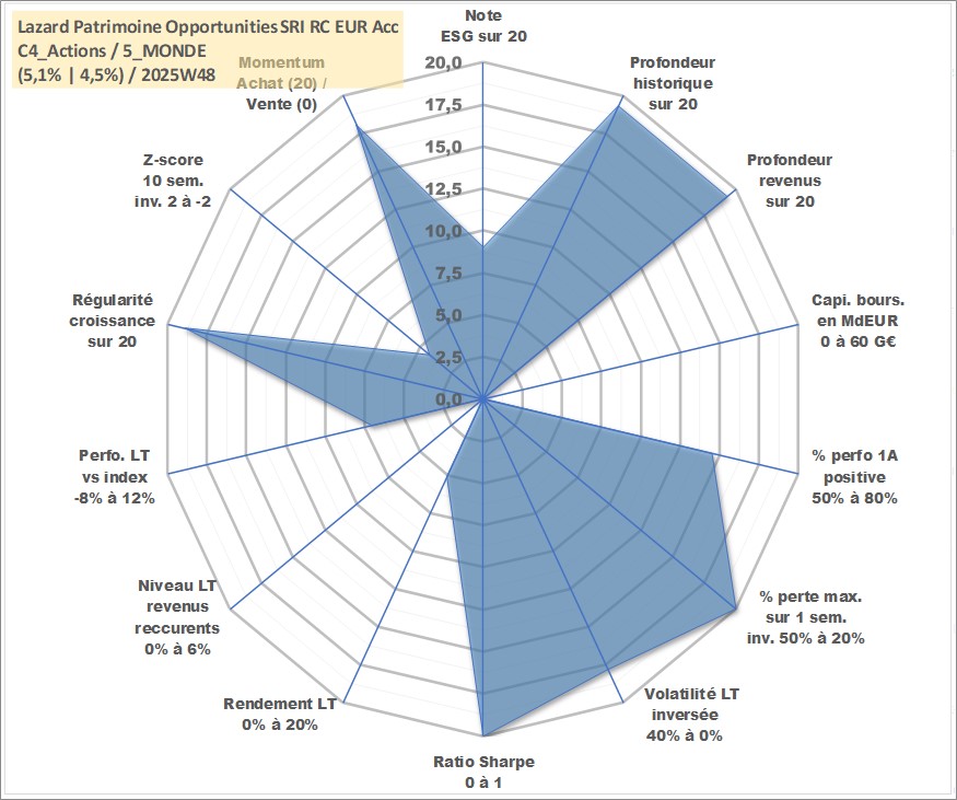 Site dédié aux investisseursPage dédiée sur site financeAnalyse des valorisations hebdomadaires du fonds Lazard Patrimoine Opportunities SRI RC EUR Acc. Cet actif est cote en EUR. Les valorisations couvrent les semaines 1999W01 a 2025W48. Les revenus de cet actif financier sont pris en compte depuis la semaine 1999W01. La note globale ESG de cet actif est estimee a 9.0 (apres rebasage entre 0 et 20).