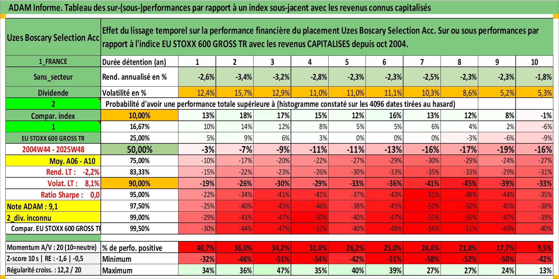 Site dédié aux investisseursPage dédiée sur site financeAnalyse des valorisations hebdomadaires du fonds Uzes Boscary Selection Acc. Cet actif est cote en EUR. Les valorisations couvrent les semaines 2004W44 a 2025W48. Les revenus de cet actif financier sont pris en compte depuis la semaine 2004W44. La note globale ESG de cet actif est estimee a 1.0 (apres rebasage entre 0 et 20).