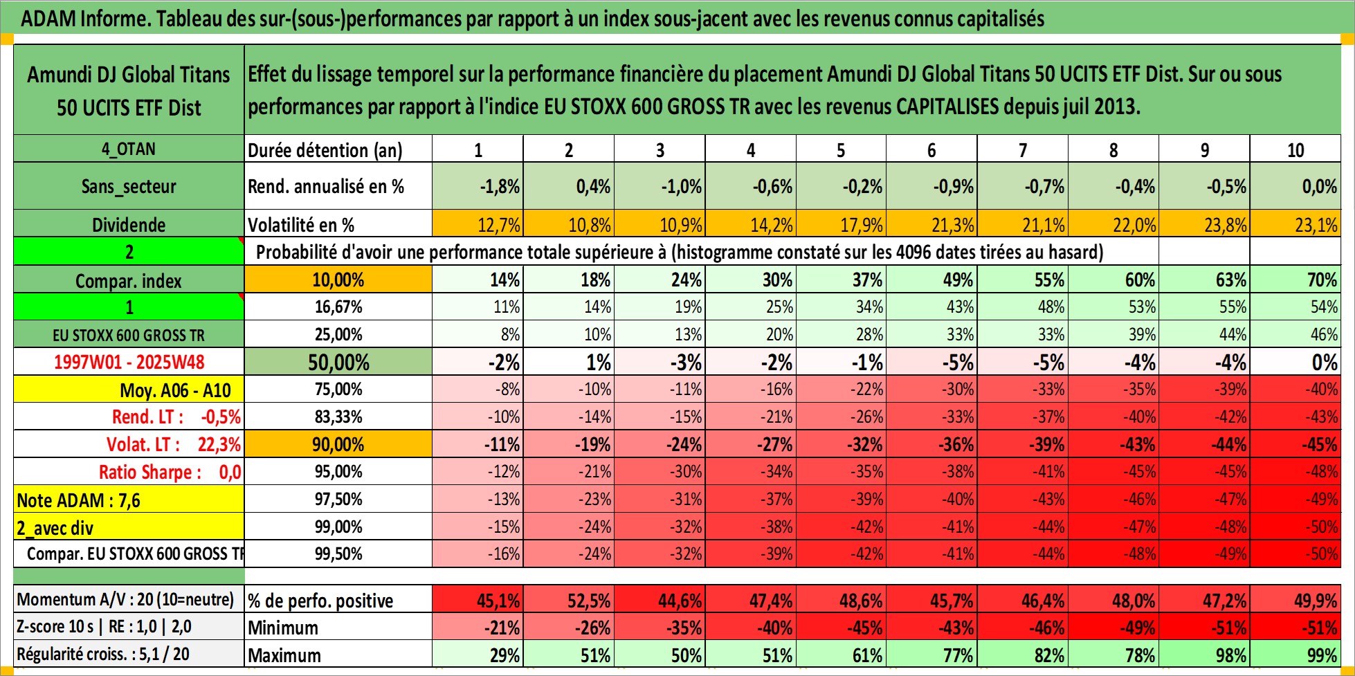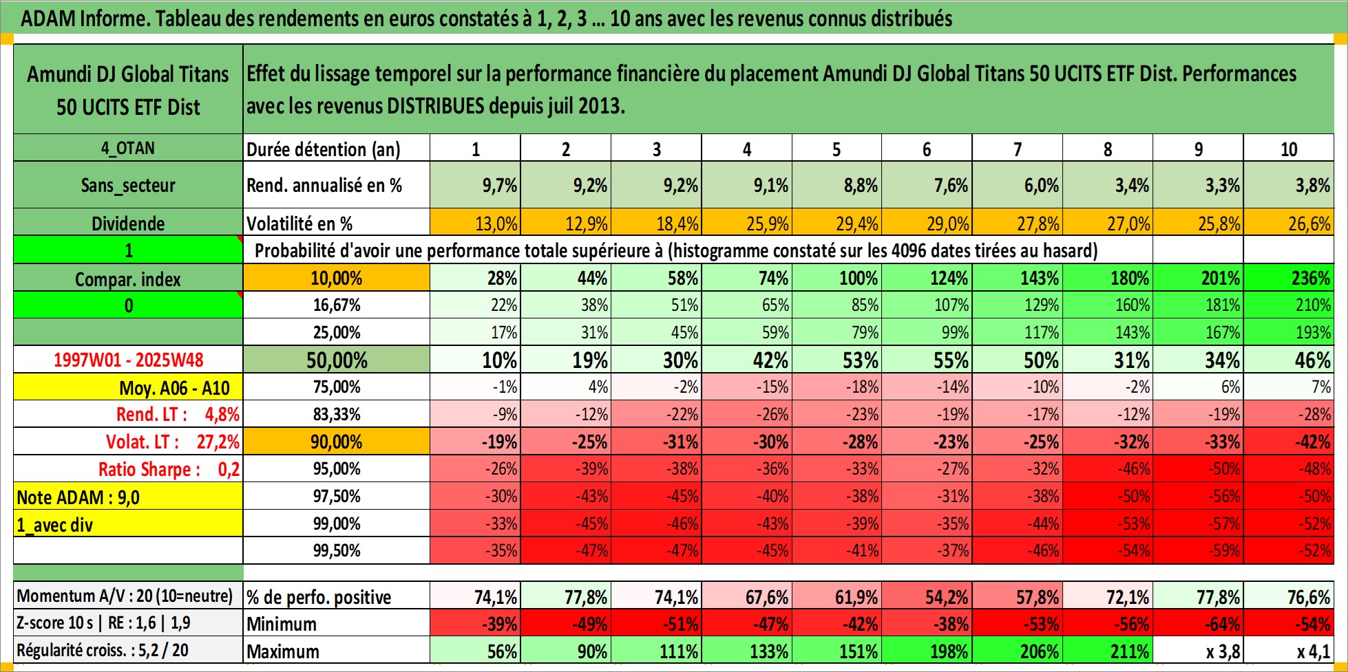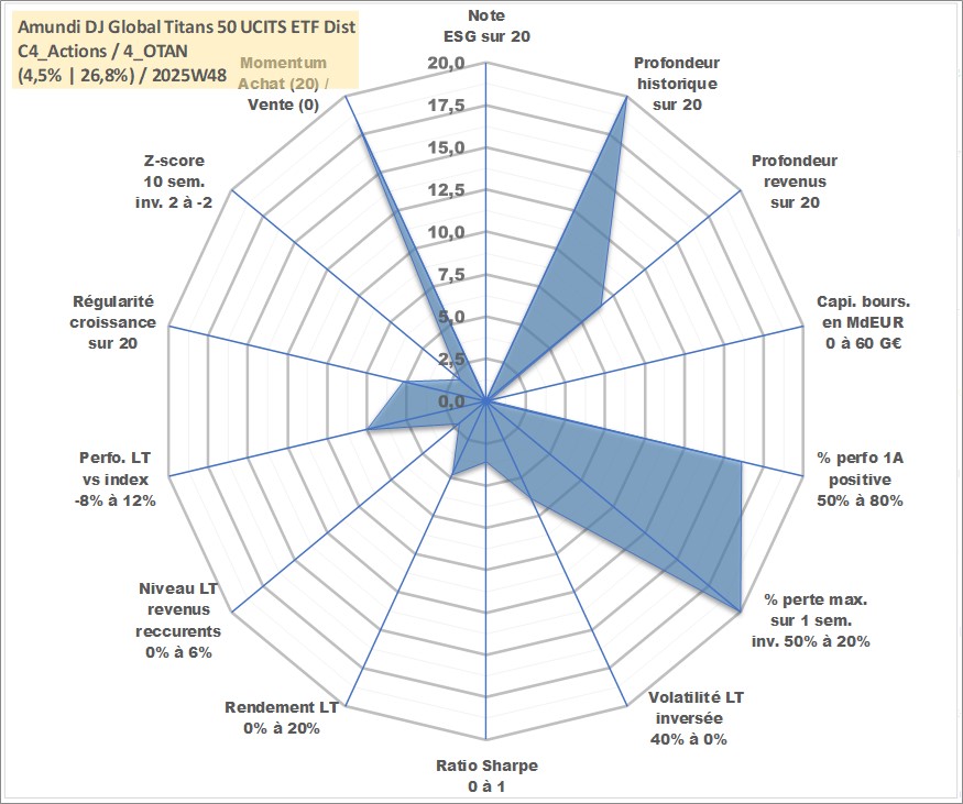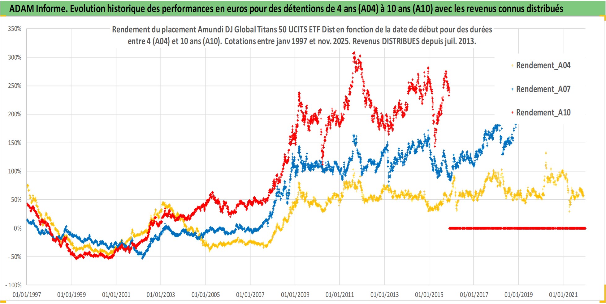 Site dédié aux investisseursPage dédiée sur site financeAnalyse des valorisations hebdomadaires du fonds Amundi DJ Global Titans 50 UCITS ETF Dist. Cet actif est cote en EUR. Les valorisations couvrent les semaines 1997W01 a 2025W48. Les revenus de cet actif financier sont pris en compte depuis la semaine 2013W28. La note ESG de cet actif n'est pas connue.