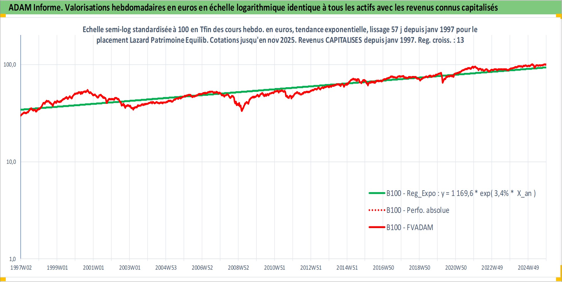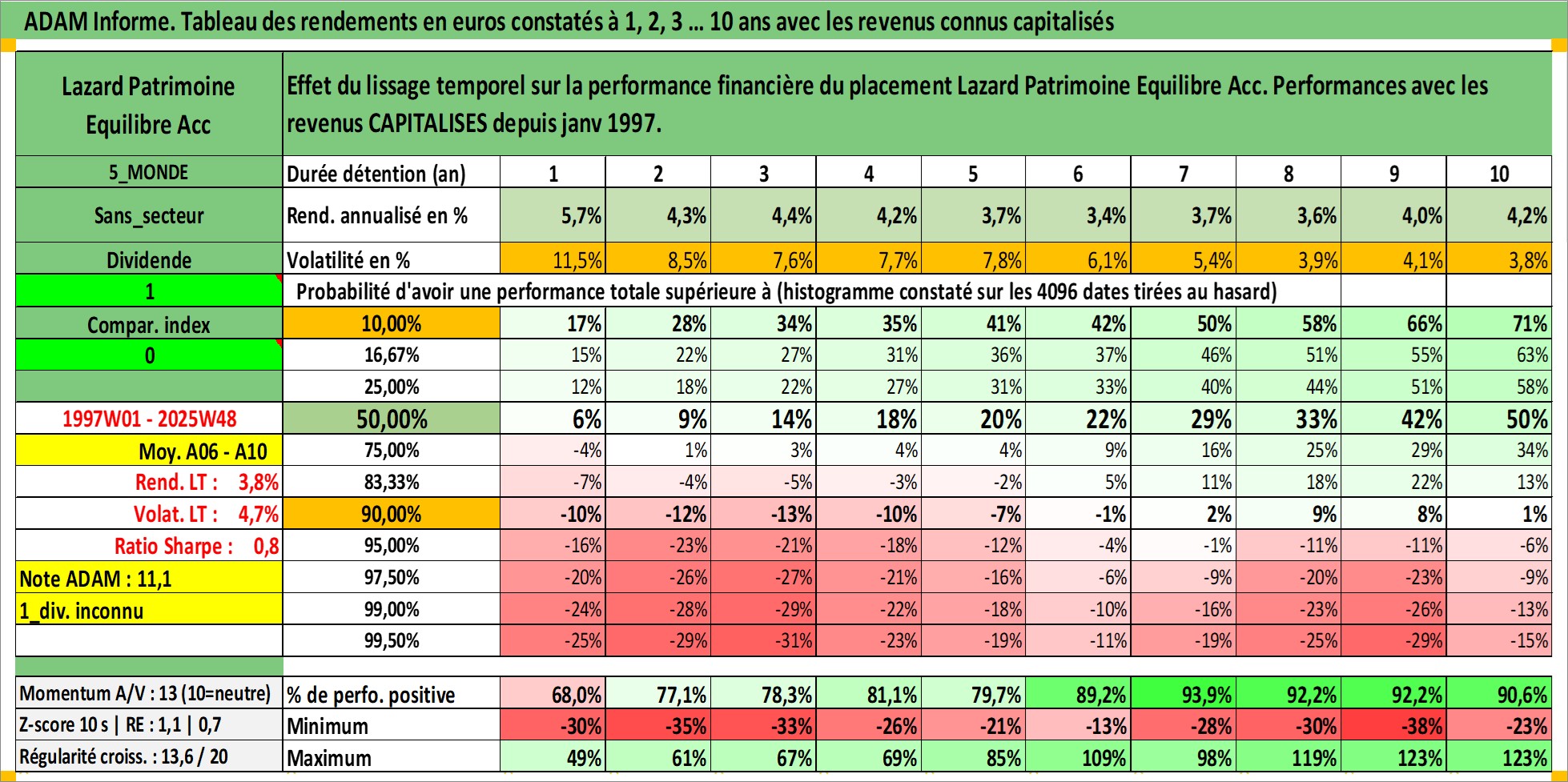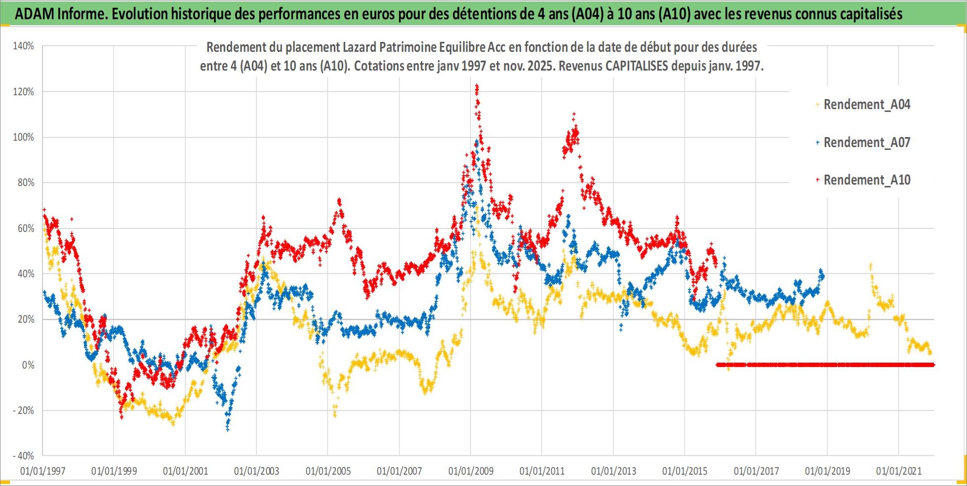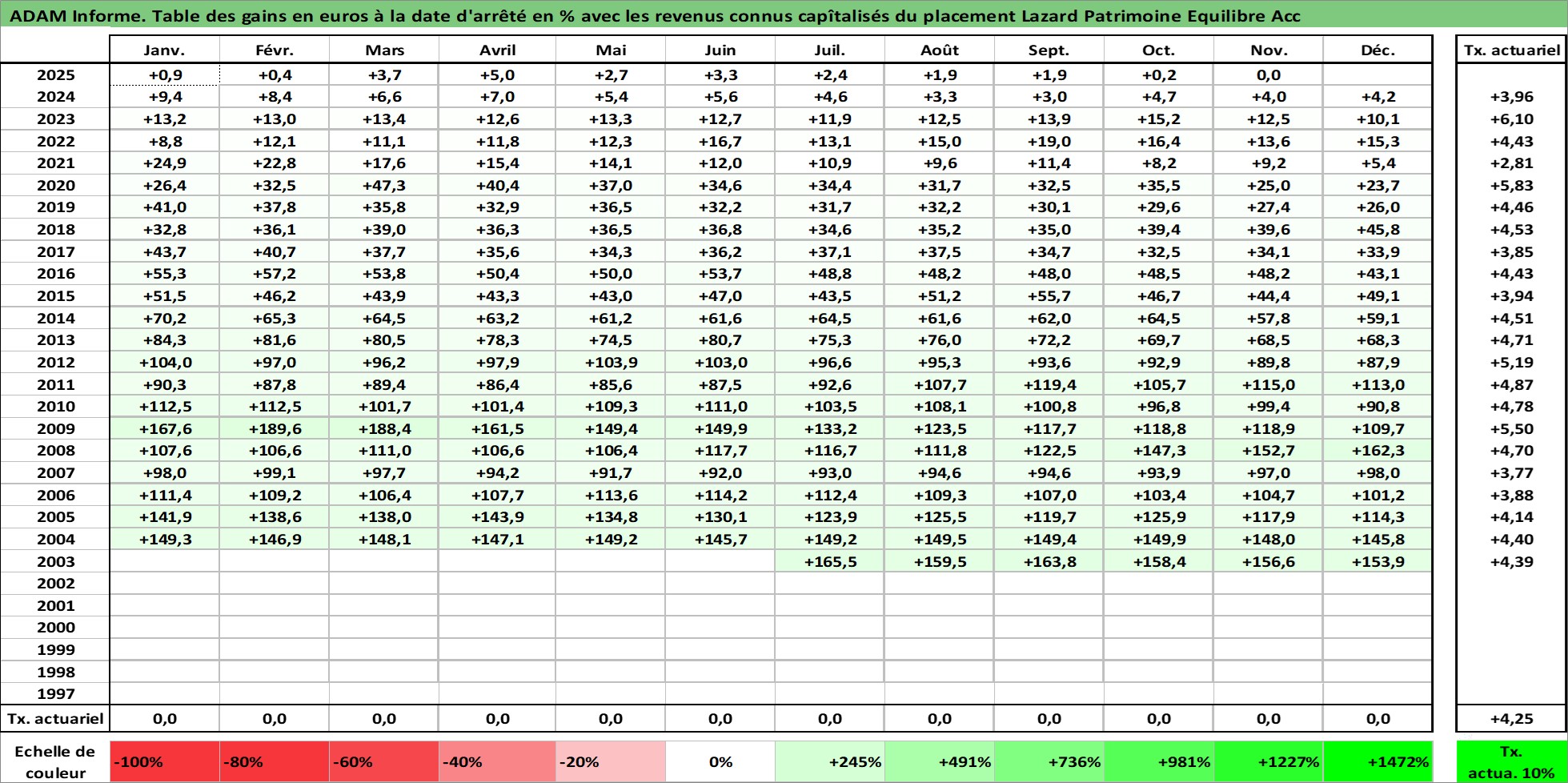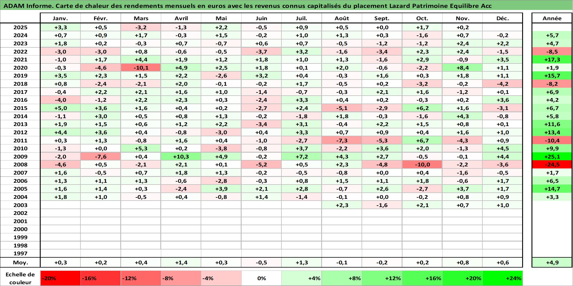 Site dédié aux investisseursPage dédiée sur site financeAnalyse des valorisations hebdomadaires du fonds Lazard Patrimoine Equilibre Acc. Cet actif est cote en EUR. Les valorisations couvrent les semaines 1997W01 a 2025W48. Les revenus de cet actif financier sont pris en compte depuis la semaine 1997W01. La note globale ESG de cet actif est estimee a 9.0 (apres rebasage entre 0 et 20).