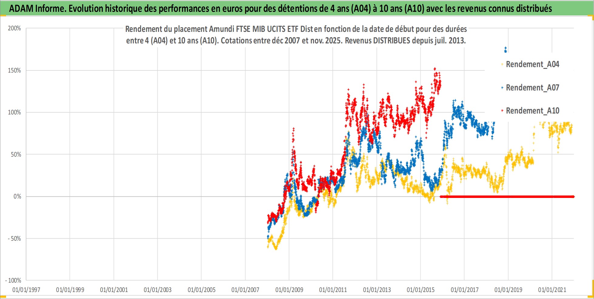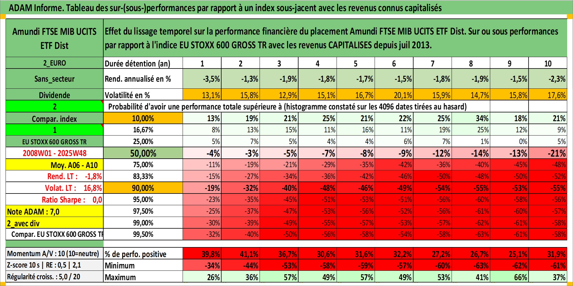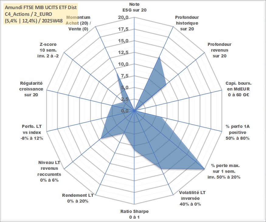 Site dédié aux investisseursPage dédiée sur site financeAnalyse des valorisations hebdomadaires du fonds Amundi FTSE MIB UCITS ETF Dist. Cet actif est cote en EUR. Les valorisations couvrent les semaines 2008W01 a 2025W48. Les revenus de cet actif financier sont pris en compte depuis la semaine 2013W28. La note ESG de cet actif n'est pas connue.