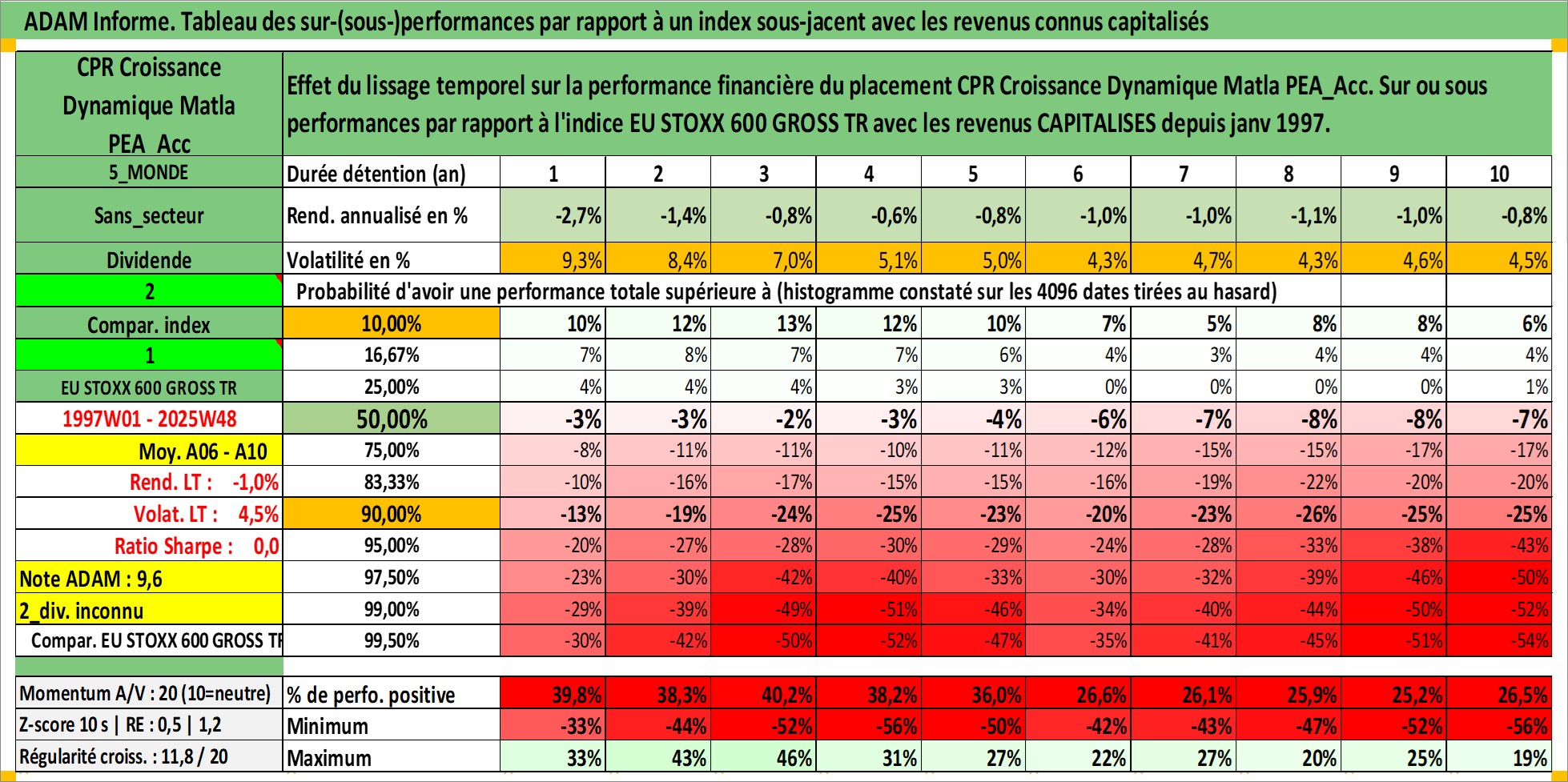 Site dédié aux investisseursPage dédiée sur site financeAnalyse des valorisations hebdomadaires du fonds CPR Croissance Dynamique Matla PEA_Acc. Cet actif est cote en EUR. Les valorisations couvrent les semaines 1997W01 a 2025W48. Les revenus de cet actif financier sont pris en compte depuis la semaine 1997W01. La note ESG de cet actif n'est pas connue.