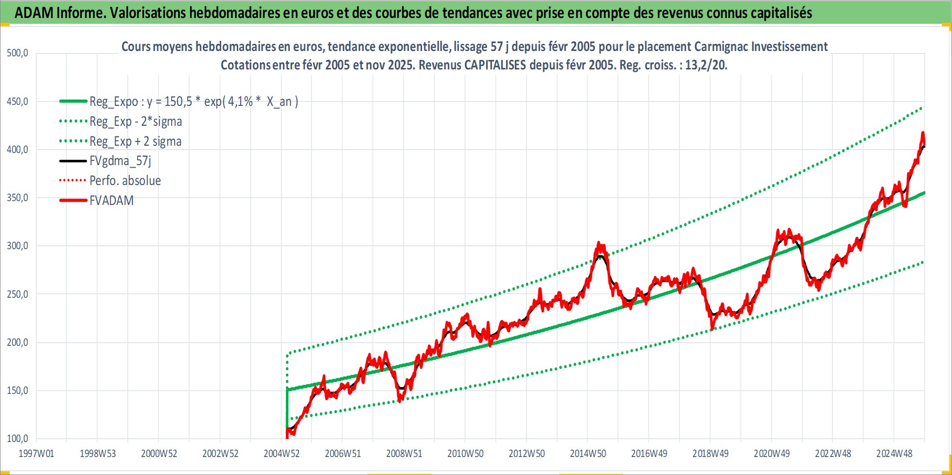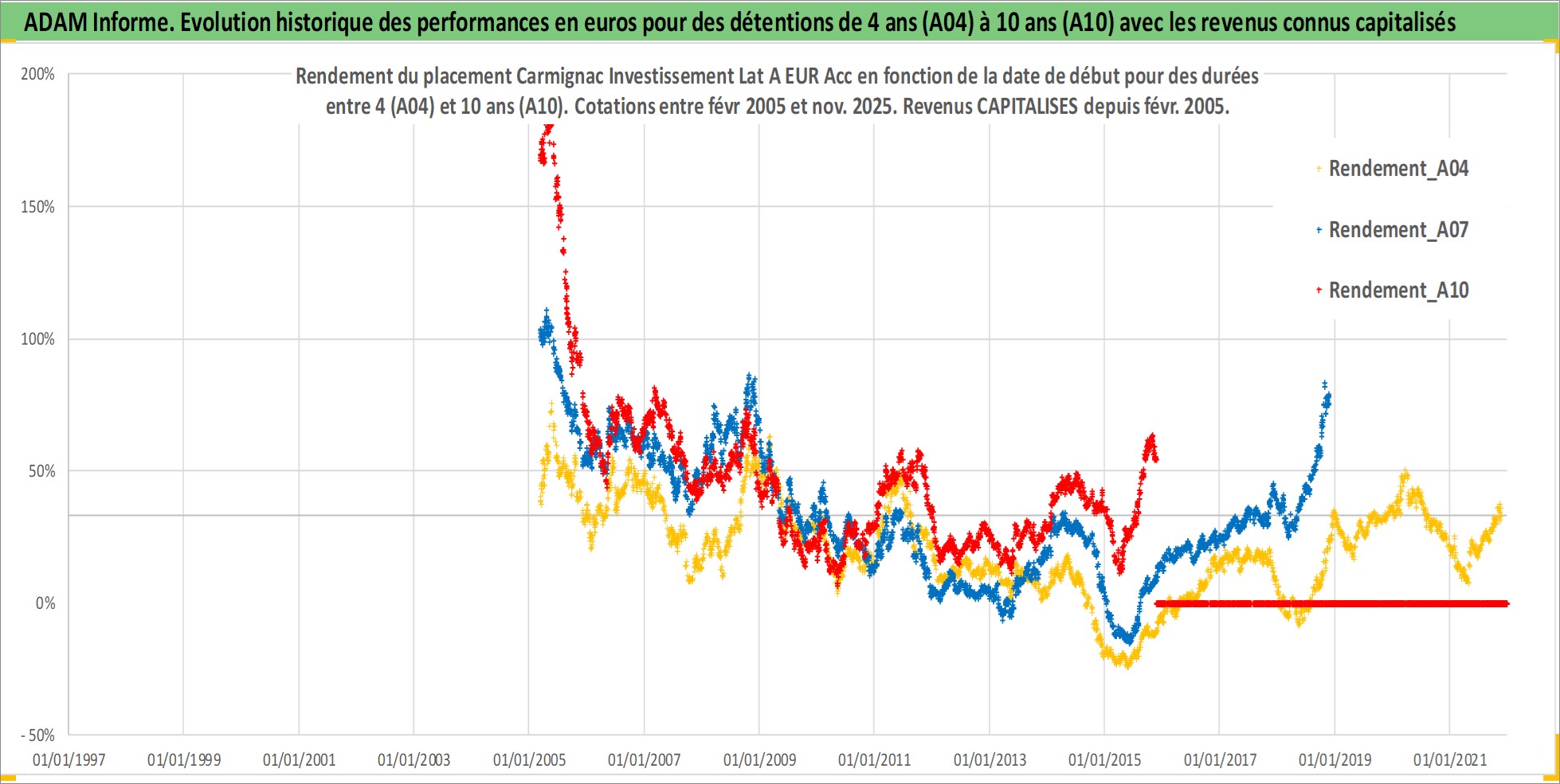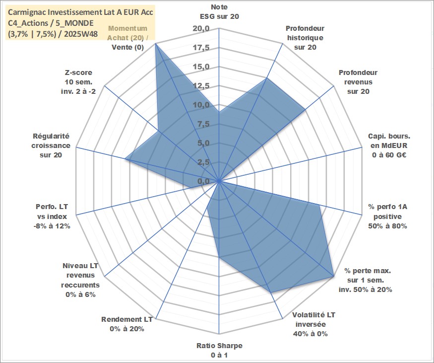 Site dédié aux investisseursPage dédiée sur site financeAnalyse des valorisations hebdomadaires du fonds Carmignac Investissement Lat A EUR Acc. Cet actif est cote en EUR. Les valorisations couvrent les semaines 2005W09 a 2025W48. Les revenus de cet actif financier sont pris en compte depuis la semaine 2005W09. La note globale ESG de cet actif est estimee a 9.0 (apres rebasage entre 0 et 20).