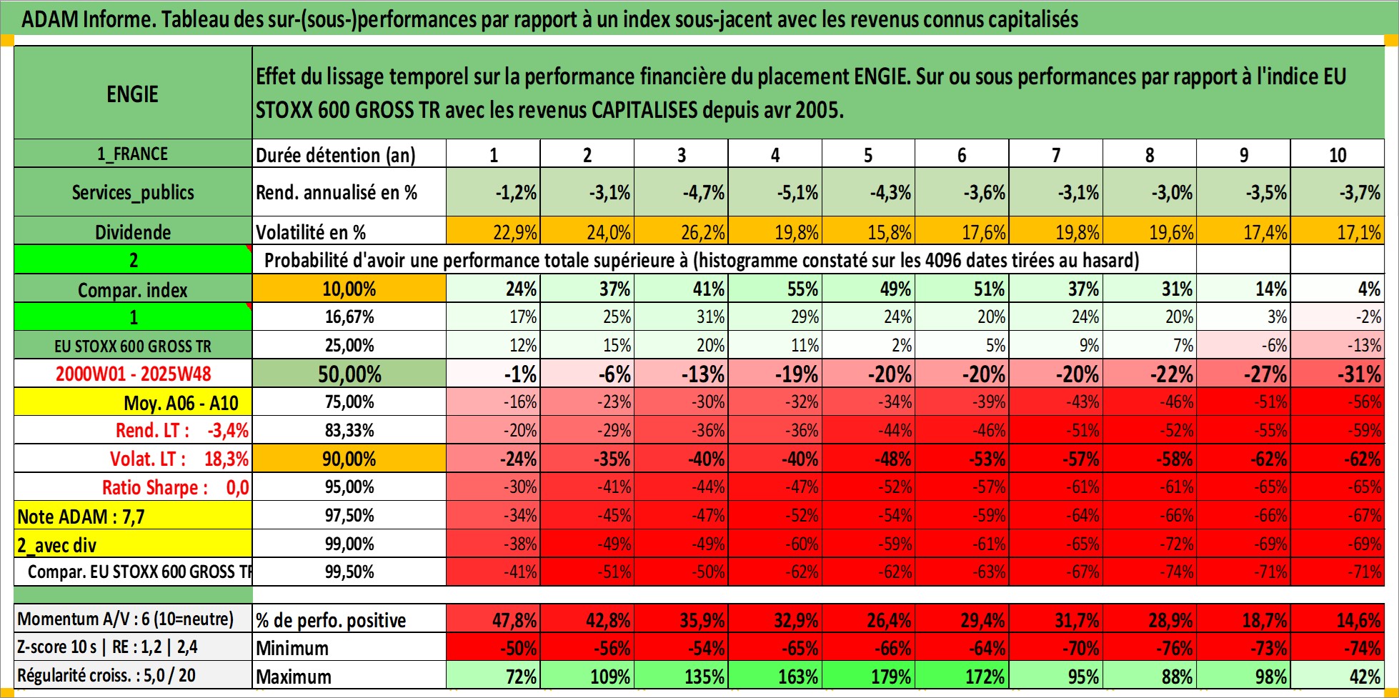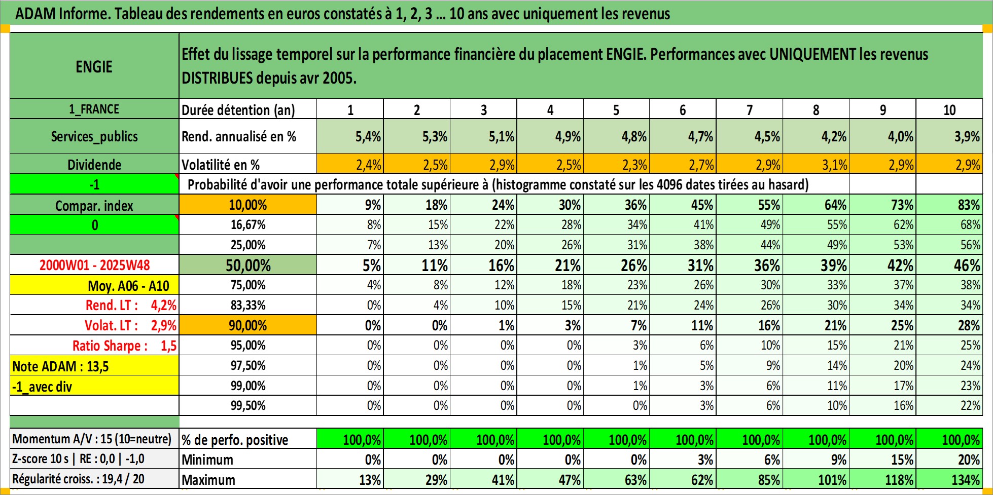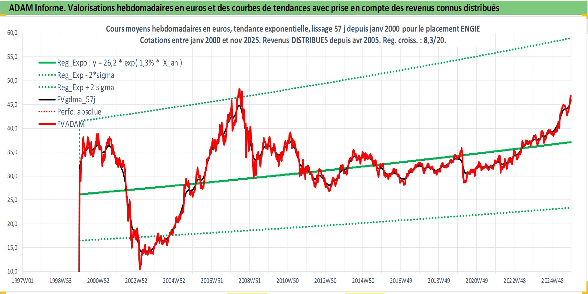 Site dédié aux investisseursPage dédiée sur site financeAnalyse des valorisations hebdomadaires de l'action ENGIE. Cet actif est cote en EUR. Les valorisations couvrent les semaines 2000W01 a 2025W48. Les revenus de cet actif financier sont pris en compte depuis la semaine 2005W14. La note globale ESG de cet actif est estimee a 6.0 (apres rebasage entre 0 et 20).