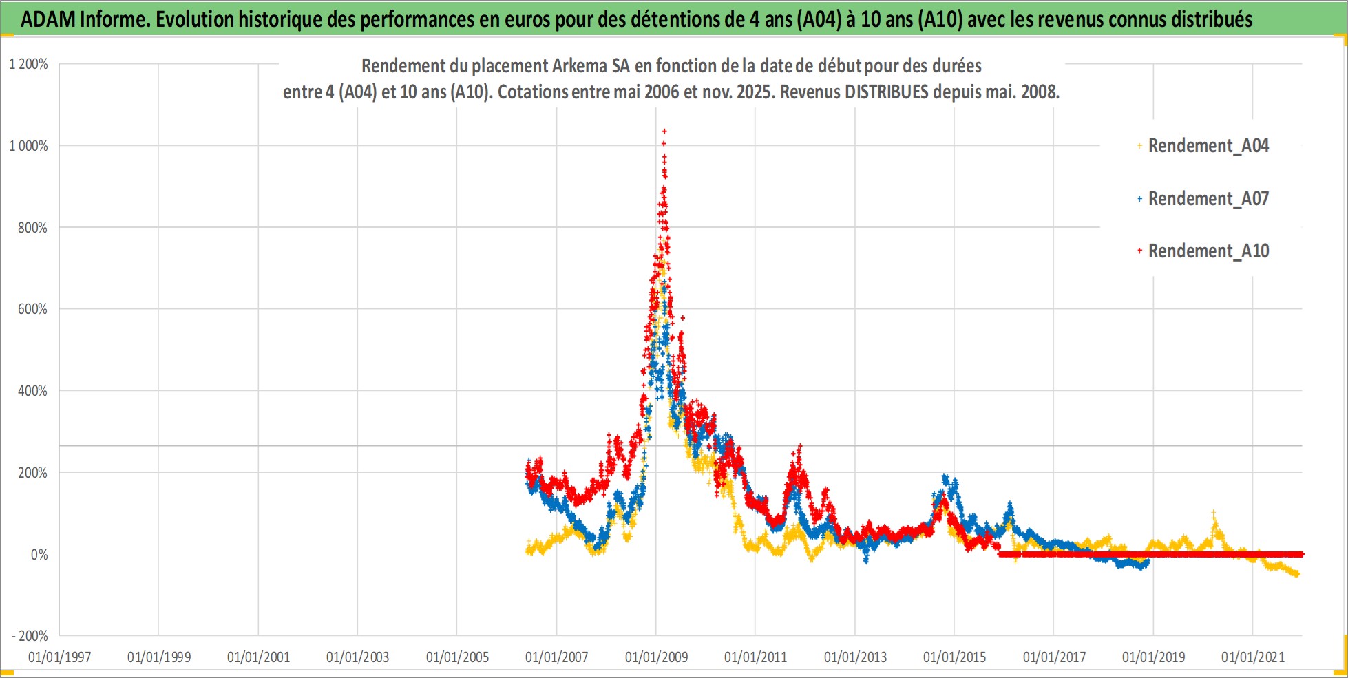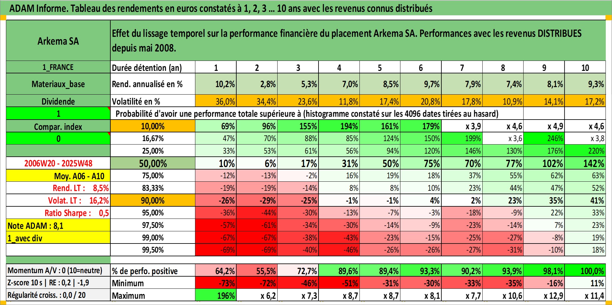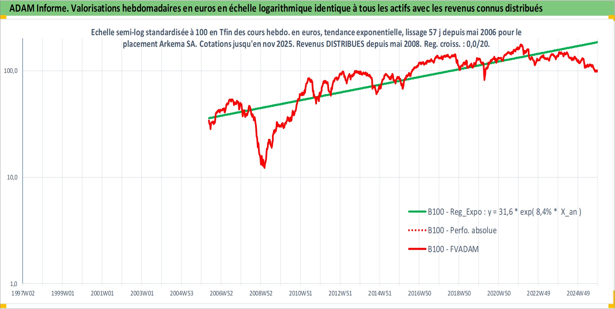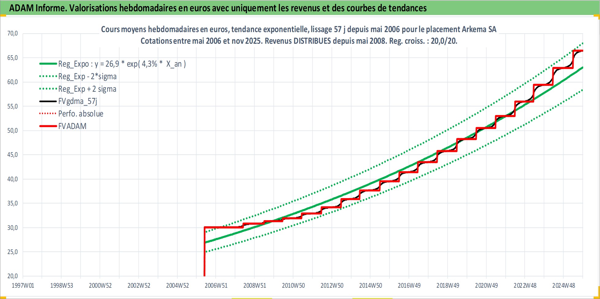 Site dédié aux investisseursPage dédiée sur site financeAnalyse des valorisations hebdomadaires de l'action Arkema SA. Cet actif est cote en EUR. Les valorisations couvrent les semaines 2006W20 a 2025W48. Les revenus de cet actif financier sont pris en compte depuis la semaine 2008W21. La note globale ESG de cet actif est estimee a 10.0 (apres rebasage entre 0 et 20).