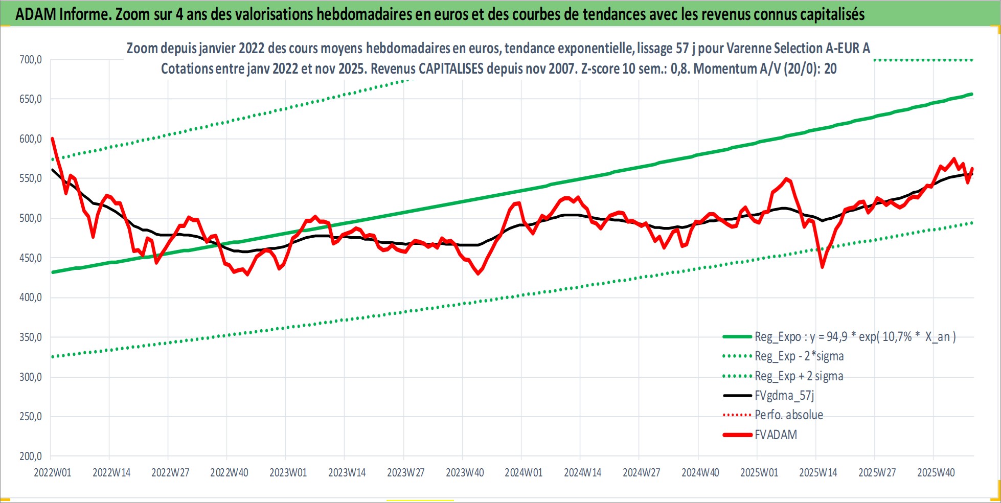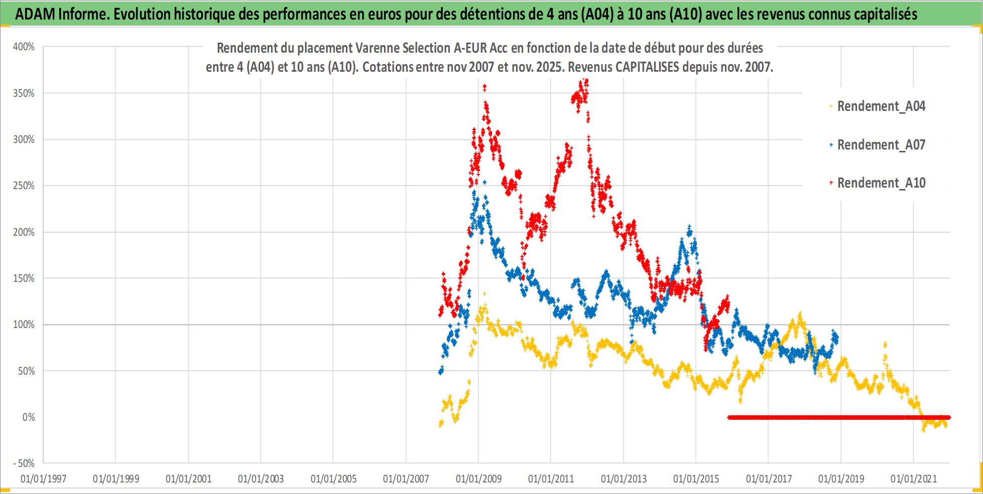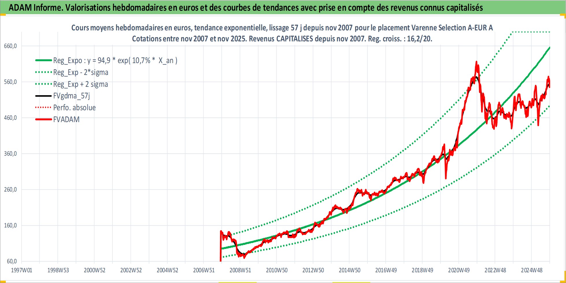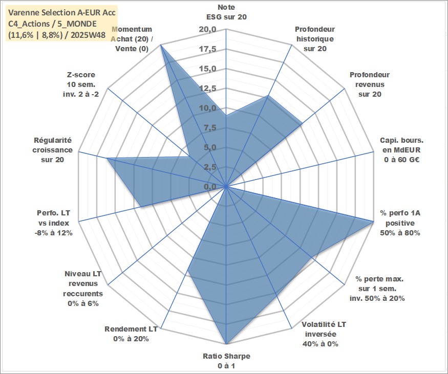 Site dédié aux investisseursPage dédiée sur site financeAnalyse des valorisations hebdomadaires du fonds Varenne Selection A-EUR Acc. Cet actif est cote en EUR. Les valorisations couvrent les semaines 2007W48 a 2025W48. Les revenus de cet actif financier sont pris en compte depuis la semaine 2007W48. La note globale ESG de cet actif est estimee a 9.0 (apres rebasage entre 0 et 20).