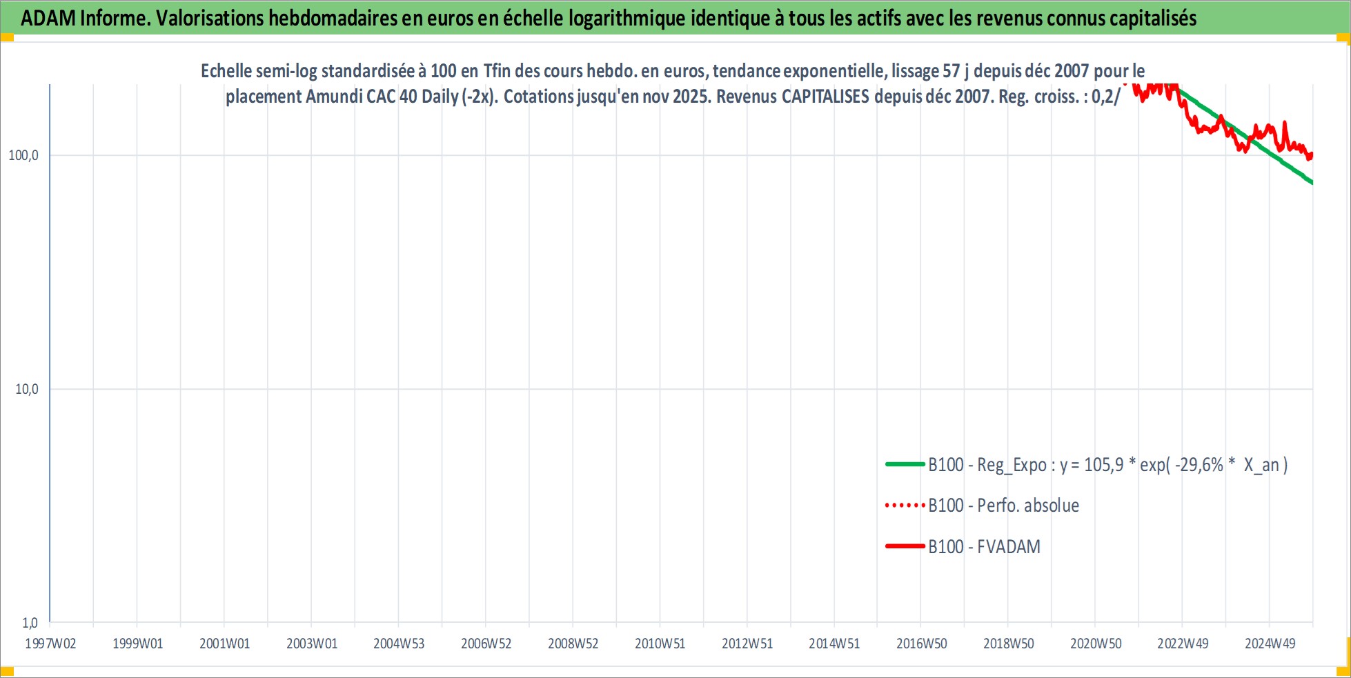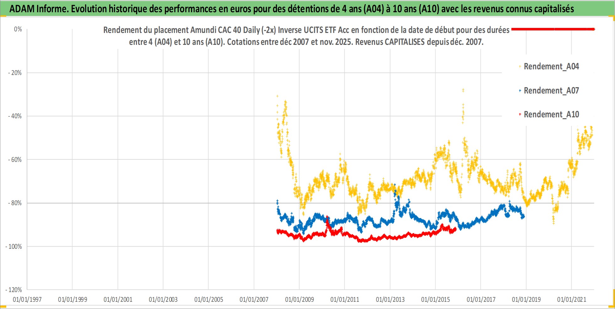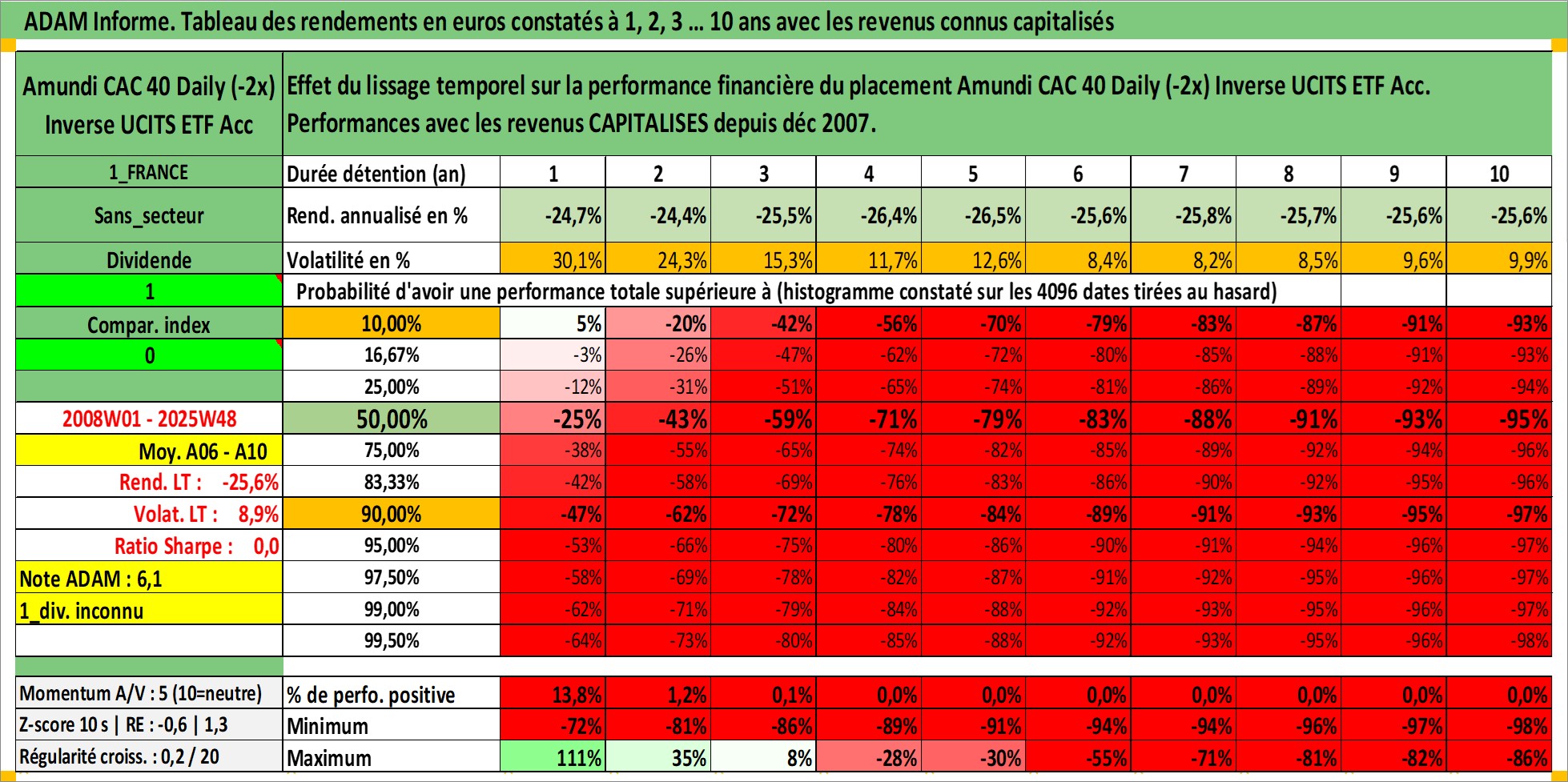 Site dédié aux investisseursPage dédiée sur site financeAnalyse des valorisations hebdomadaires du fonds Amundi CAC 40 Daily (-2x) Inverse UCITS ETF Acc. Cet actif est cote en EUR. Les valorisations couvrent les semaines 2008W01 a 2025W48. Les revenus de cet actif financier sont pris en compte depuis la semaine 2008W01. La note ESG de cet actif n'est pas connue.