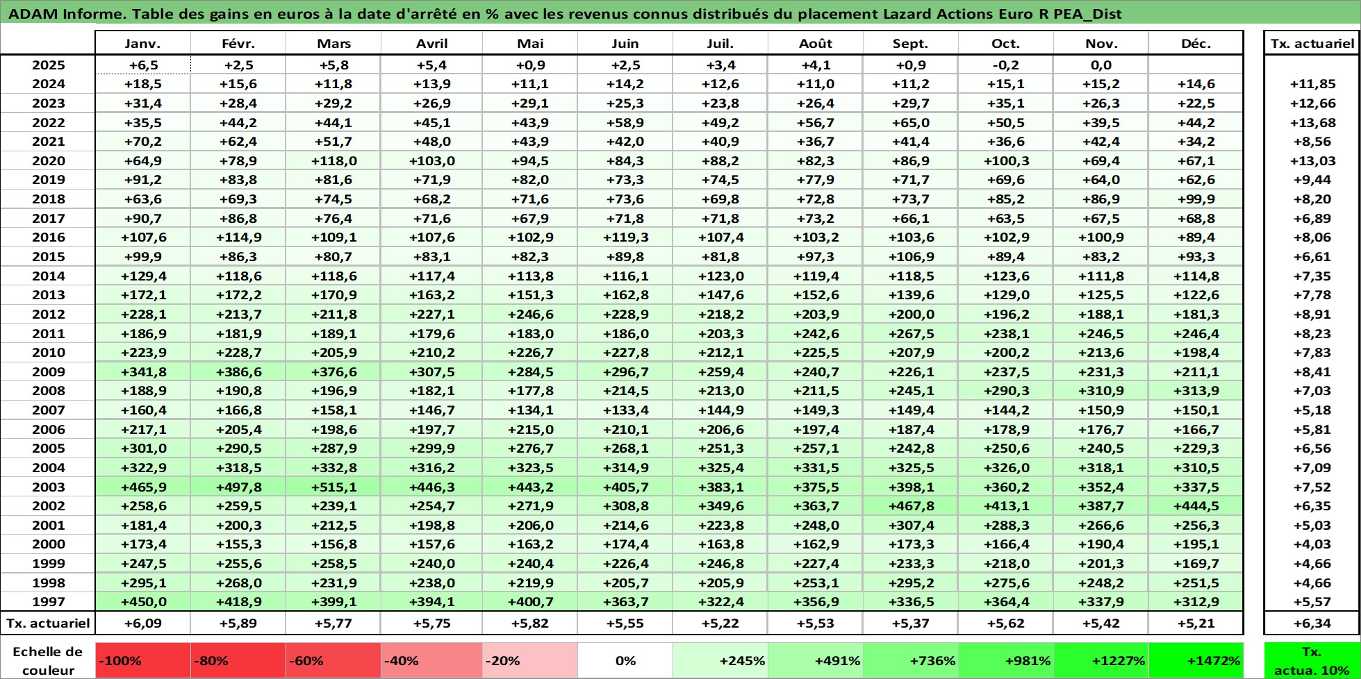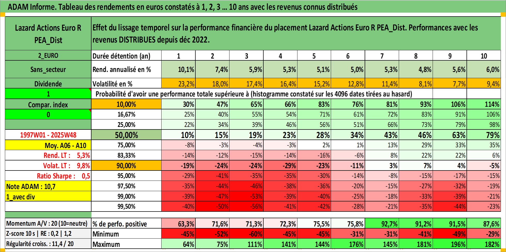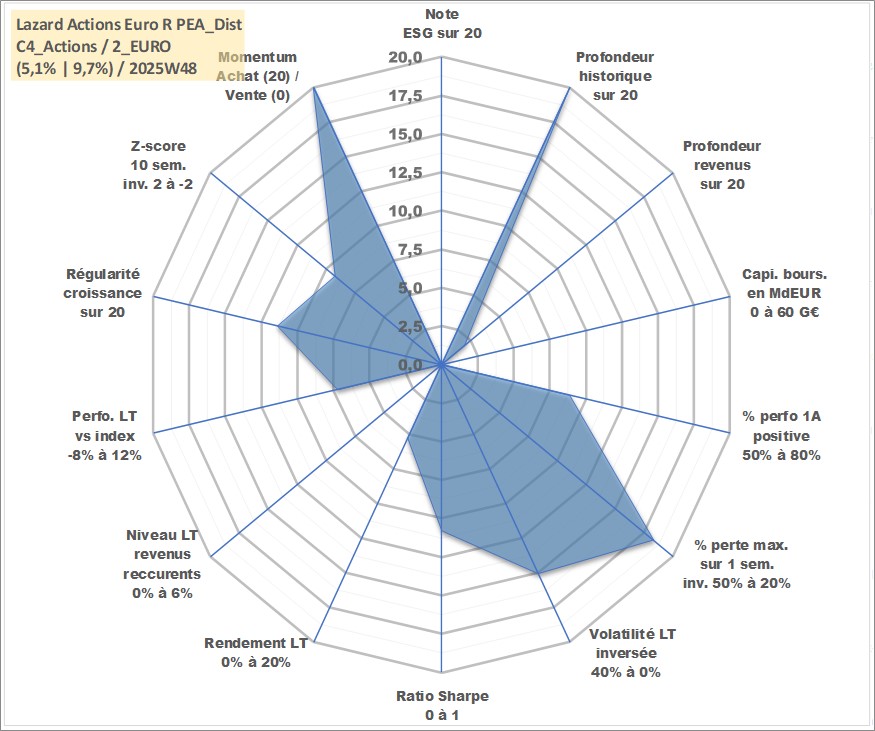 Site dédié aux investisseursPage dédiée sur site financeAnalyse des valorisations hebdomadaires du fonds Lazard Actions Euro R PEA_Dist. Cet actif est cote en EUR. Les valorisations couvrent les semaines 1997W01 a 2025W48. Les revenus de cet actif financier sont pris en compte depuis la semaine 2022W51. La note ESG de cet actif n'est pas connue.