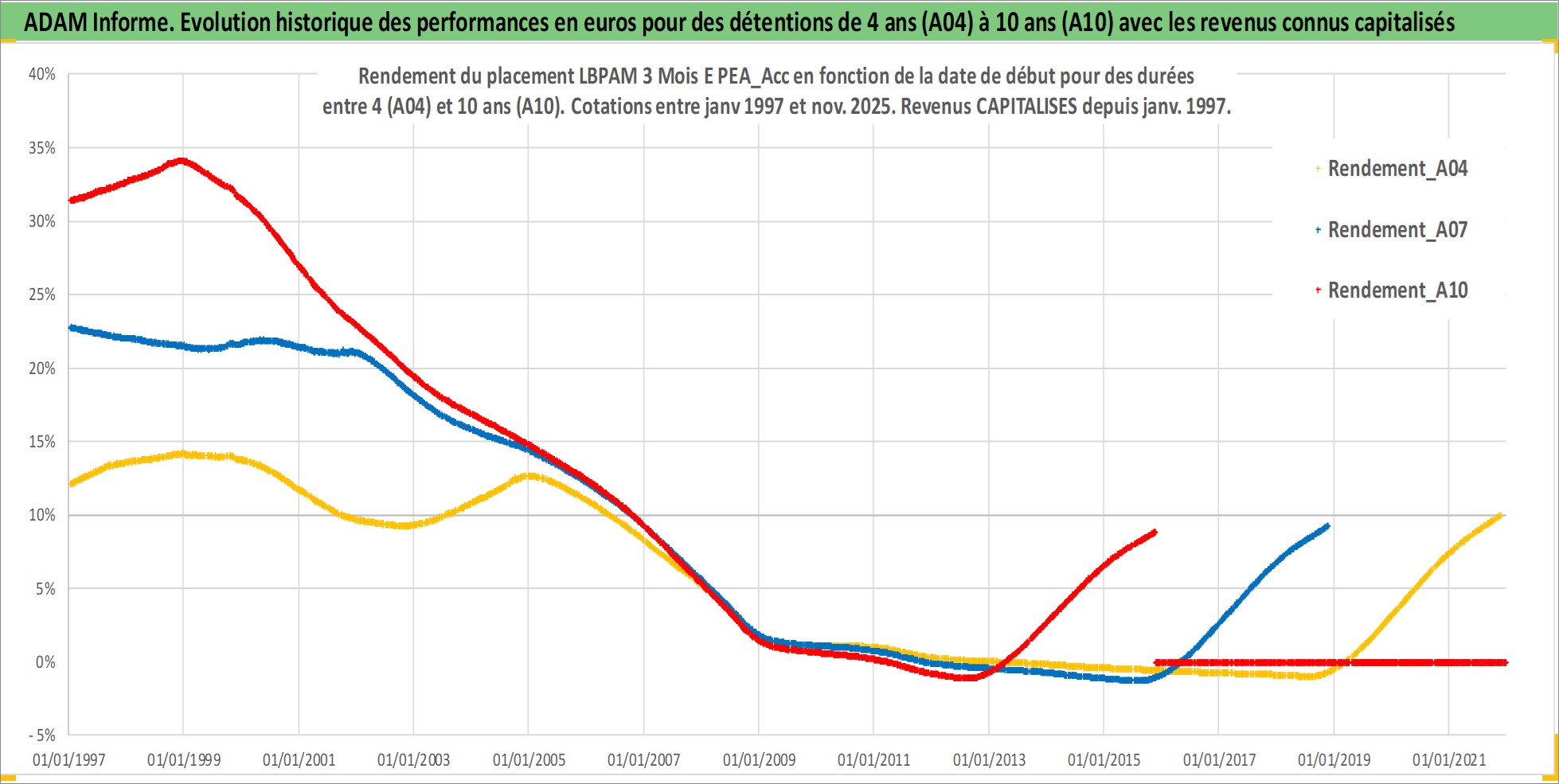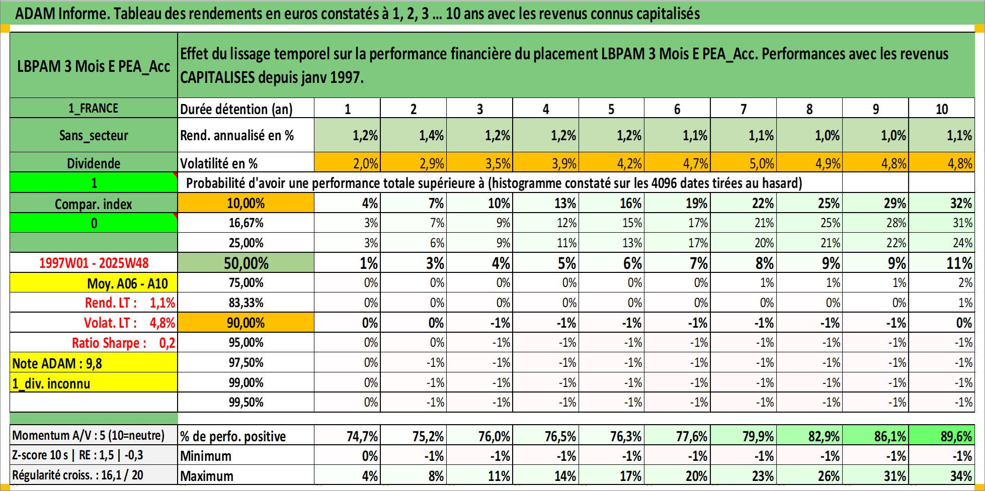 Site dédié aux investisseursPage dédiée sur site financeAnalyse des valorisations hebdomadaires du fonds LBPAM 3 Mois E PEA_Acc. Cet actif est cote en EUR. Les valorisations couvrent les semaines 1997W01 a 2025W48. Les revenus de cet actif financier sont pris en compte depuis la semaine 1997W01. La note ESG de cet actif n'est pas connue.