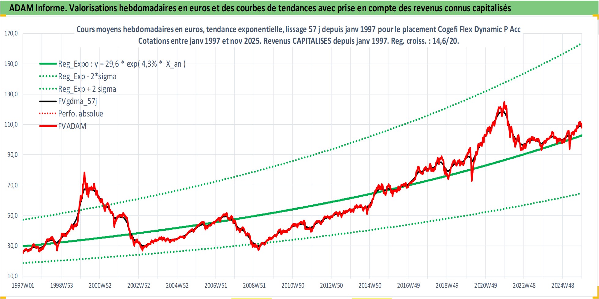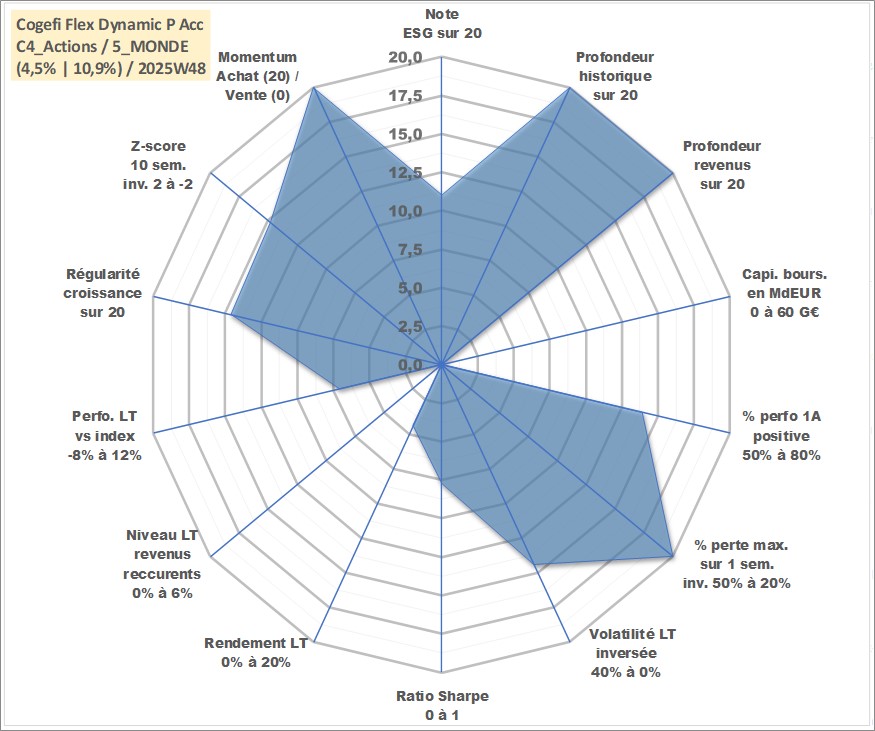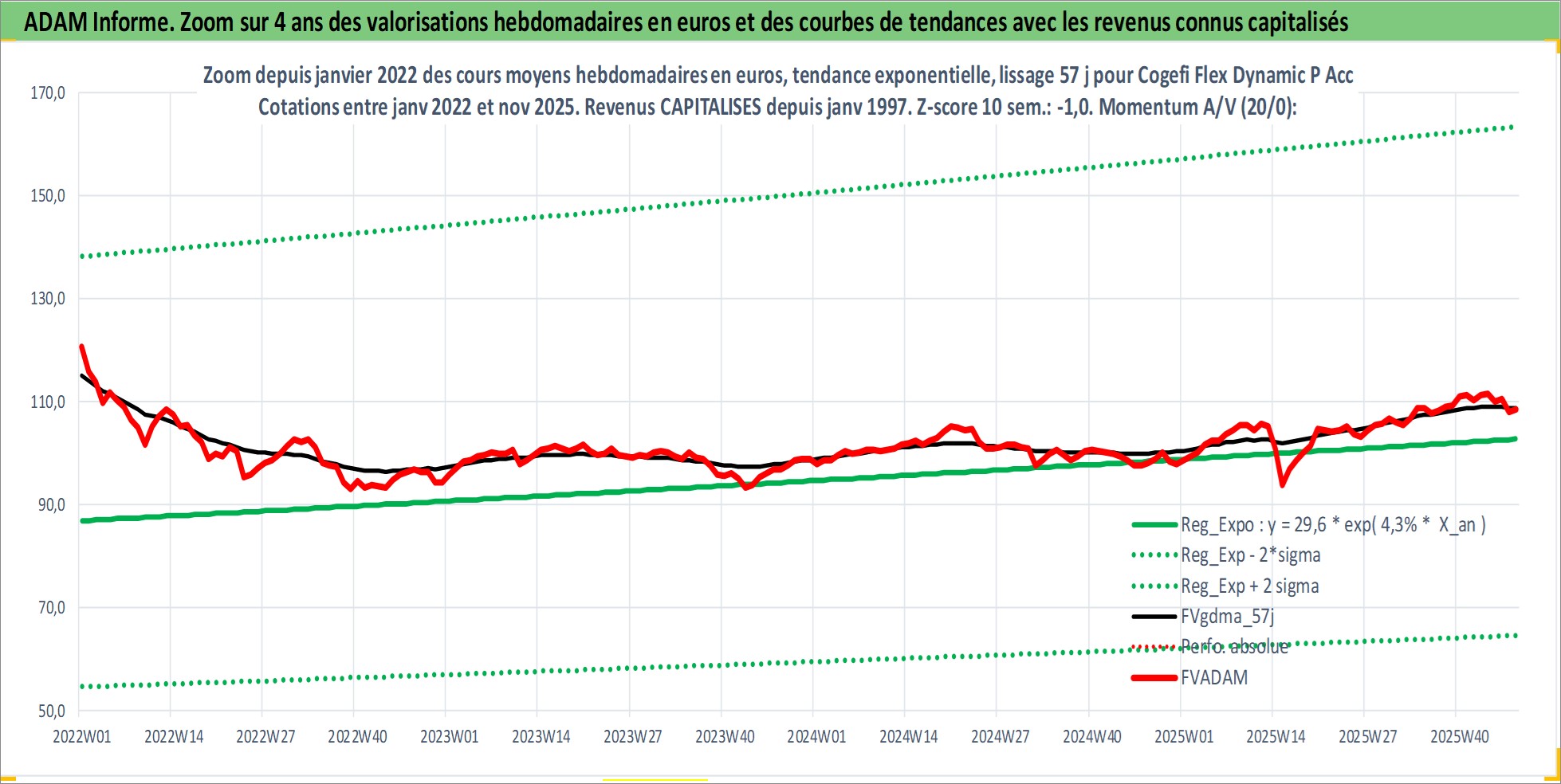 Site dédié aux investisseursPage dédiée sur site financeAnalyse des valorisations hebdomadaires du fonds Cogefi Flex Dynamic P Acc. Cet actif est cote en EUR. Les valorisations couvrent les semaines 1997W01 a 2025W48. Les revenus de cet actif financier sont pris en compte depuis la semaine 1997W01. La note globale ESG de cet actif est estimee a 11.0 (apres rebasage entre 0 et 20).