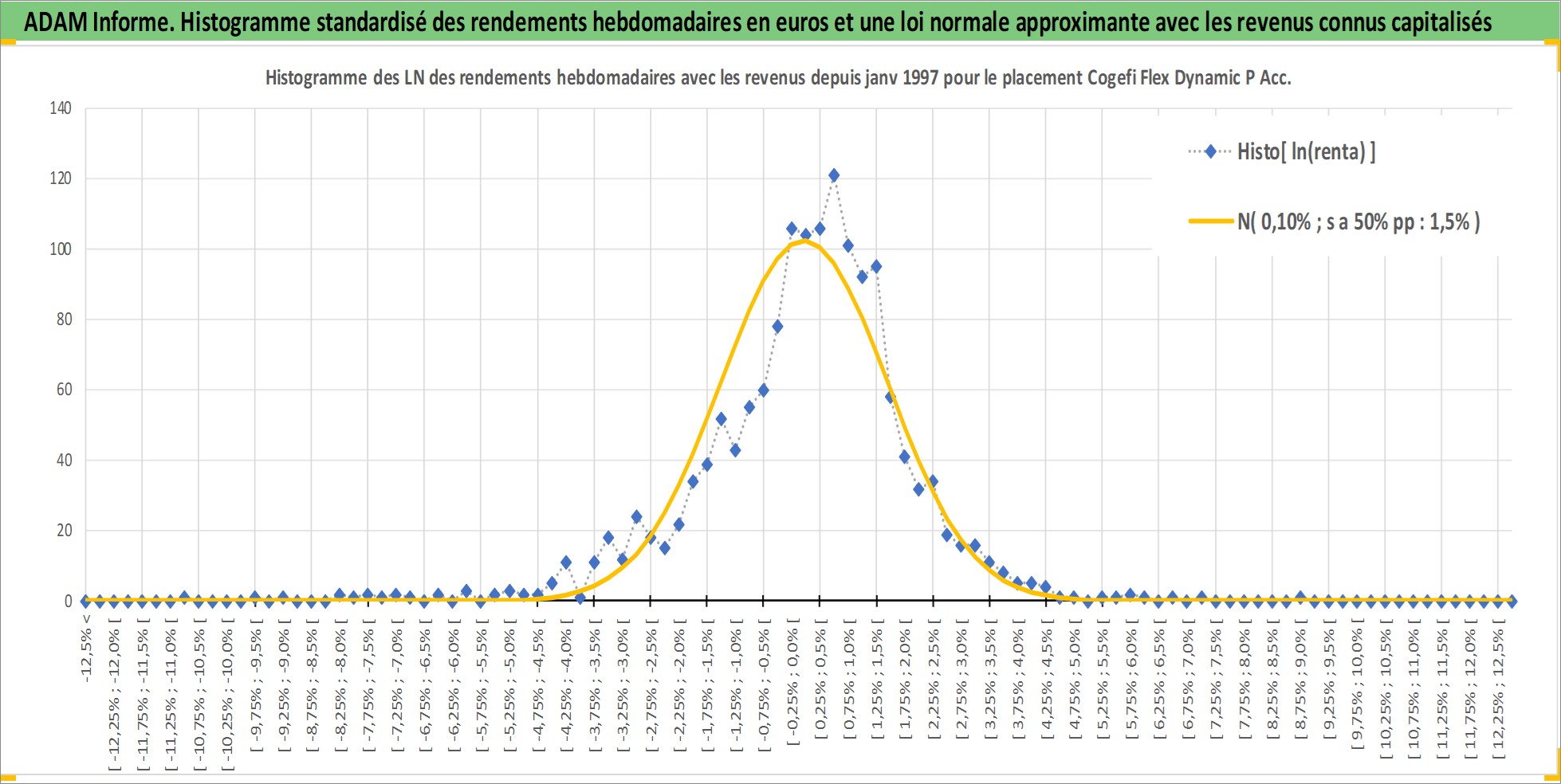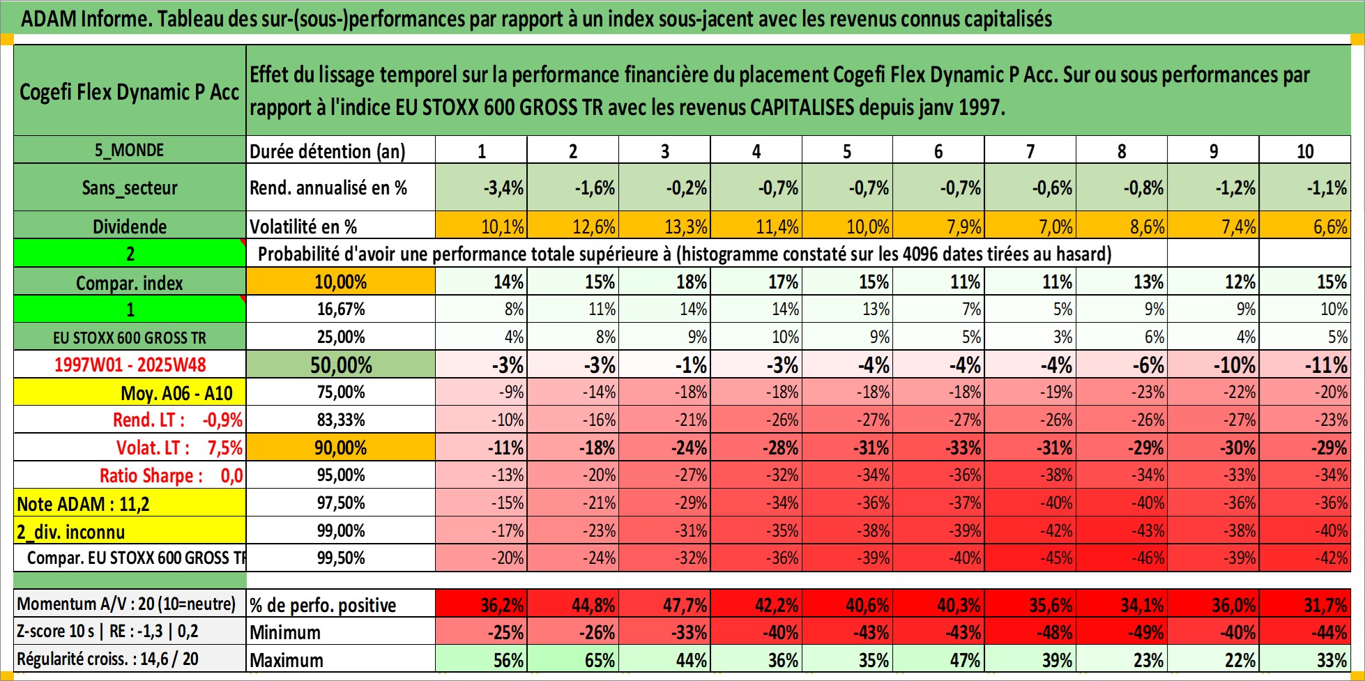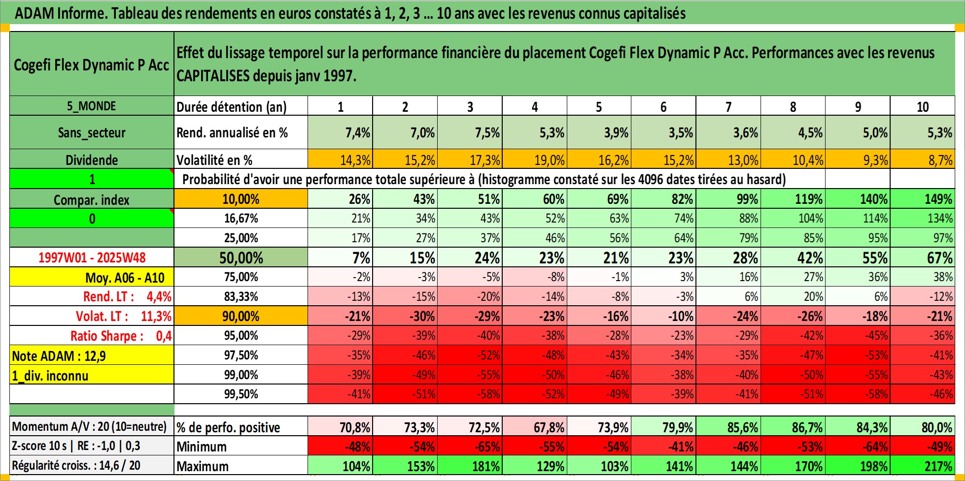 Site dédié aux investisseursPage dédiée sur site financeAnalyse des valorisations hebdomadaires du fonds Cogefi Flex Dynamic P Acc. Cet actif est cote en EUR. Les valorisations couvrent les semaines 1997W01 a 2025W48. Les revenus de cet actif financier sont pris en compte depuis la semaine 1997W01. La note globale ESG de cet actif est estimee a 11.0 (apres rebasage entre 0 et 20).