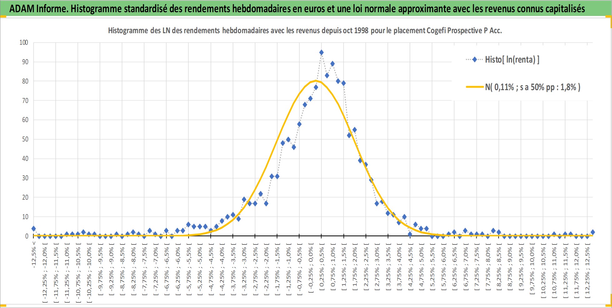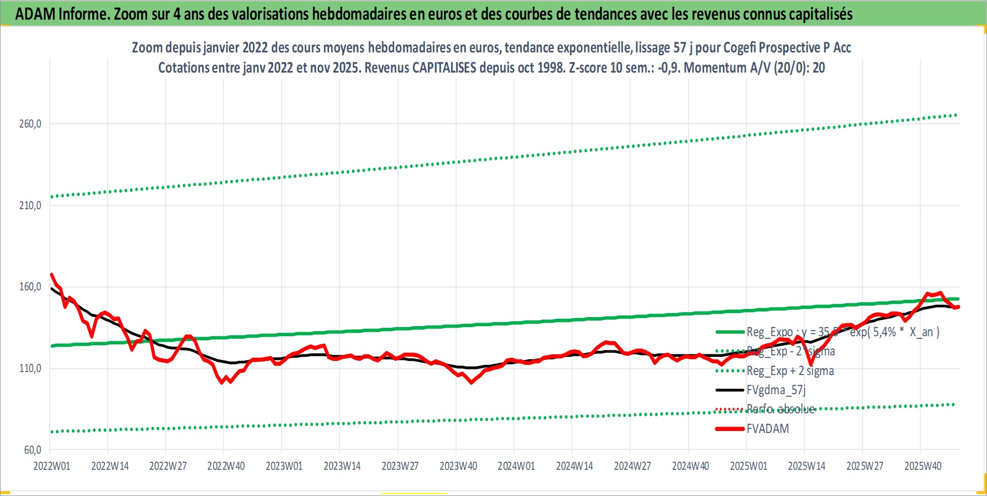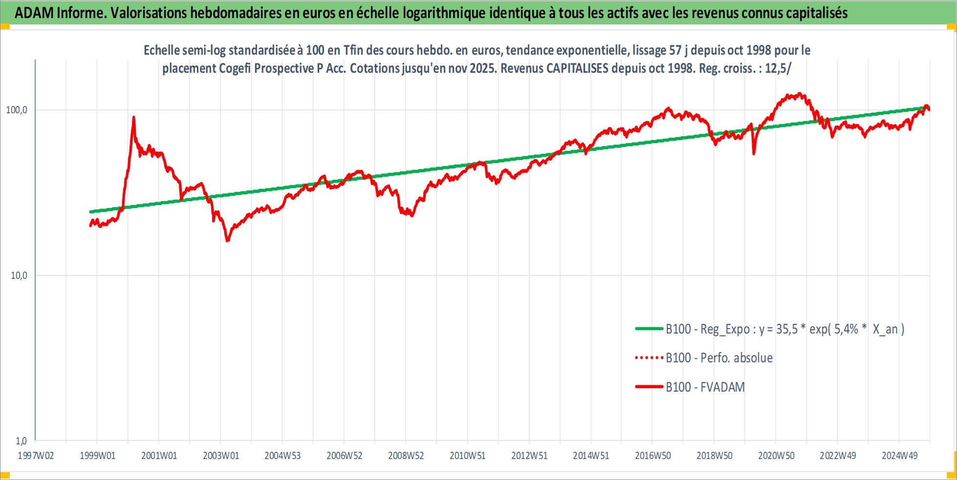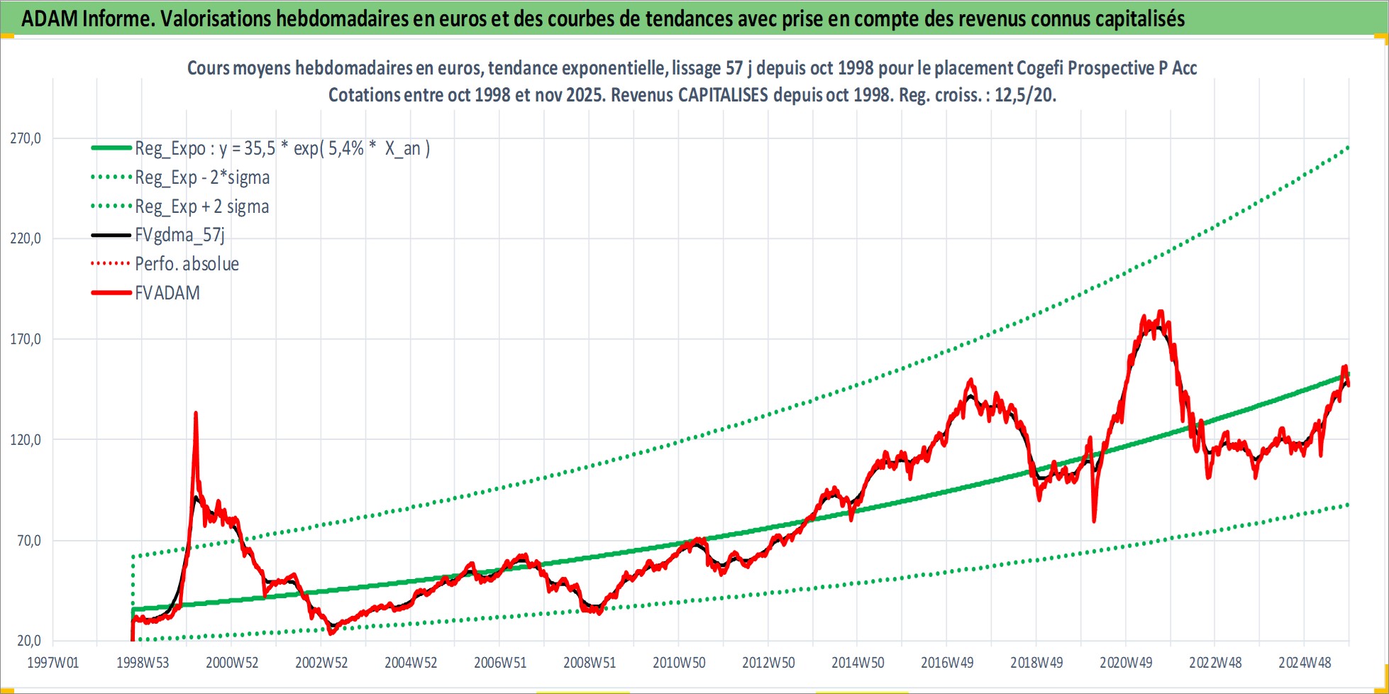 Site dédié aux investisseursPage dédiée sur site financeAnalyse des valorisations hebdomadaires du fonds Cogefi Prospective P Acc. Cet actif est cote en EUR. Les valorisations couvrent les semaines 1998W42 a 2025W48. Les revenus de cet actif financier sont pris en compte depuis la semaine 1998W42. La note globale ESG de cet actif est estimee a 9.0 (apres rebasage entre 0 et 20).