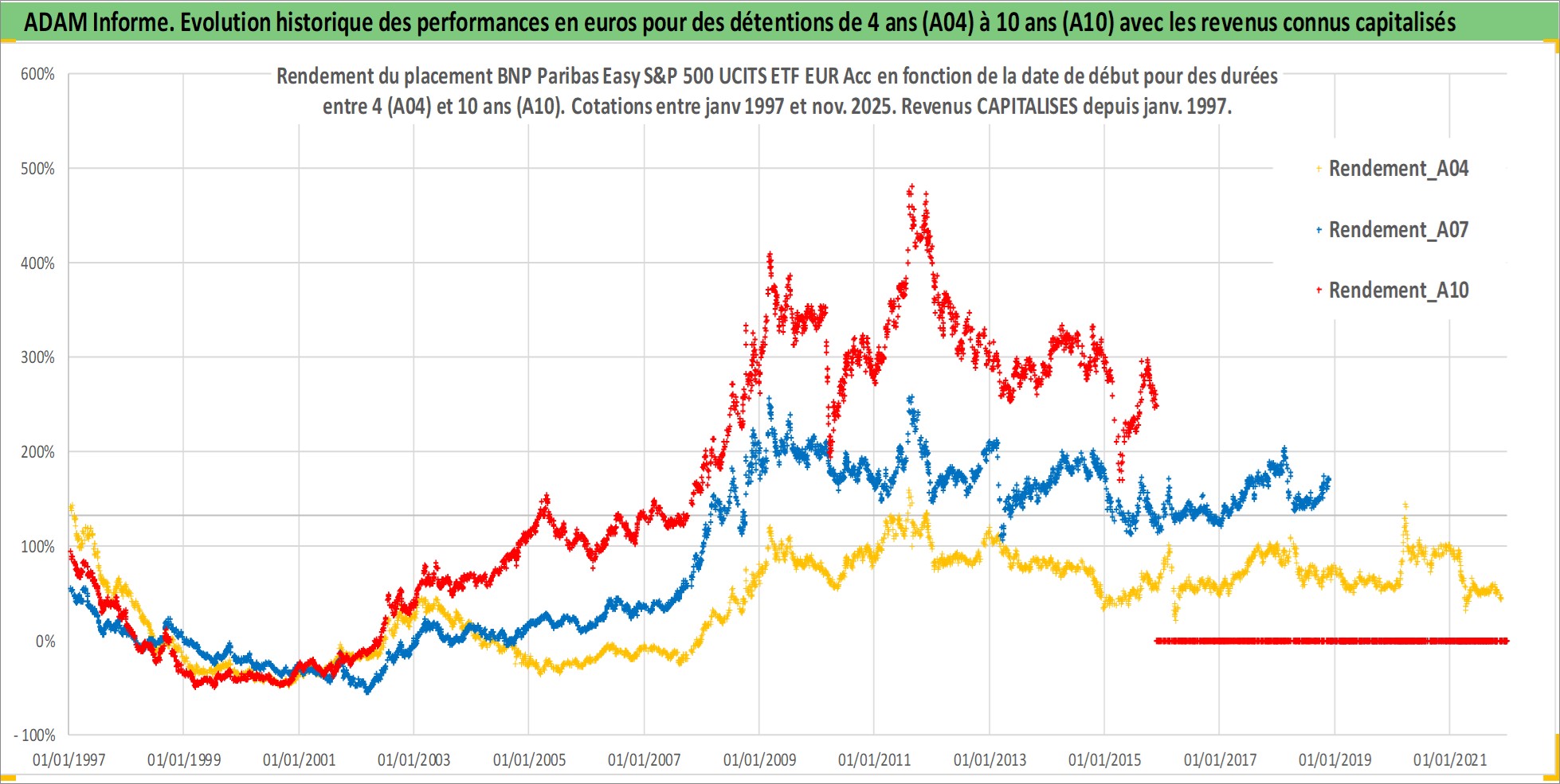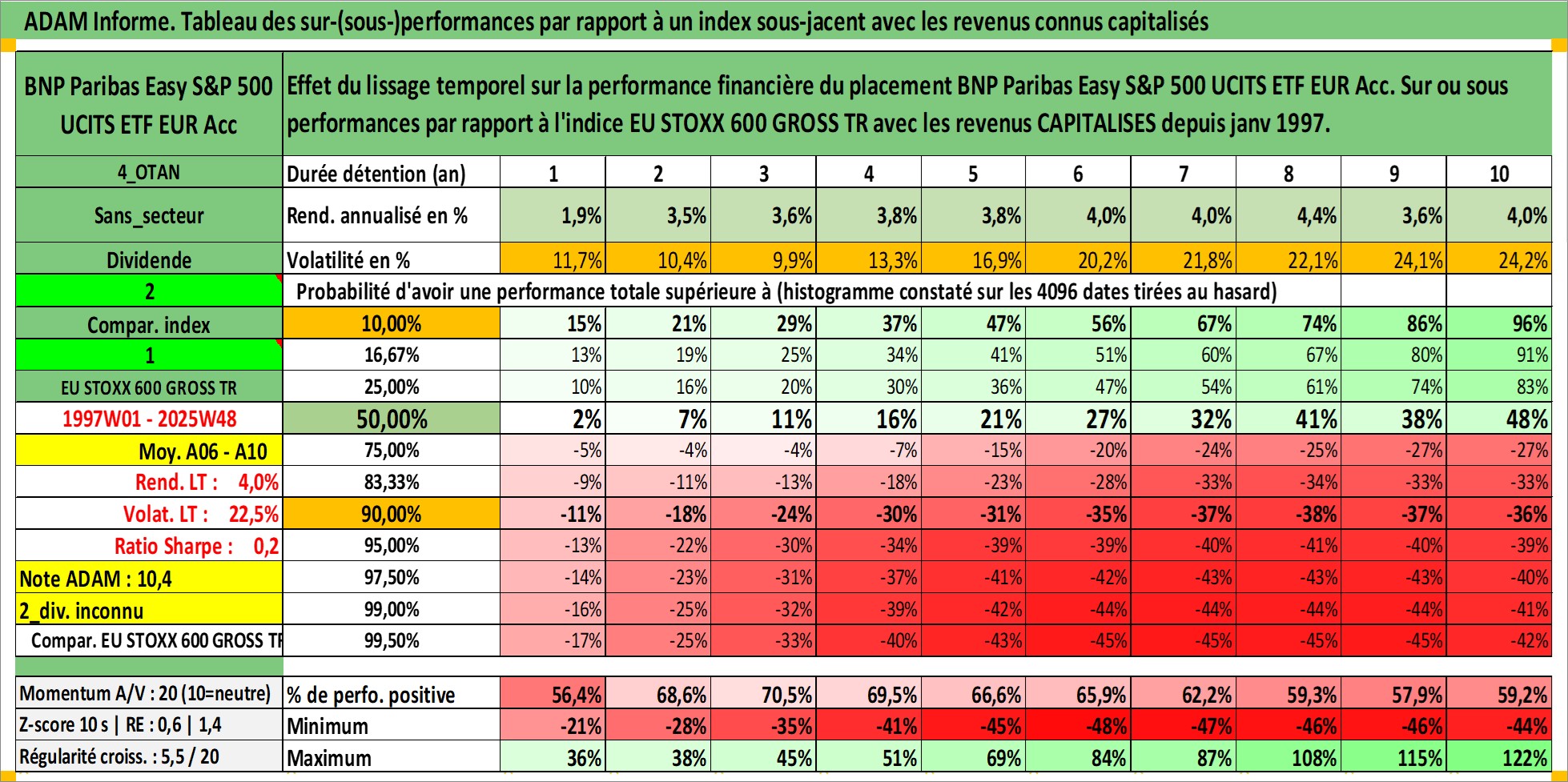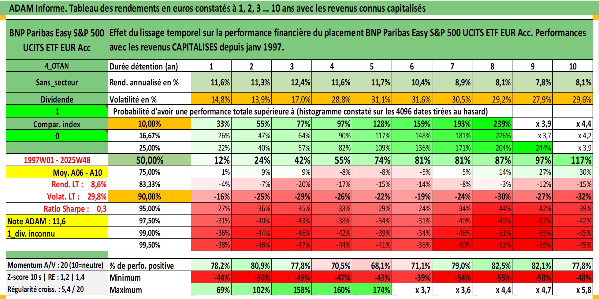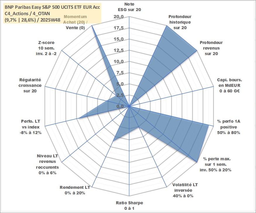 Site dédié aux investisseursPage dédiée sur site financeAnalyse des valorisations hebdomadaires du fonds BNP Paribas Easy S&P 500 UCITS ETF EUR Acc. Cet actif est cote en EUR. Les valorisations couvrent les semaines 1997W01 a 2025W48. Les revenus de cet actif financier sont pris en compte depuis la semaine 1997W01. La note ESG de cet actif n'est pas connue.