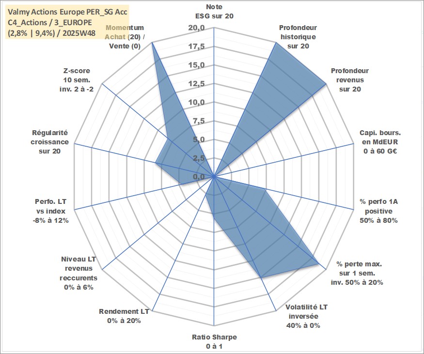 Site dédié aux investisseursPage dédiée sur site financeAnalyse des valorisations hebdomadaires du fonds Valmy Actions Europe PER_SG Acc. Cet actif est cote en EUR. Les valorisations couvrent les semaines 1997W01 a 2025W48. Les revenus de cet actif financier sont pris en compte depuis la semaine 1997W01. La note ESG de cet actif n'est pas connue.