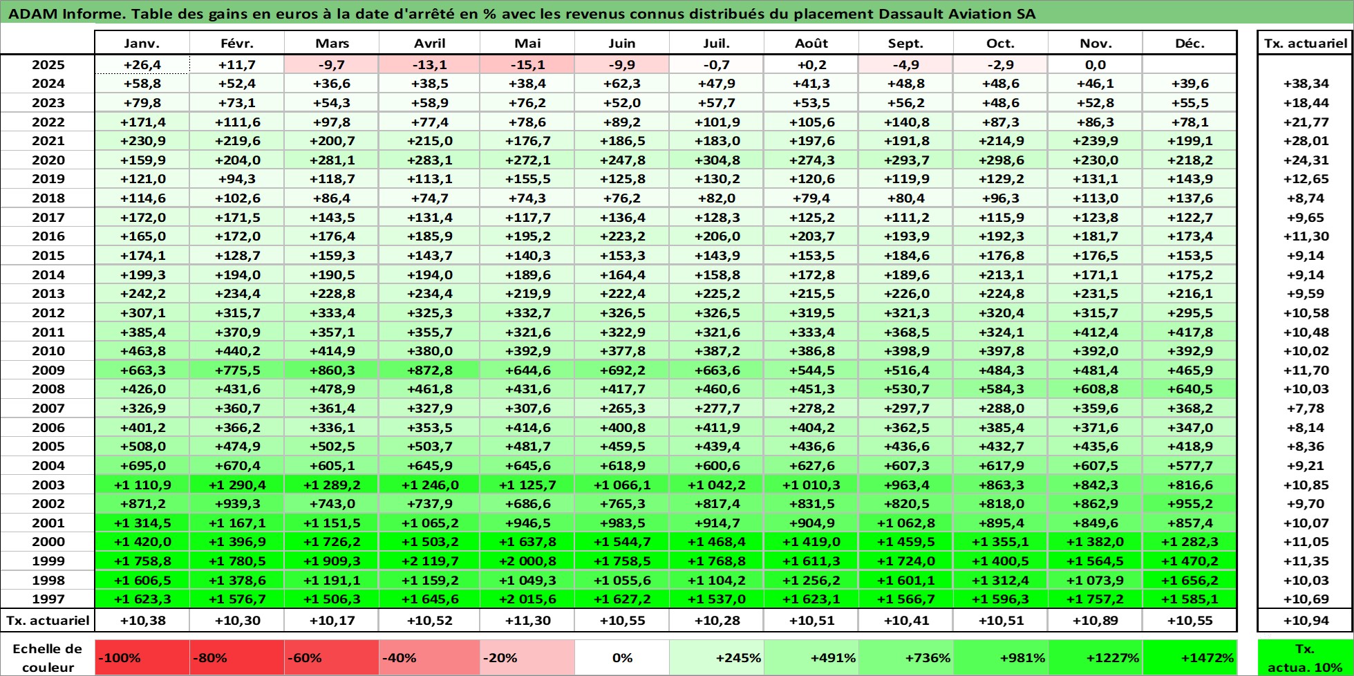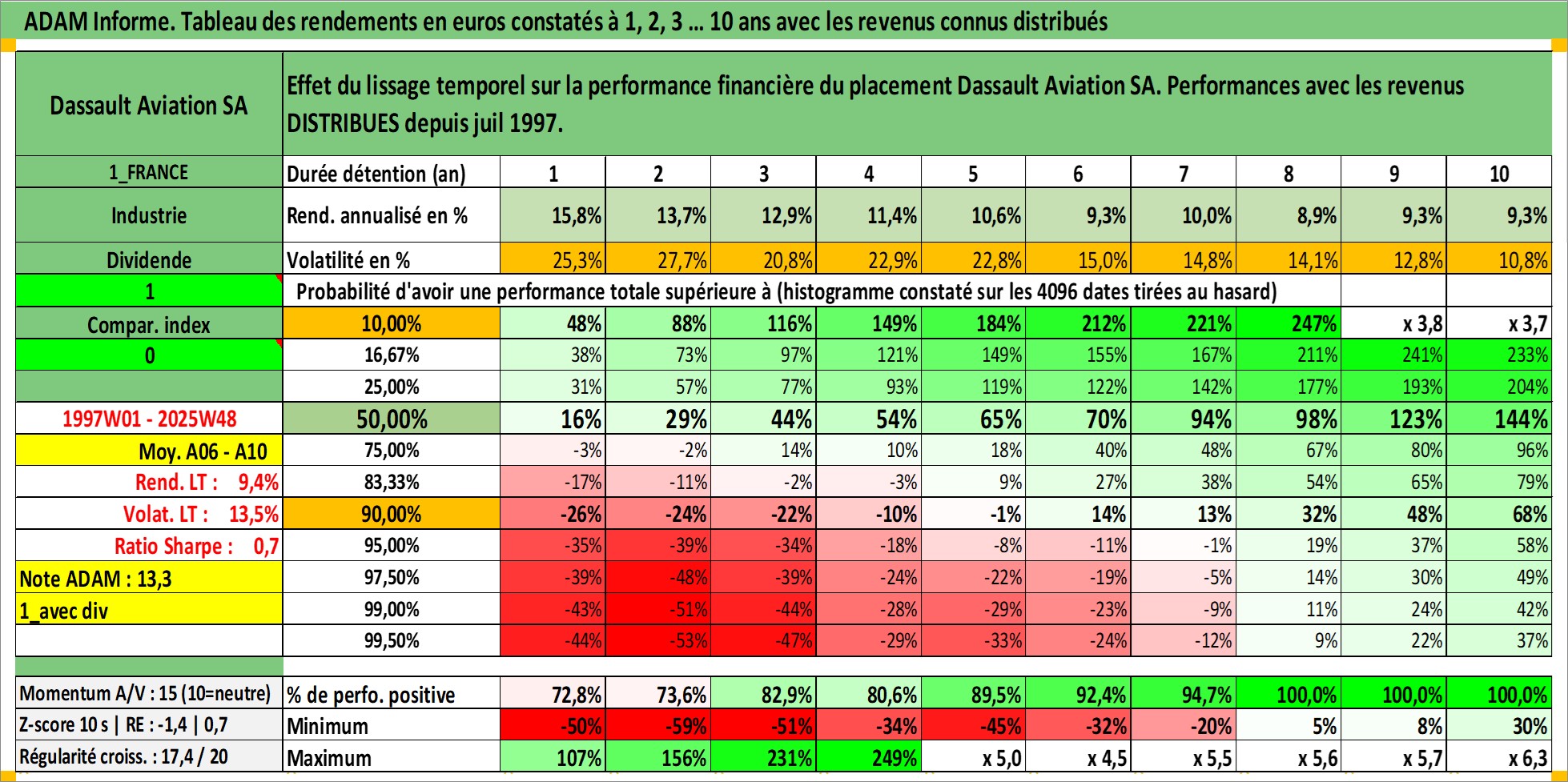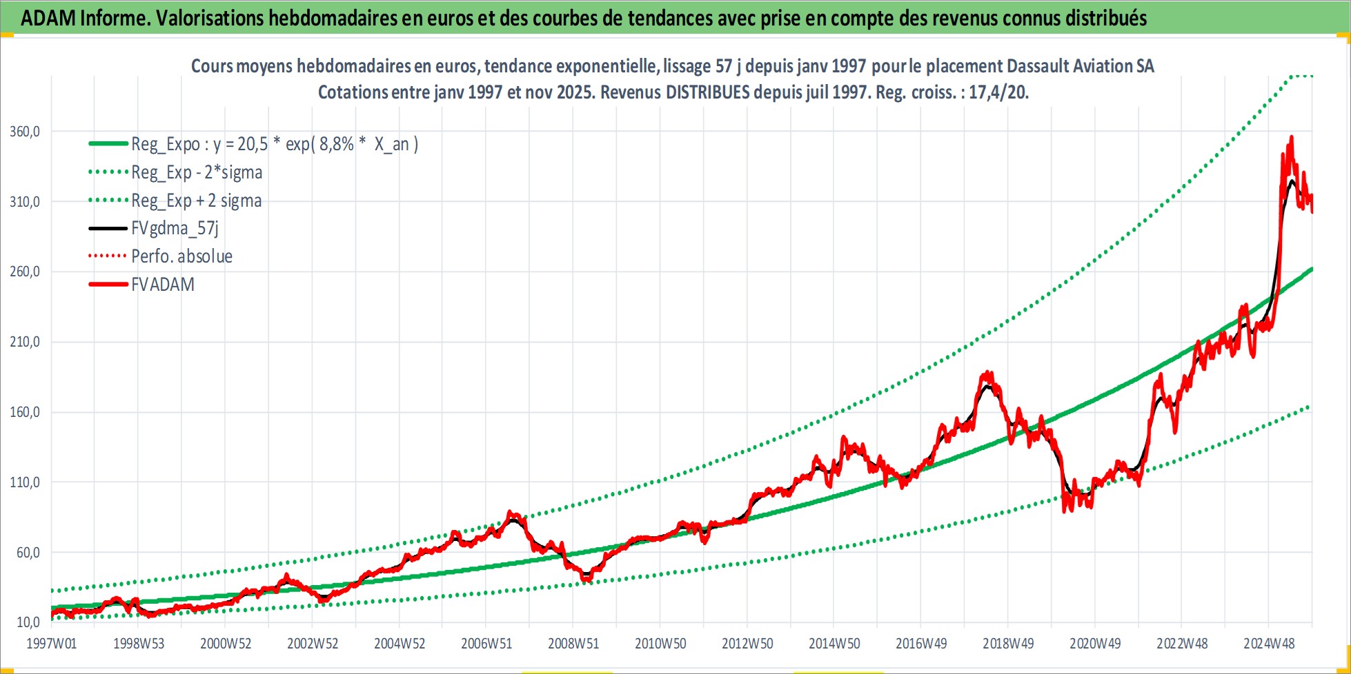 Site dédié aux investisseursPage dédiée sur site financeAnalyse des valorisations hebdomadaires de l'action Dassault Aviation SA. Cet actif est cote en EUR. Les valorisations couvrent les semaines 1997W01 a 2025W48. Les revenus de cet actif financier sont pris en compte depuis la semaine 1997W27. La note ESG de cet actif n'est pas connue.