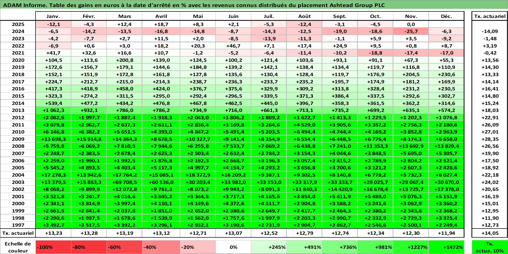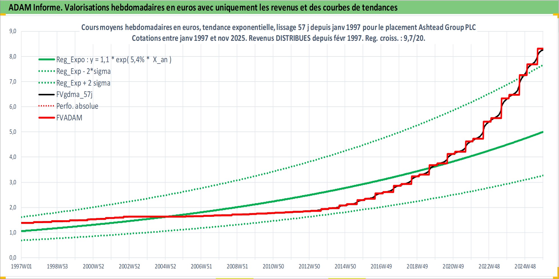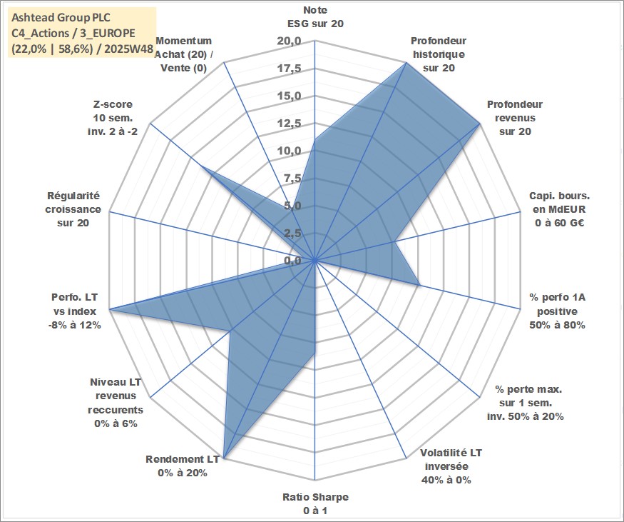 Site dédié aux investisseursPage dédiée sur site financeAnalyse des valorisations hebdomadaires de l'action Ashtead Group PLC. Cet actif est cote en GBX. Les valorisations sont en contrevaleur EURO et couvrent les semaines 1997W01 a 2025W48. Les revenus de cet actif financier sont pris en compte depuis la semaine 1997W09. La note globale ESG de cet actif est estimee a 11.0 (apres rebasage entre 0 et 20).