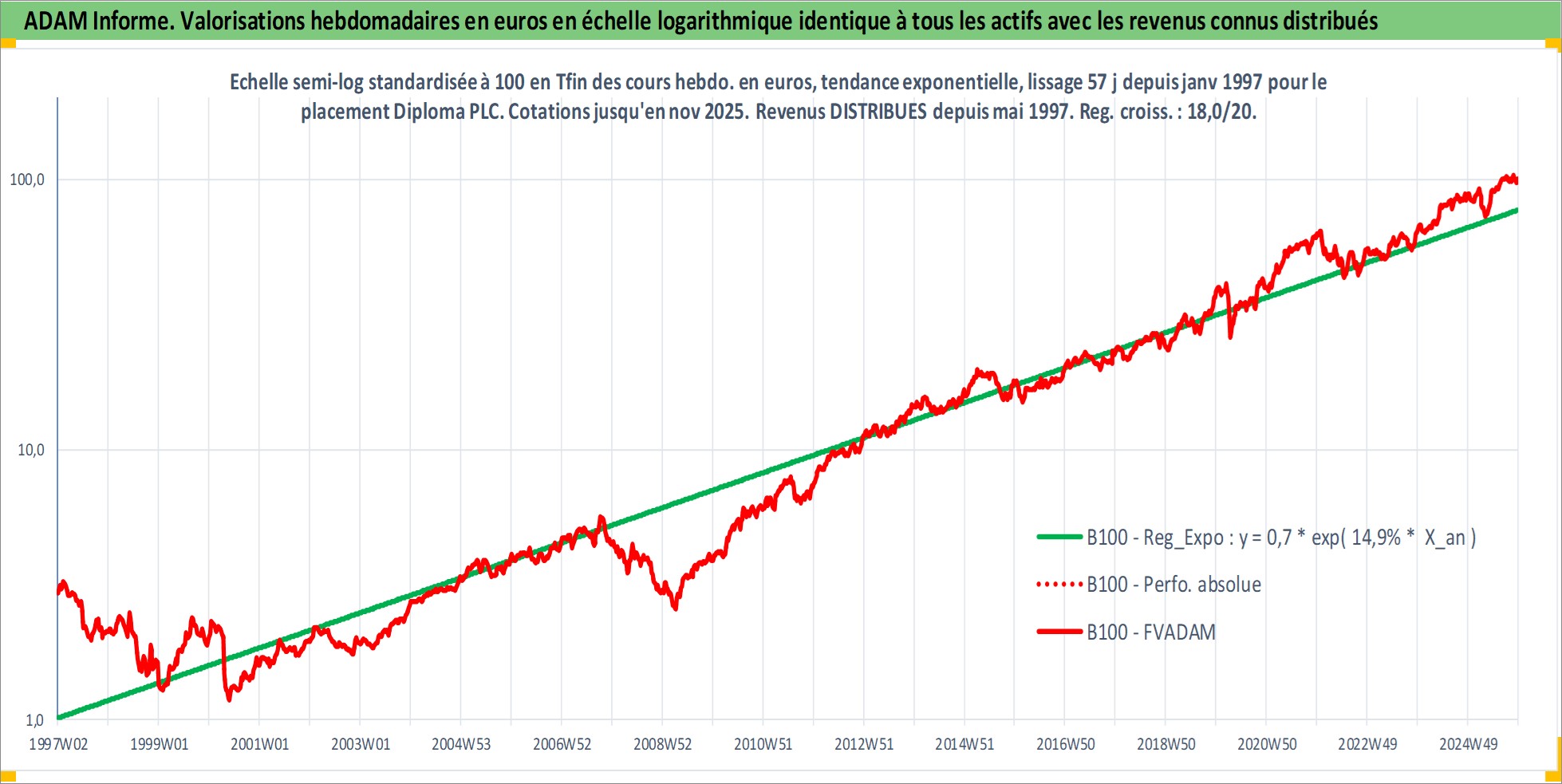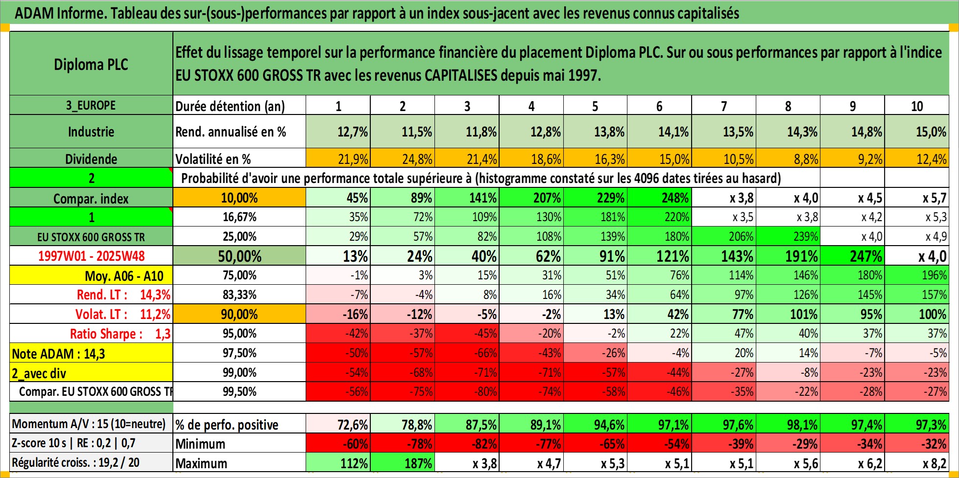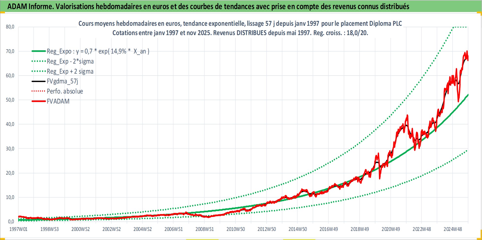 Site dédié aux investisseursPage dédiée sur site financeAnalyse des valorisations hebdomadaires de l'action Diploma PLC. Cet actif est cote en GBX. Les valorisations sont en contrevaleur EURO et couvrent les semaines 1997W01 a 2025W48. Les revenus de cet actif financier sont pris en compte depuis la semaine 1997W21. La note ESG de cet actif n'est pas connue.
