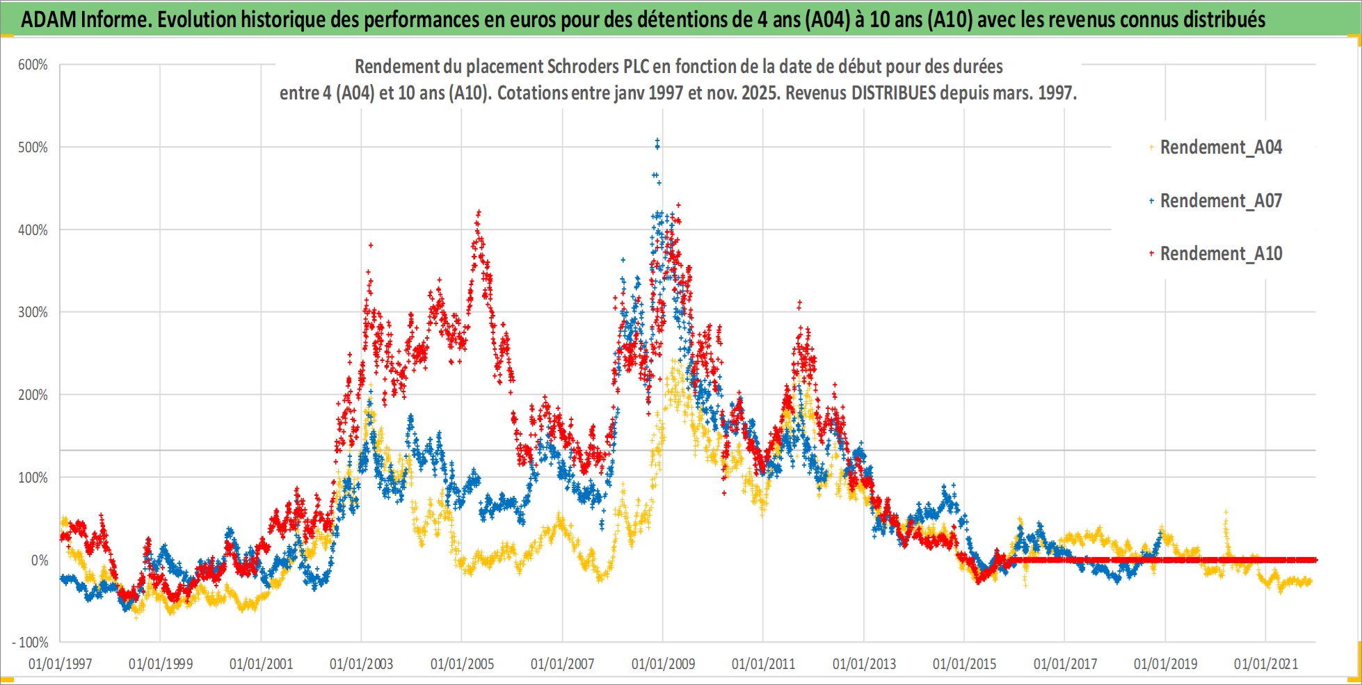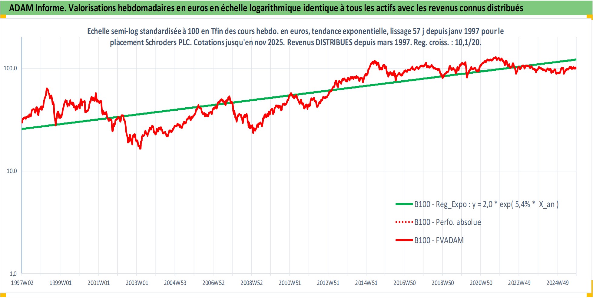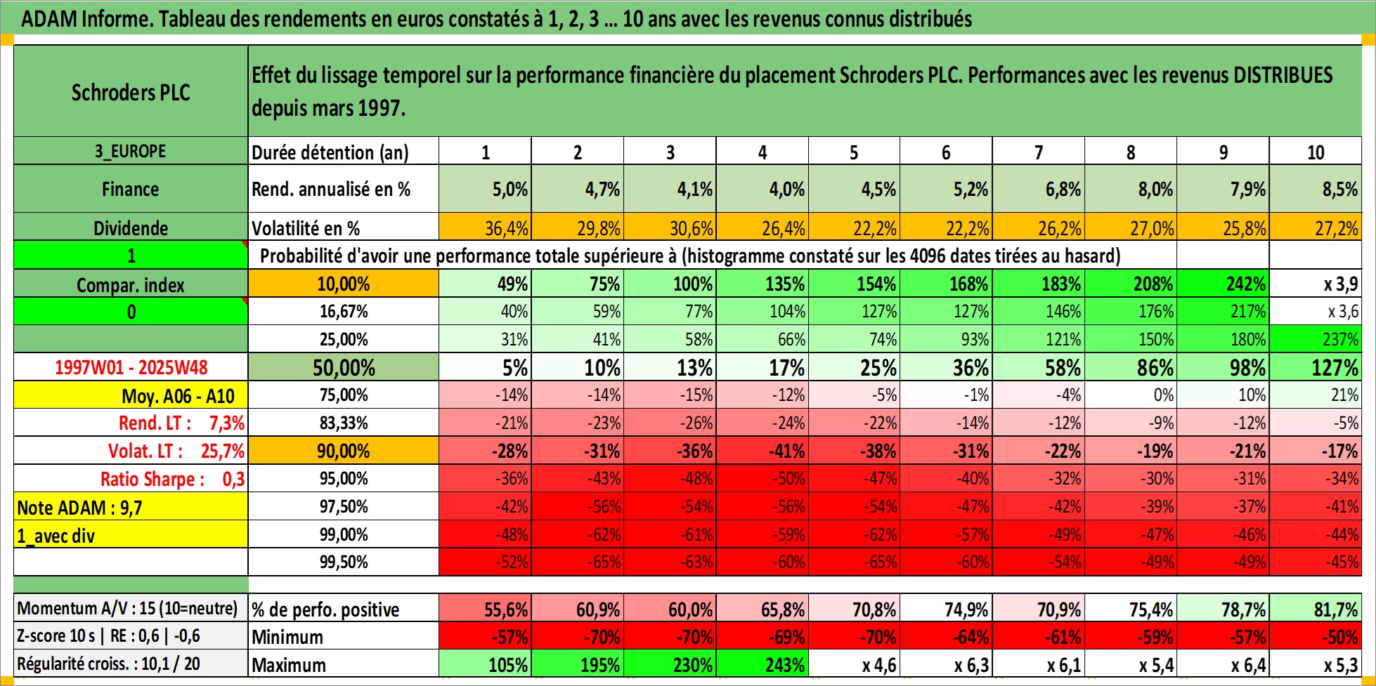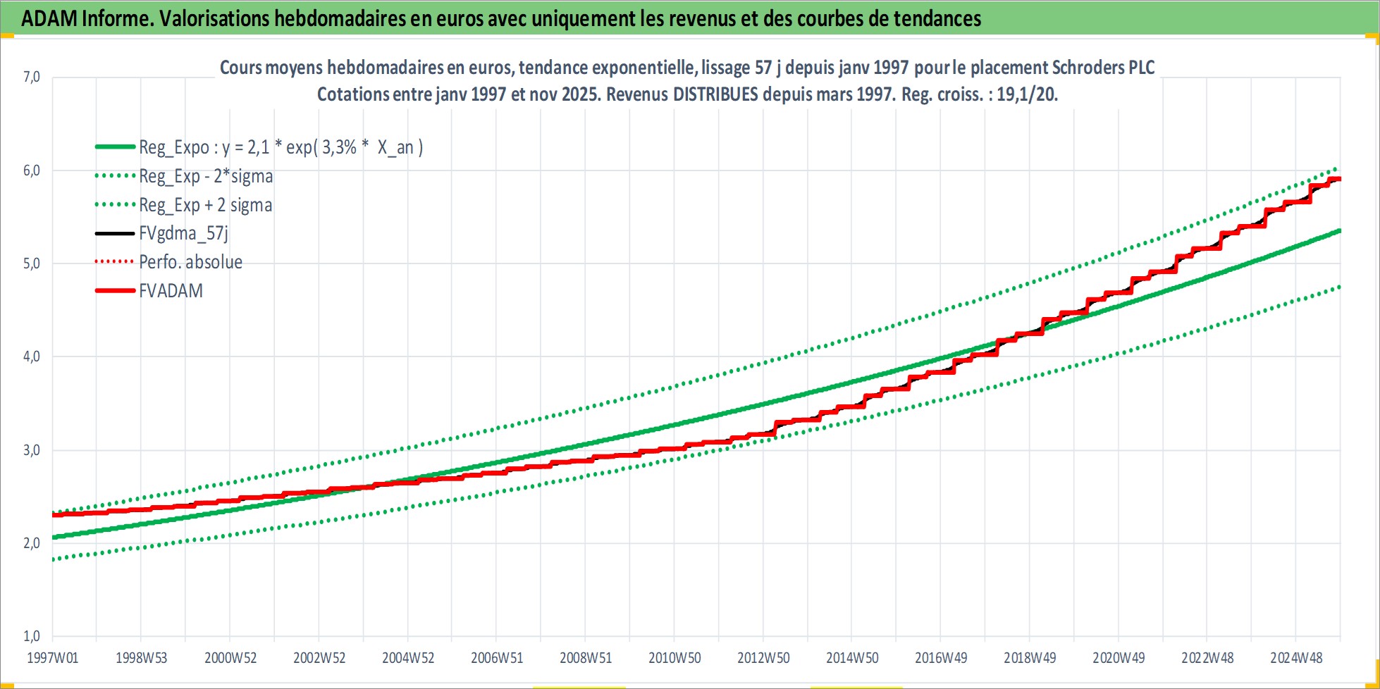 Site dédié aux investisseursPage dédiée sur site financeAnalyse des valorisations hebdomadaires de l'action Schroders PLC. Cet actif est cote en GBX. Les valorisations sont en contrevaleur EURO et couvrent les semaines 1997W01 a 2025W48. Les revenus de cet actif financier sont pris en compte depuis la semaine 1997W13. La note globale ESG de cet actif est estimee a 11.0 (apres rebasage entre 0 et 20).