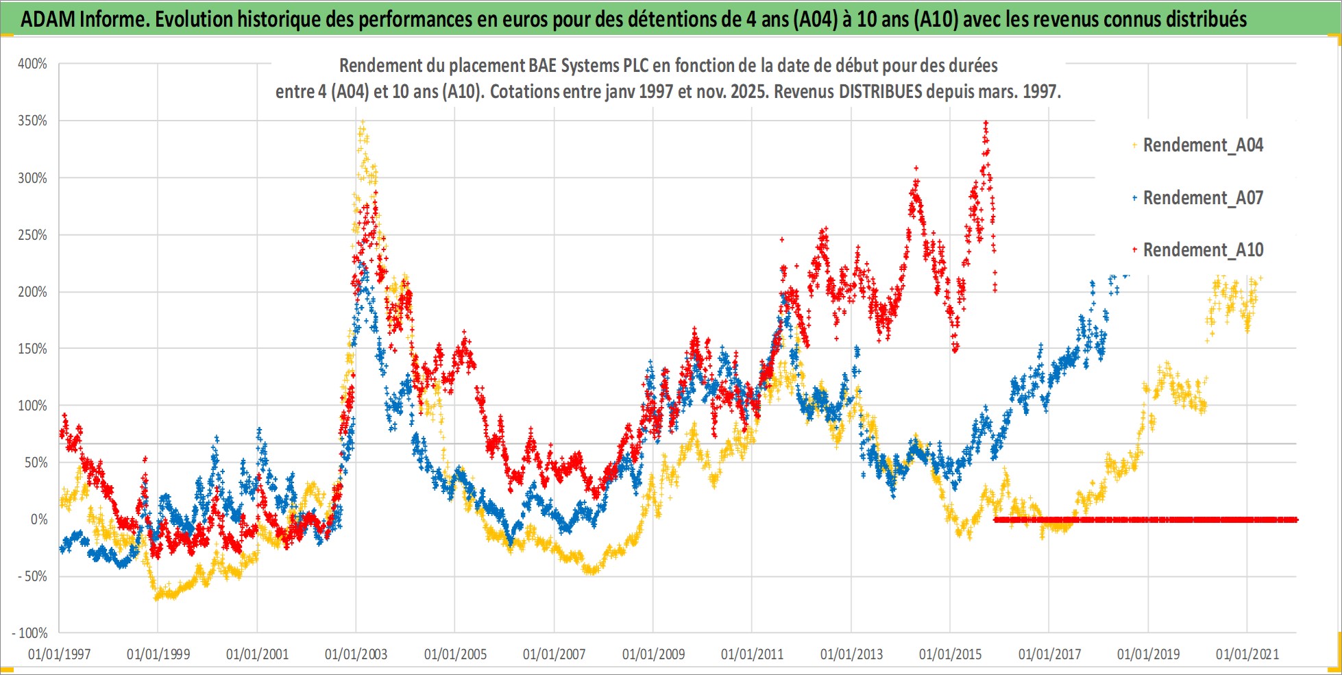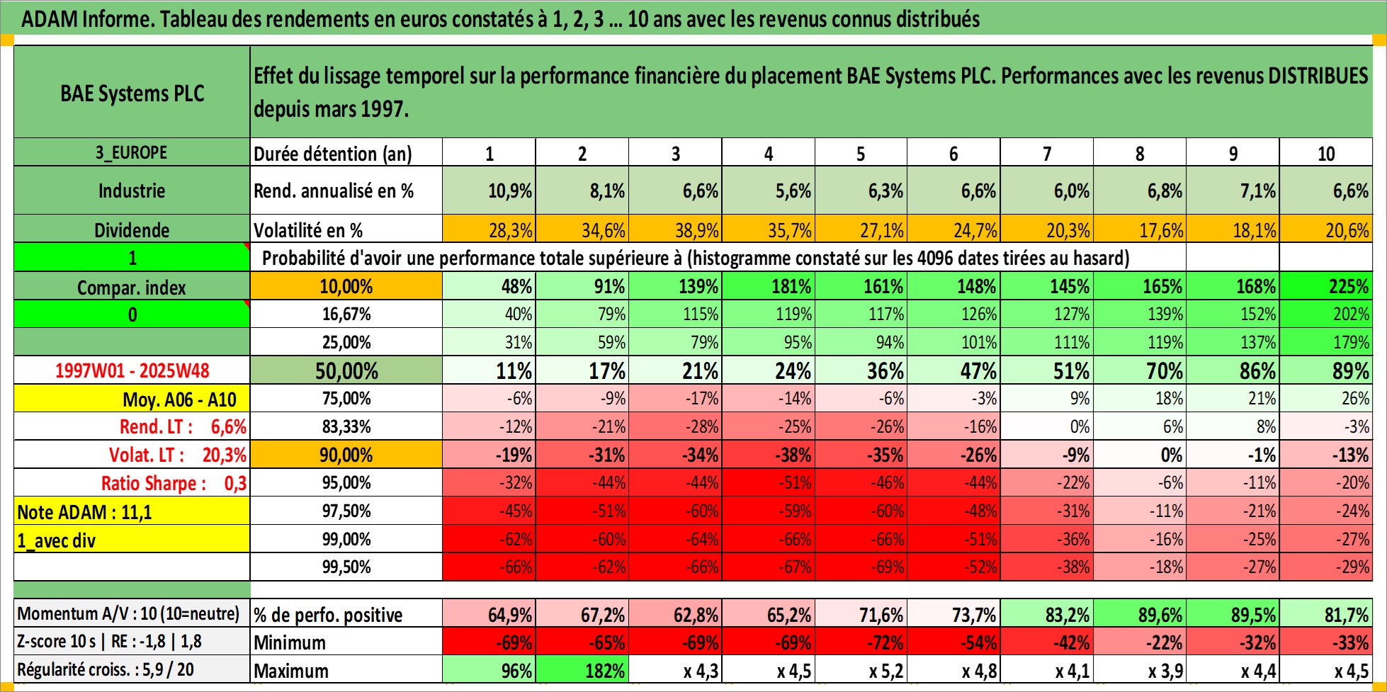 Site dédié aux investisseursPage dédiée sur site financeAnalyse des valorisations hebdomadaires de l'action BAE Systems PLC. Cet actif est cote en GBX. Les valorisations sont en contrevaleur EURO et couvrent les semaines 1997W01 a 2025W48. Les revenus de cet actif financier sont pris en compte depuis la semaine 1997W11. La note globale ESG de cet actif est estimee a 5.0 (apres rebasage entre 0 et 20).