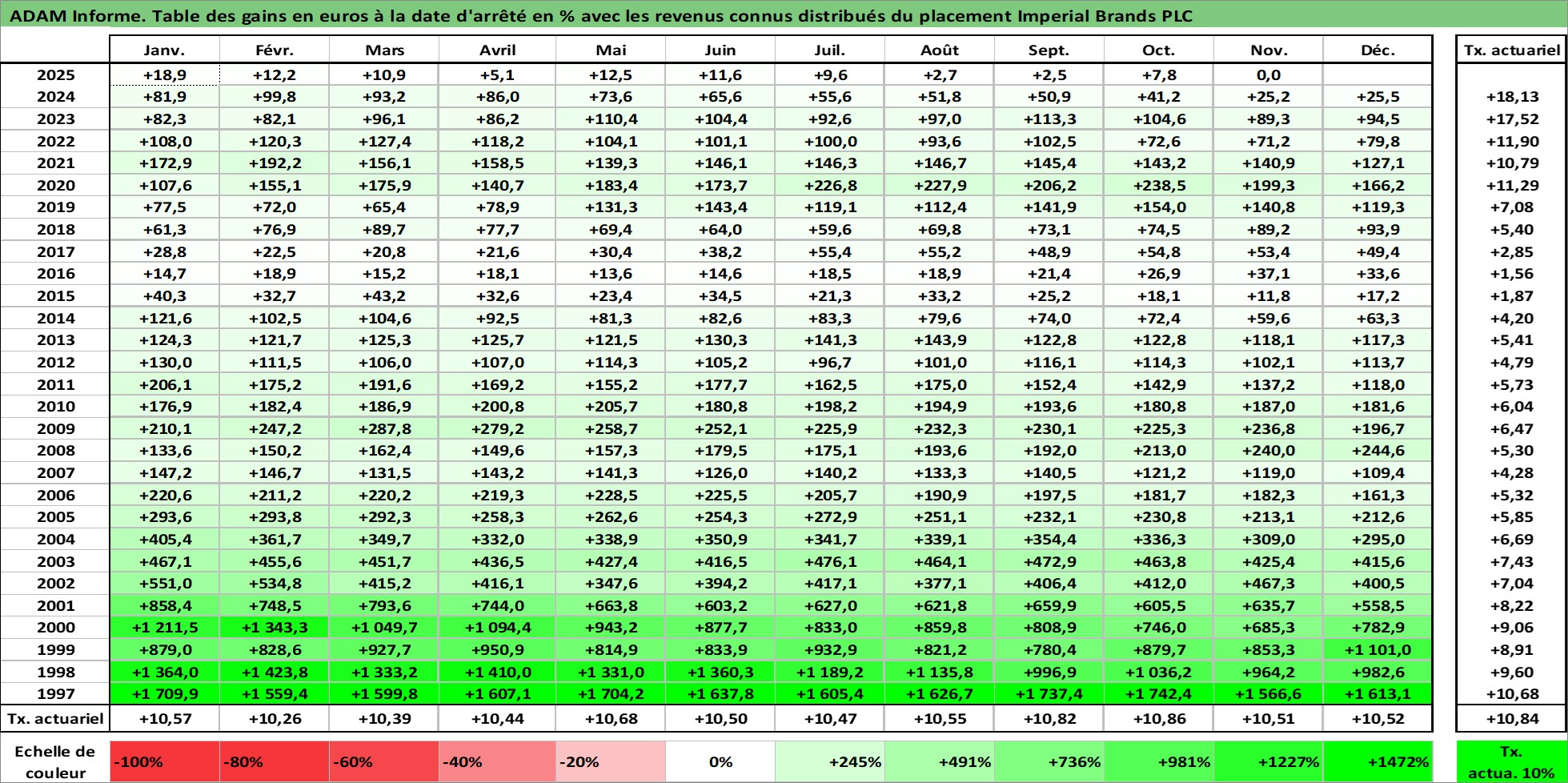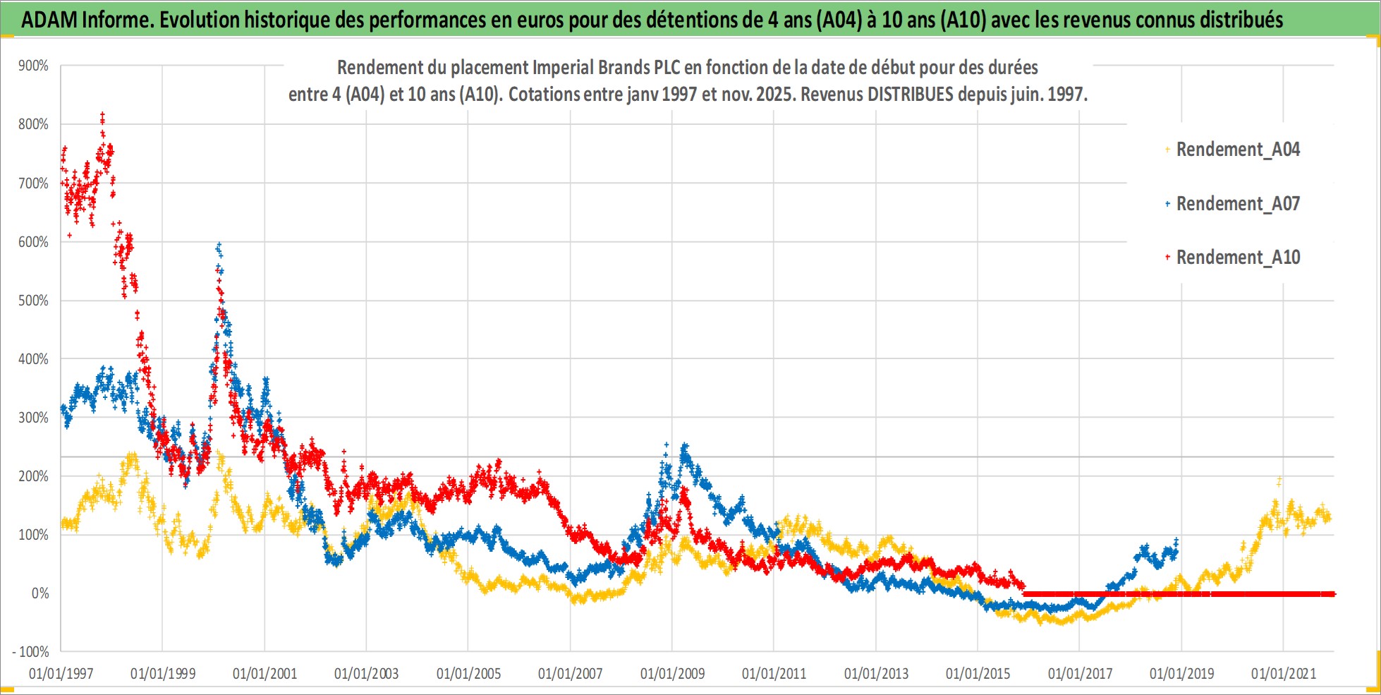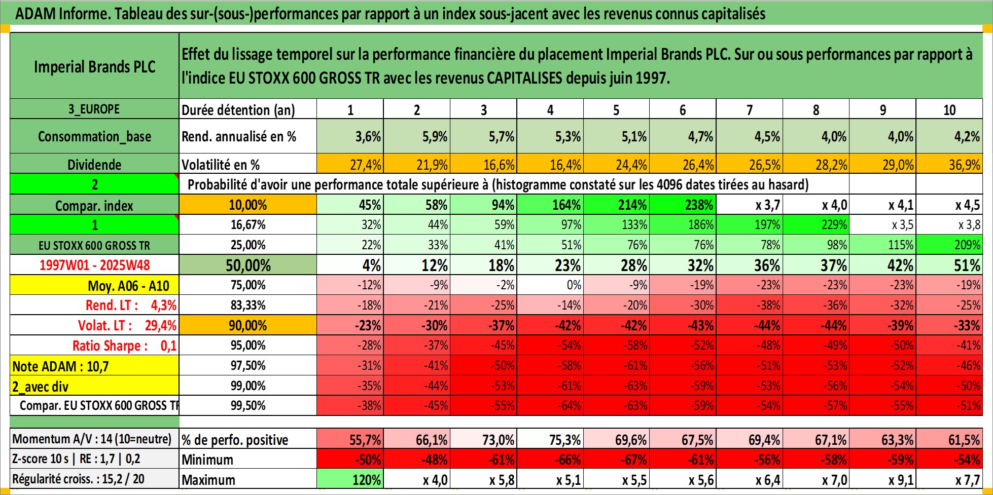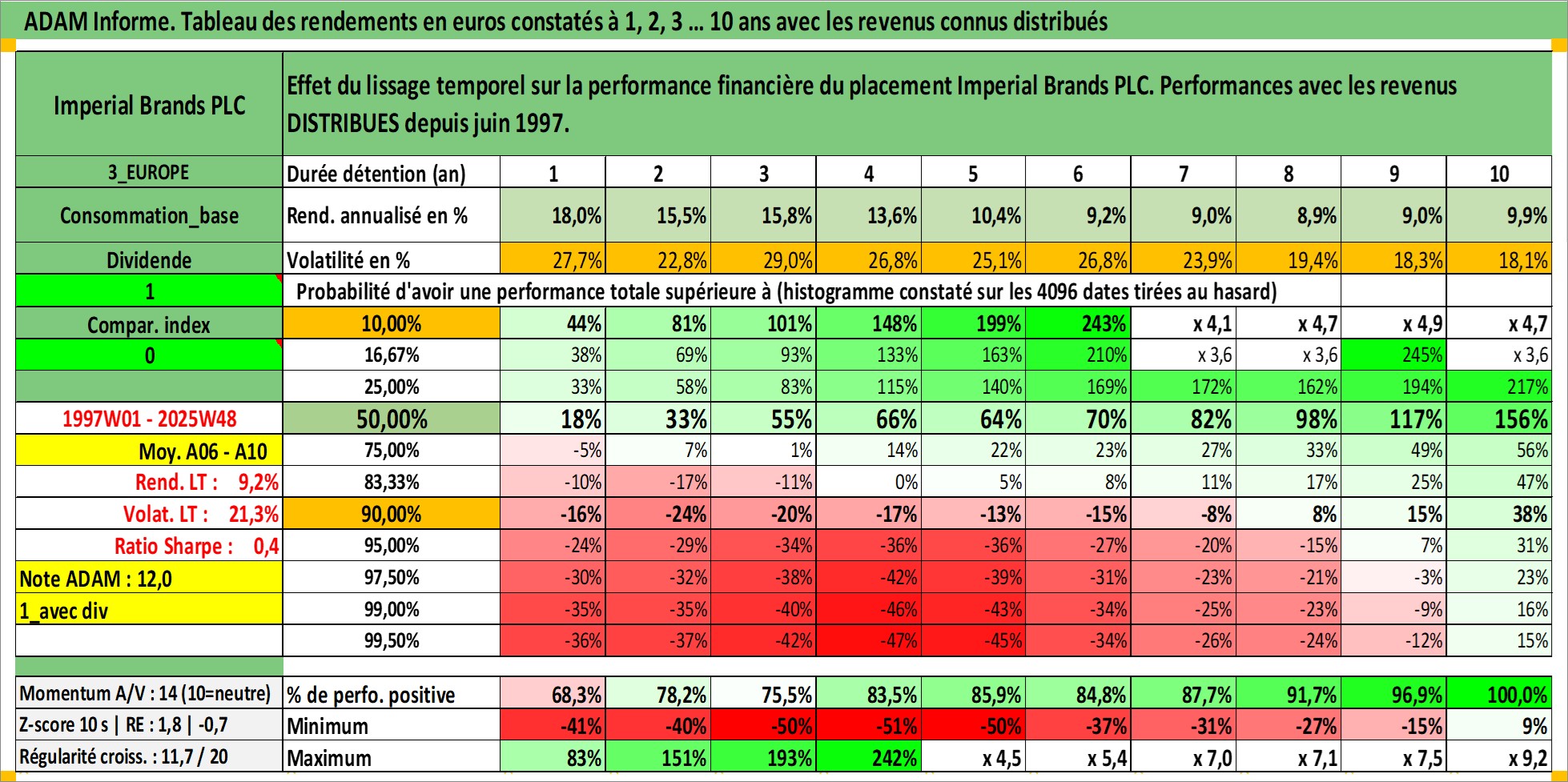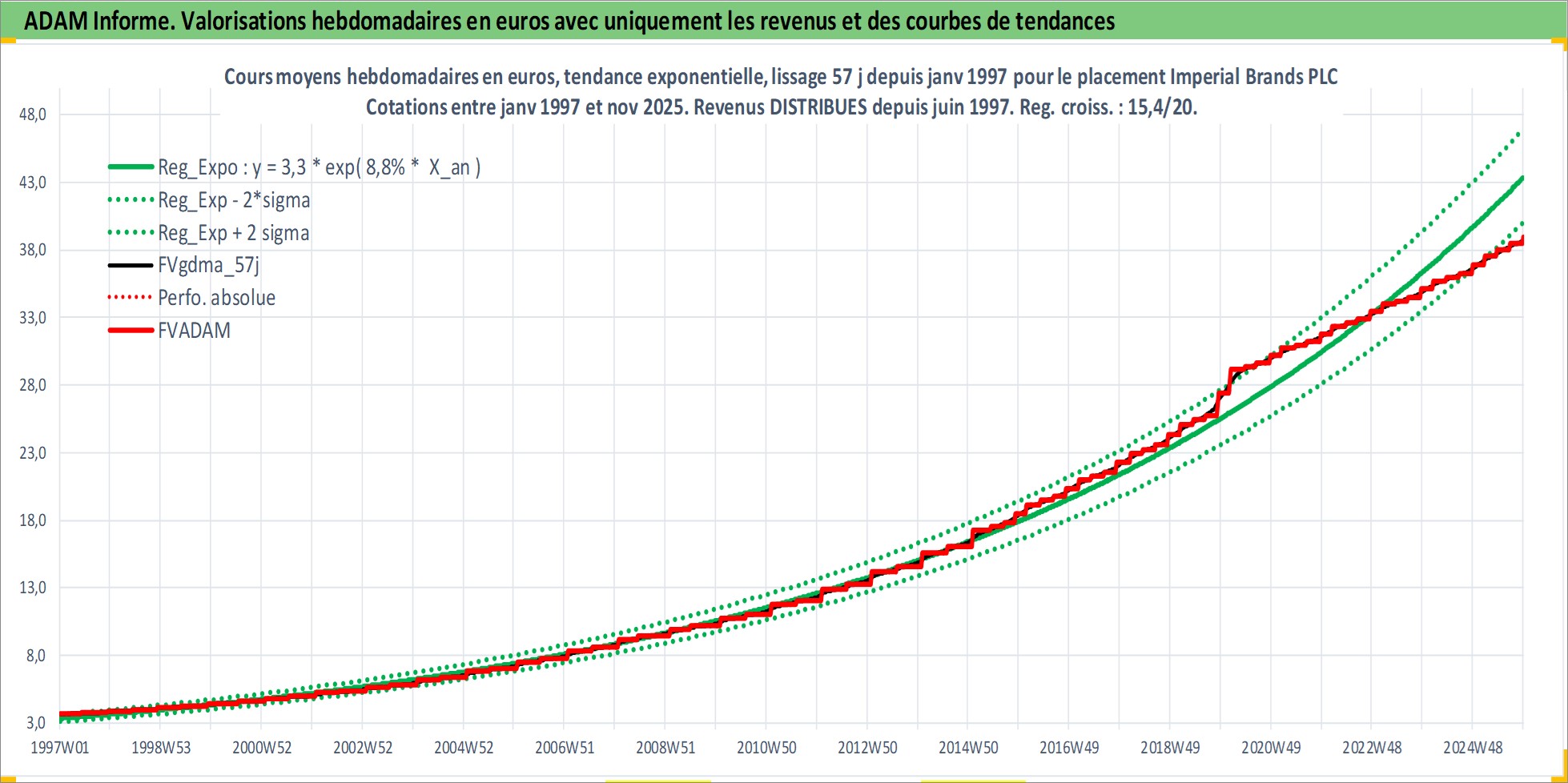 Site dédié aux investisseursPage dédiée sur site financeAnalyse des valorisations hebdomadaires de l'action Imperial Brands PLC. Cet actif est cote en GBX. Les valorisations sont en contrevaleur EURO et couvrent les semaines 1997W01 a 2025W48. Les revenus de cet actif financier sont pris en compte depuis la semaine 1997W23. La note globale ESG de cet actif est estimee a 6.0 (apres rebasage entre 0 et 20).