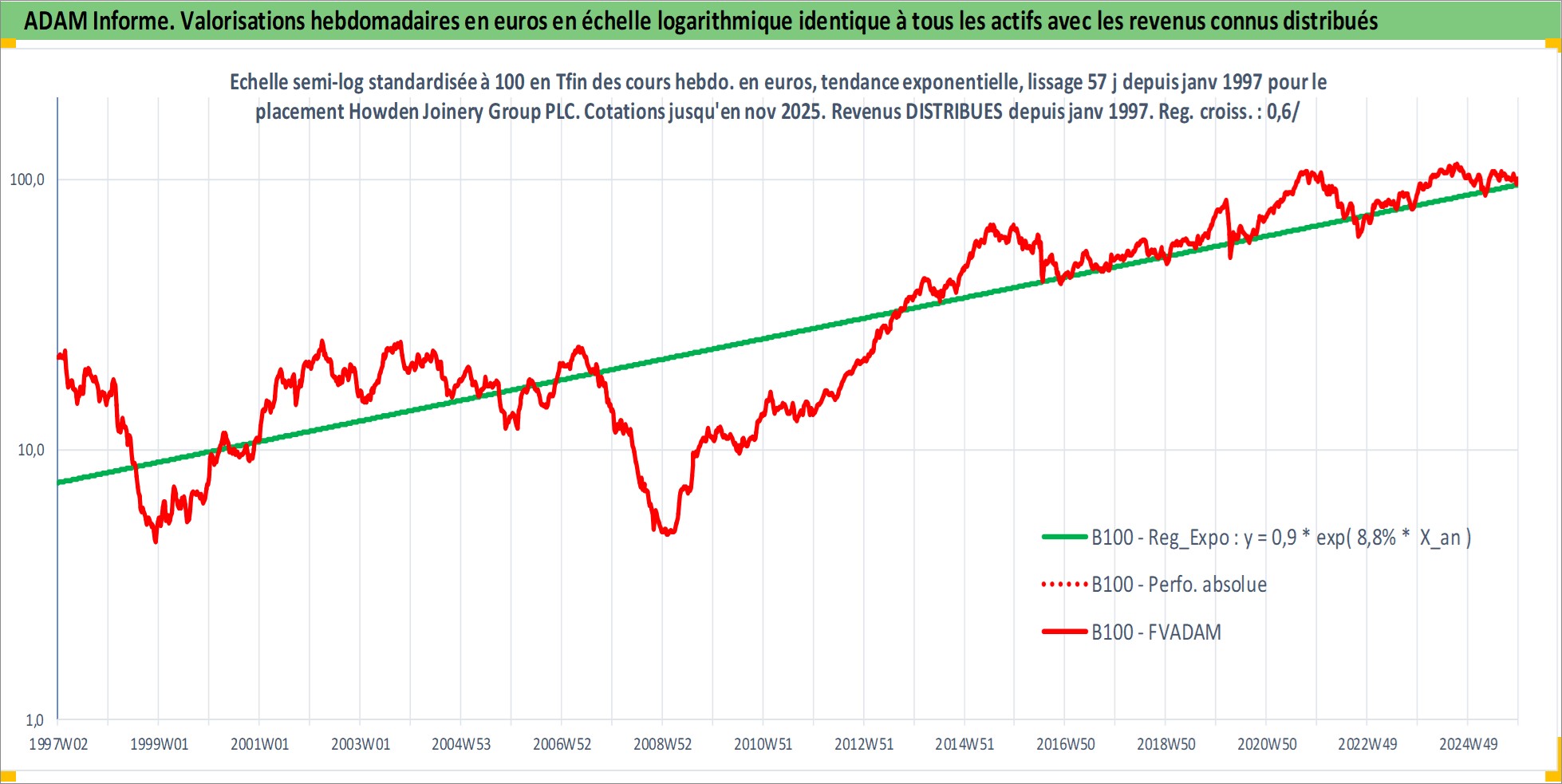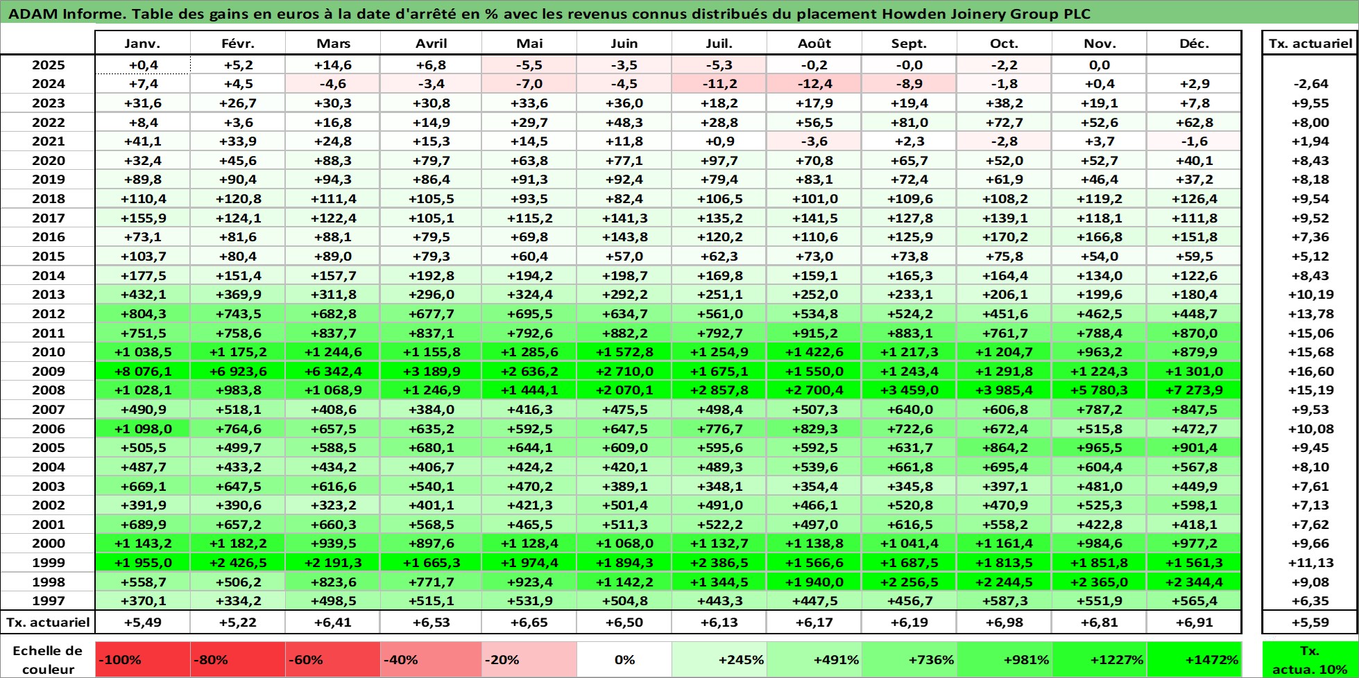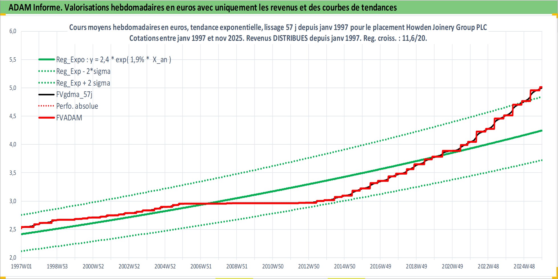 Site dédié aux investisseursPage dédiée sur site financeAnalyse des valorisations hebdomadaires de l'action Howden Joinery Group PLC. Cet actif est cote en GBX. Les valorisations sont en contrevaleur EURO et couvrent les semaines 1997W01 a 2025W48. Les revenus de cet actif financier sont pris en compte depuis la semaine 1997W02. La note ESG de cet actif n'est pas connue.