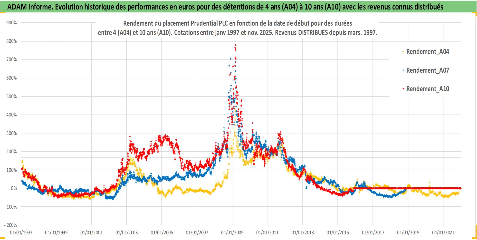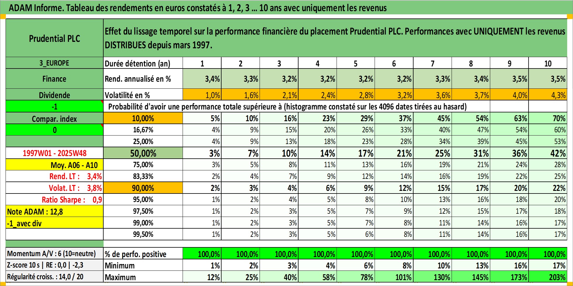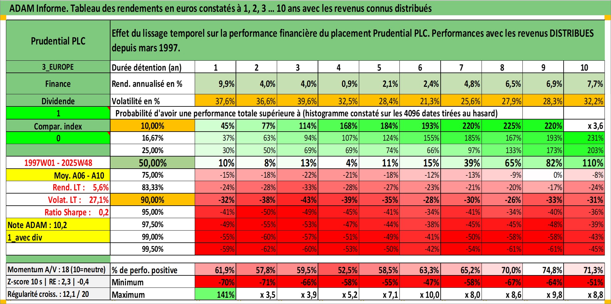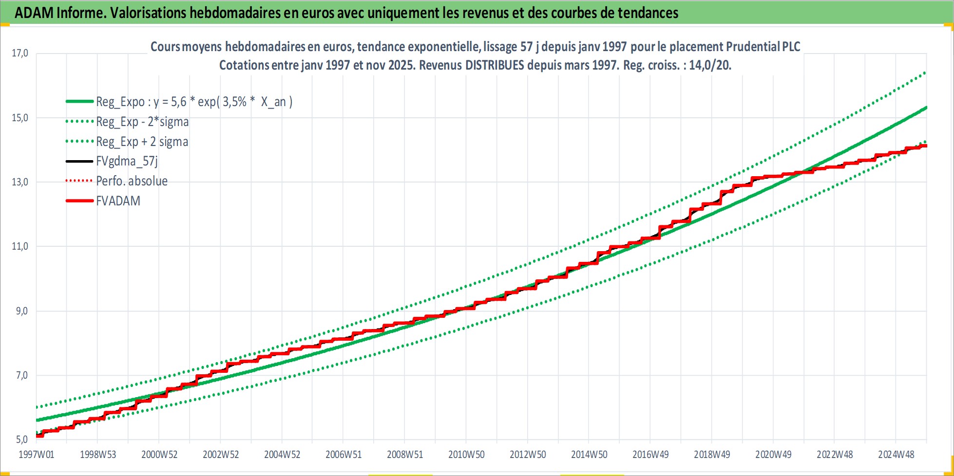 Site dédié aux investisseursPage dédiée sur site financeAnalyse des valorisations hebdomadaires de l'action Prudential PLC. Cet actif est cote en GBX. Les valorisations sont en contrevaleur EURO et couvrent les semaines 1997W01 a 2025W48. Les revenus de cet actif financier sont pris en compte depuis la semaine 1997W13. La note globale ESG de cet actif est estimee a 13.0 (apres rebasage entre 0 et 20).