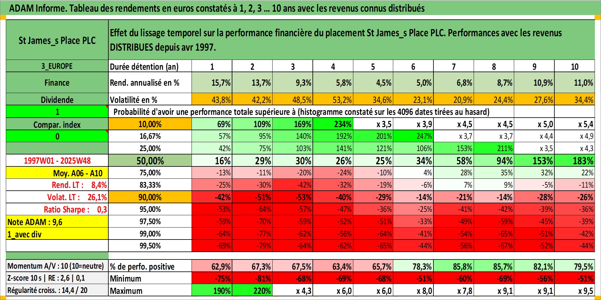 Site dédié aux investisseursPage dédiée sur site financeAnalyse des valorisations hebdomadaires de l'action St James_s Place PLC. Cet actif est cote en GBX. Les valorisations sont en contrevaleur EURO et couvrent les semaines 1997W01 a 2025W48. Les revenus de cet actif financier sont pris en compte depuis la semaine 1997W17. La note globale ESG de cet actif est estimee a 11.0 (apres rebasage entre 0 et 20).