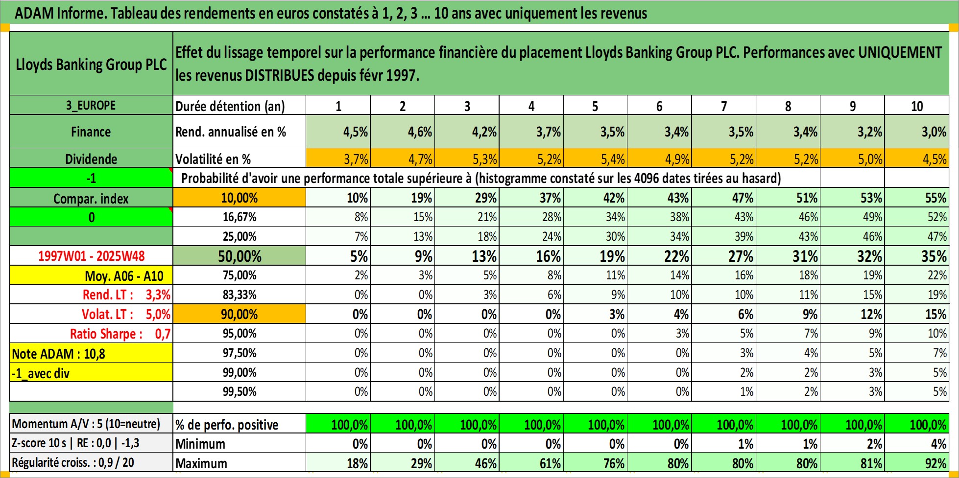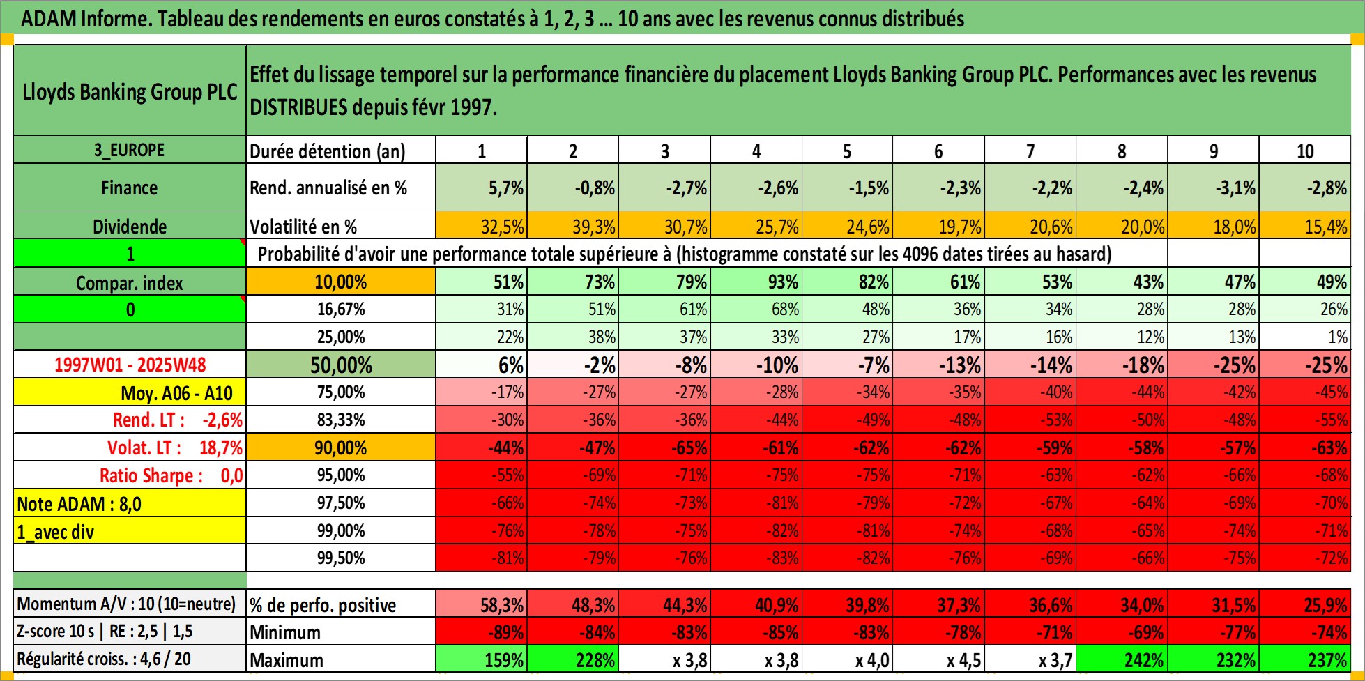 Site dédié aux investisseursPage dédiée sur site financeAnalyse des valorisations hebdomadaires de l'action Lloyds Banking Group PLC. Cet actif est cote en GBX. Les valorisations sont en contrevaleur EURO et couvrent les semaines 1997W01 a 2025W48. Les revenus de cet actif financier sont pris en compte depuis la semaine 1997W09. La note globale ESG de cet actif est estimee a 10.0 (apres rebasage entre 0 et 20).