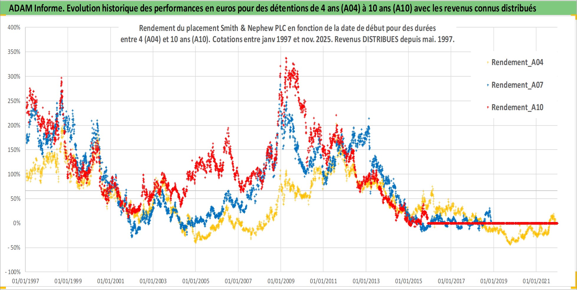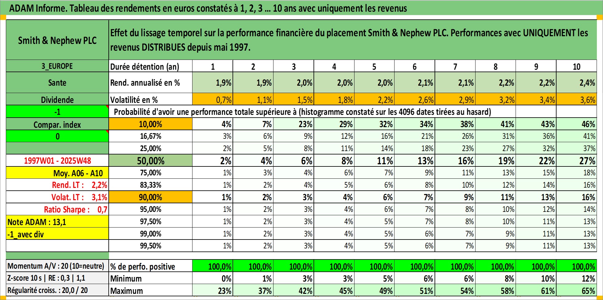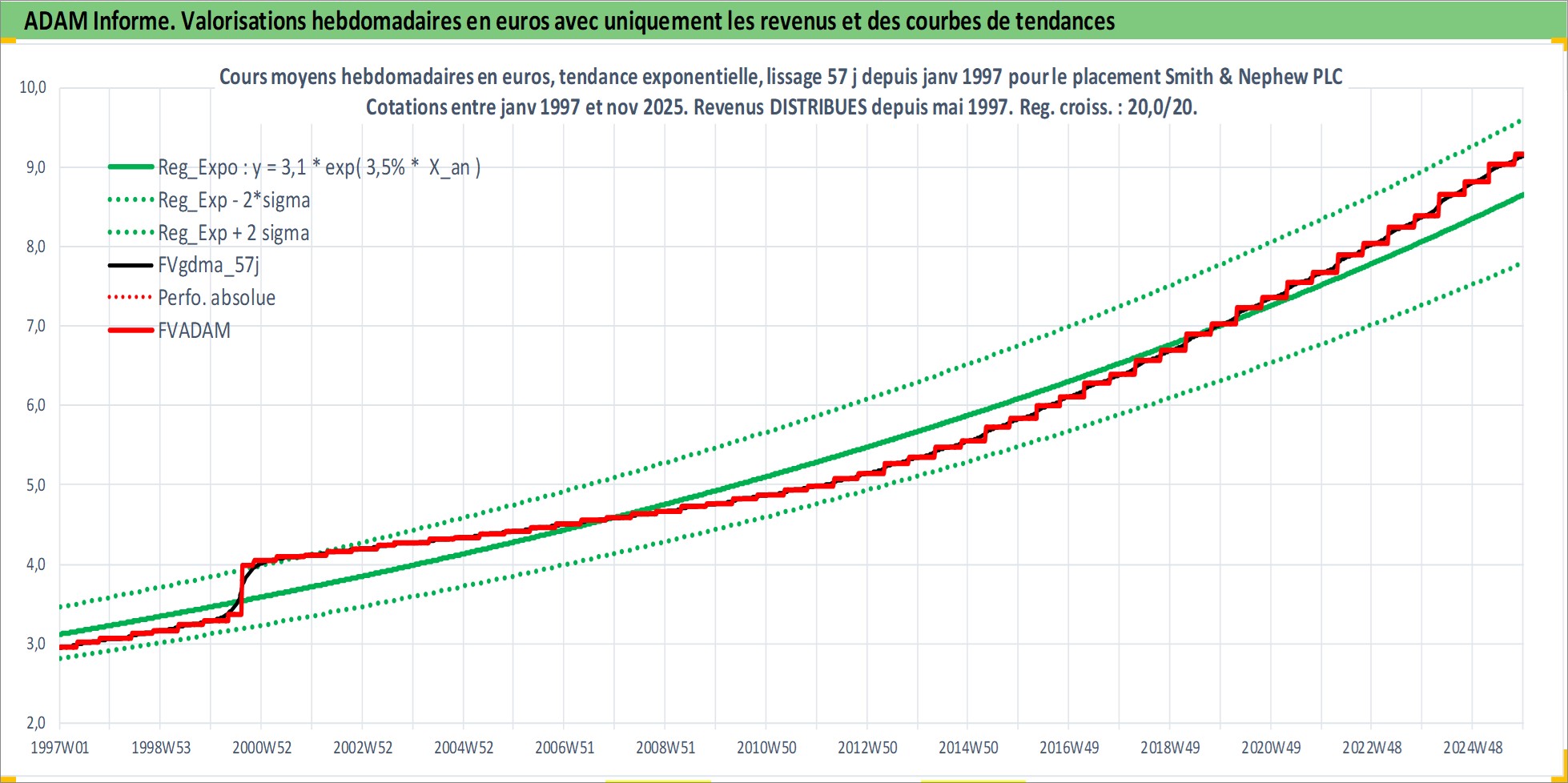 Site dédié aux investisseursPage dédiée sur site financeAnalyse des valorisations hebdomadaires de l'action Smith & Nephew PLC. Cet actif est cote en GBX. Les valorisations sont en contrevaleur EURO et couvrent les semaines 1997W01 a 2025W48. Les revenus de cet actif financier sont pris en compte depuis la semaine 1997W19. La note globale ESG de cet actif est estimee a 7.0 (apres rebasage entre 0 et 20).