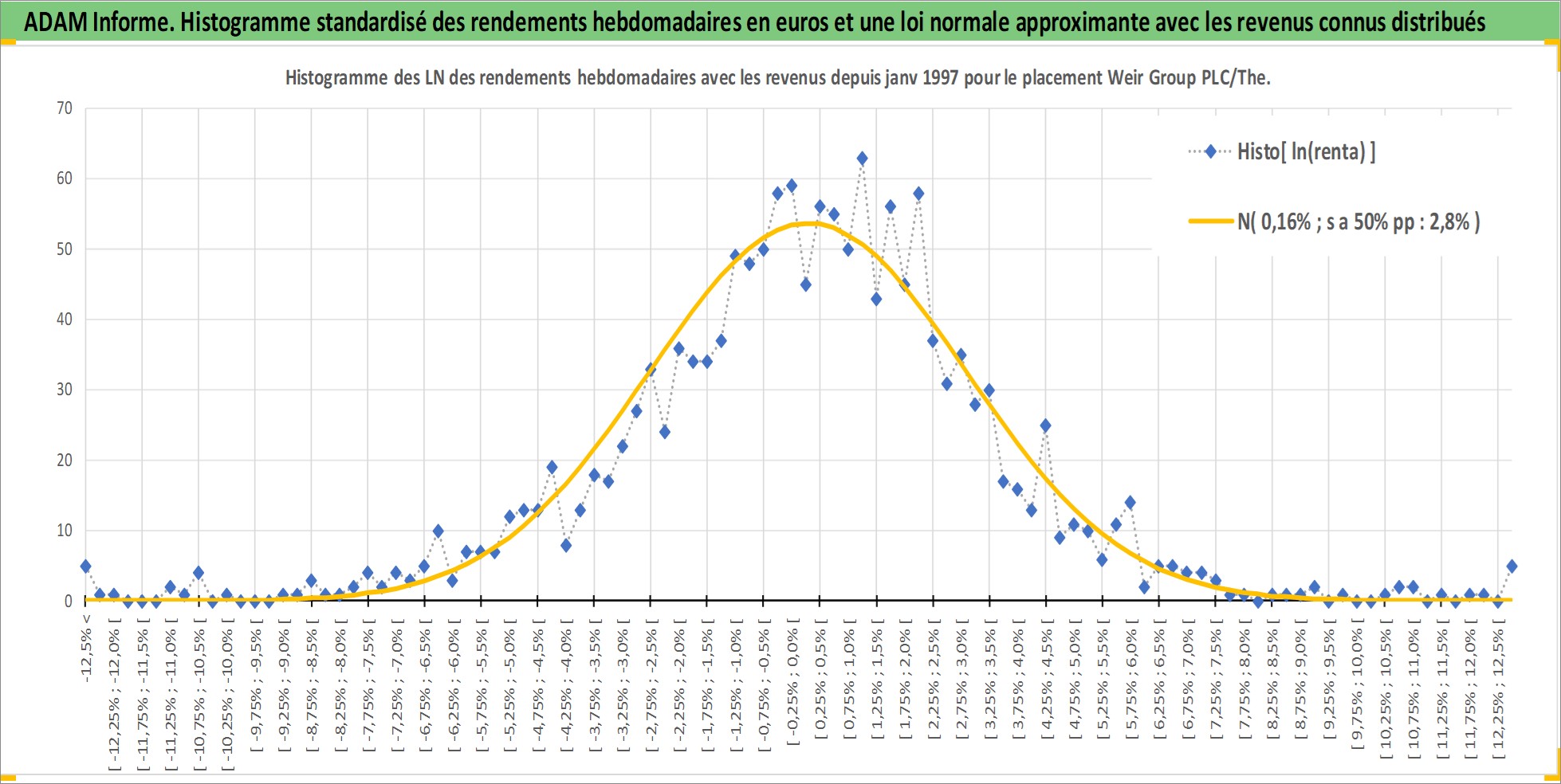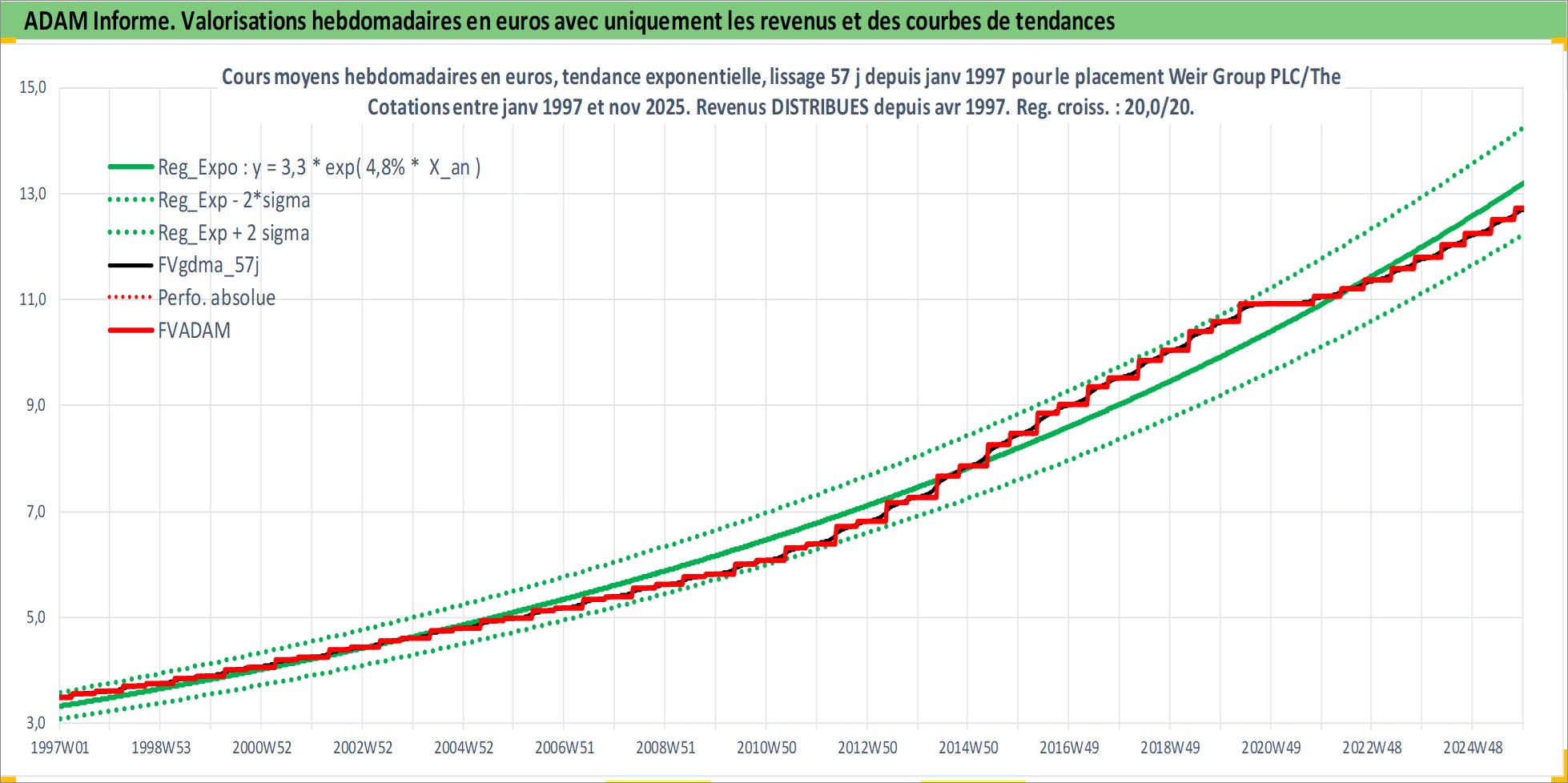 Site dédié aux investisseursPage dédiée sur site financeAnalyse des valorisations hebdomadaires de l'action Weir Group PLC/The. Cet actif est cote en GBX. Les valorisations sont en contrevaleur EURO et couvrent les semaines 1997W01 a 2025W48. Les revenus de cet actif financier sont pris en compte depuis la semaine 1997W14. La note globale ESG de cet actif est estimee a 9.0 (apres rebasage entre 0 et 20).
