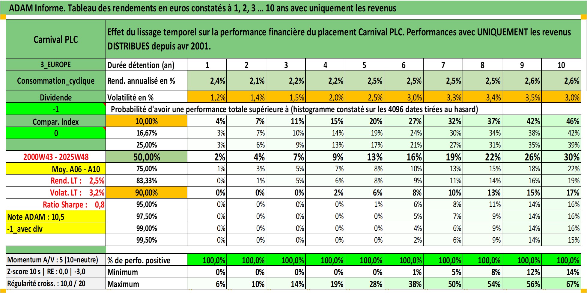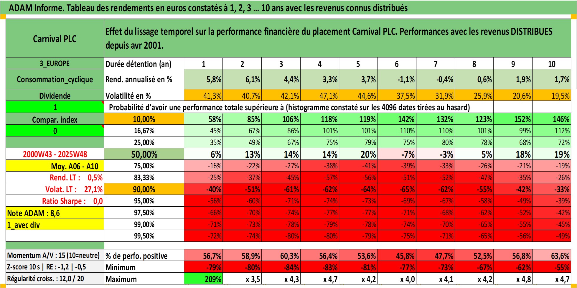 Site dédié aux investisseursPage dédiée sur site financeAnalyse des valorisations hebdomadaires de l'action Carnival PLC. Cet actif est cote en GBX. Les valorisations sont en contrevaleur EURO et couvrent les semaines 2000W43 a 2025W48. Les revenus de cet actif financier sont pris en compte depuis la semaine 2001W14. La note globale ESG de cet actif est estimee a 8.0 (apres rebasage entre 0 et 20).