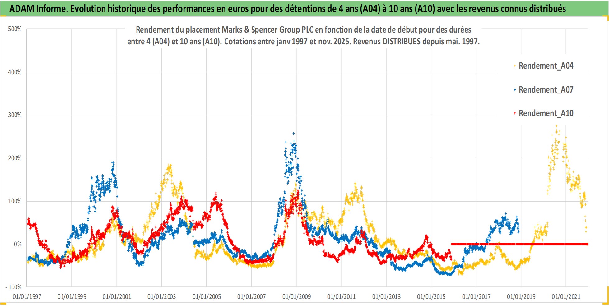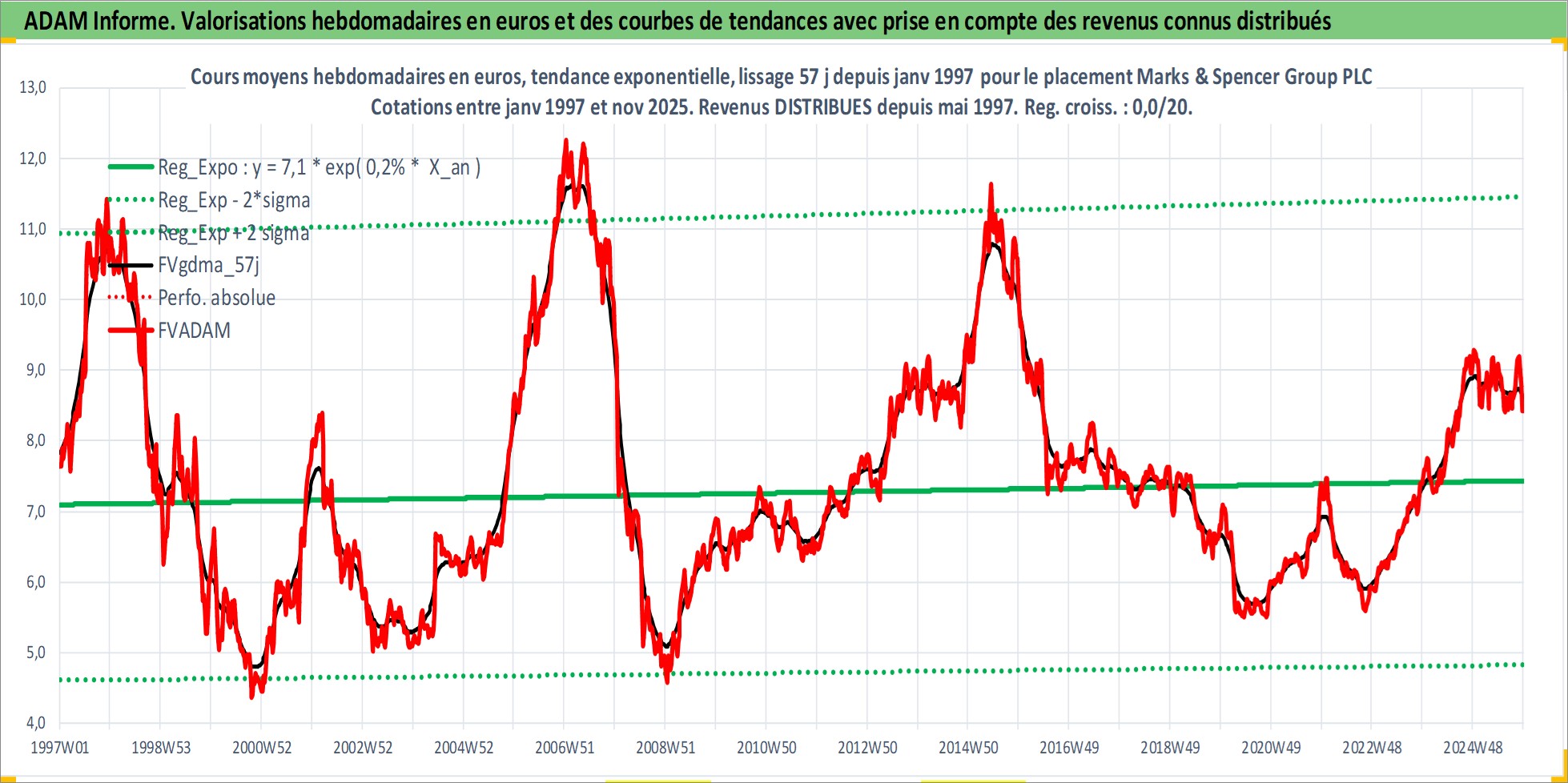 Site dédié aux investisseursPage dédiée sur site financeAnalyse des valorisations hebdomadaires de l'action Marks & Spencer Group PLC. Cet actif est cote en GBX. Les valorisations sont en contrevaleur EURO et couvrent les semaines 1997W01 a 2025W48. Les revenus de cet actif financier sont pris en compte depuis la semaine 1997W22. La note globale ESG de cet actif est estimee a 9.0 (apres rebasage entre 0 et 20).