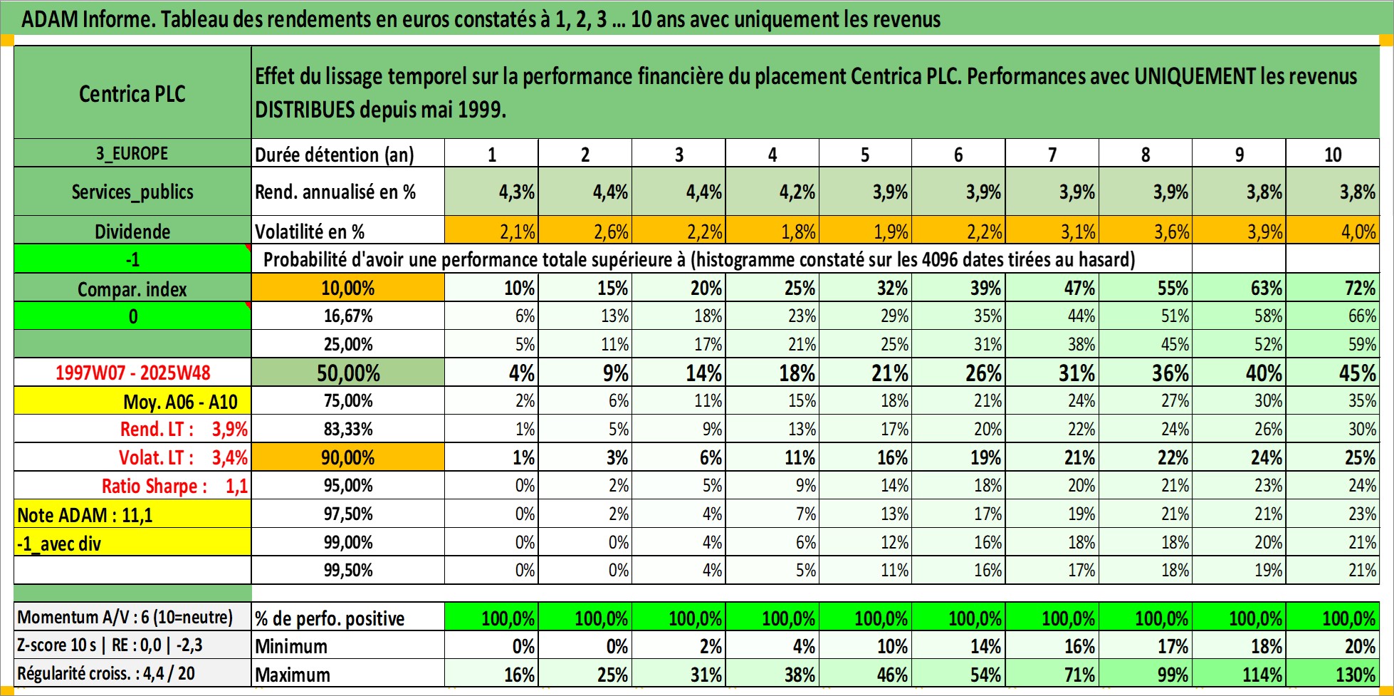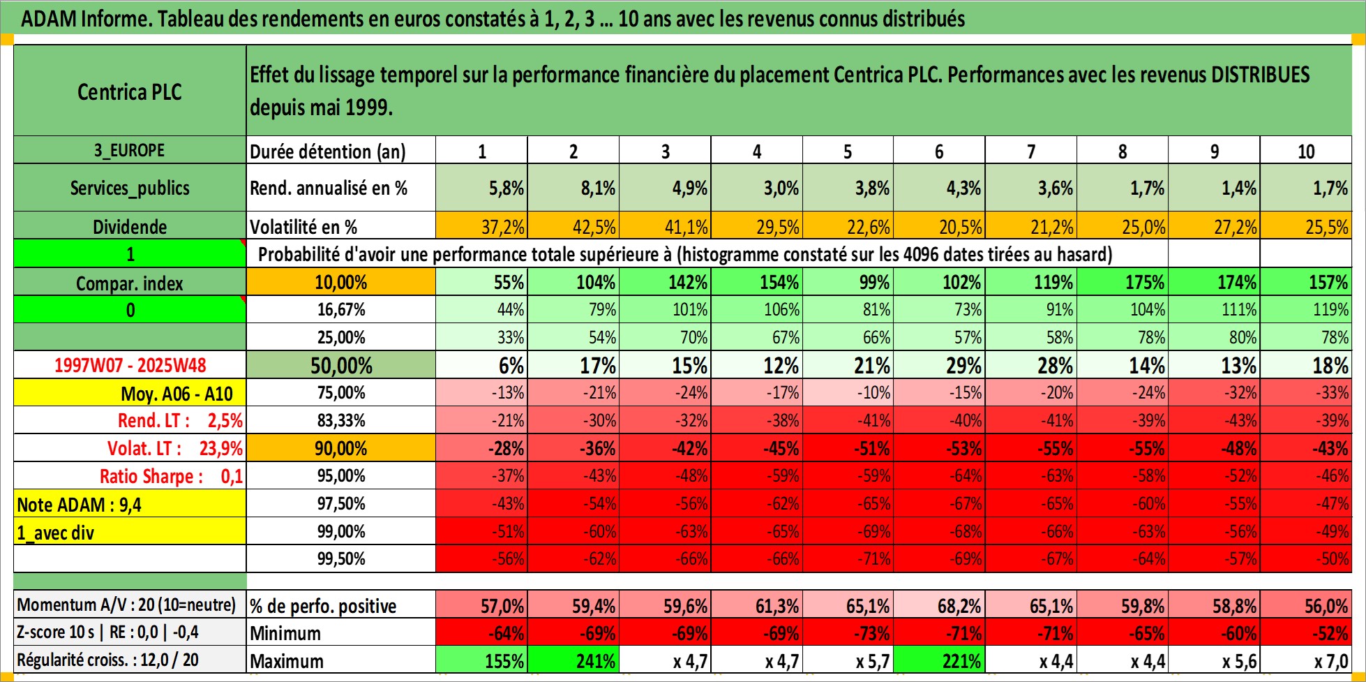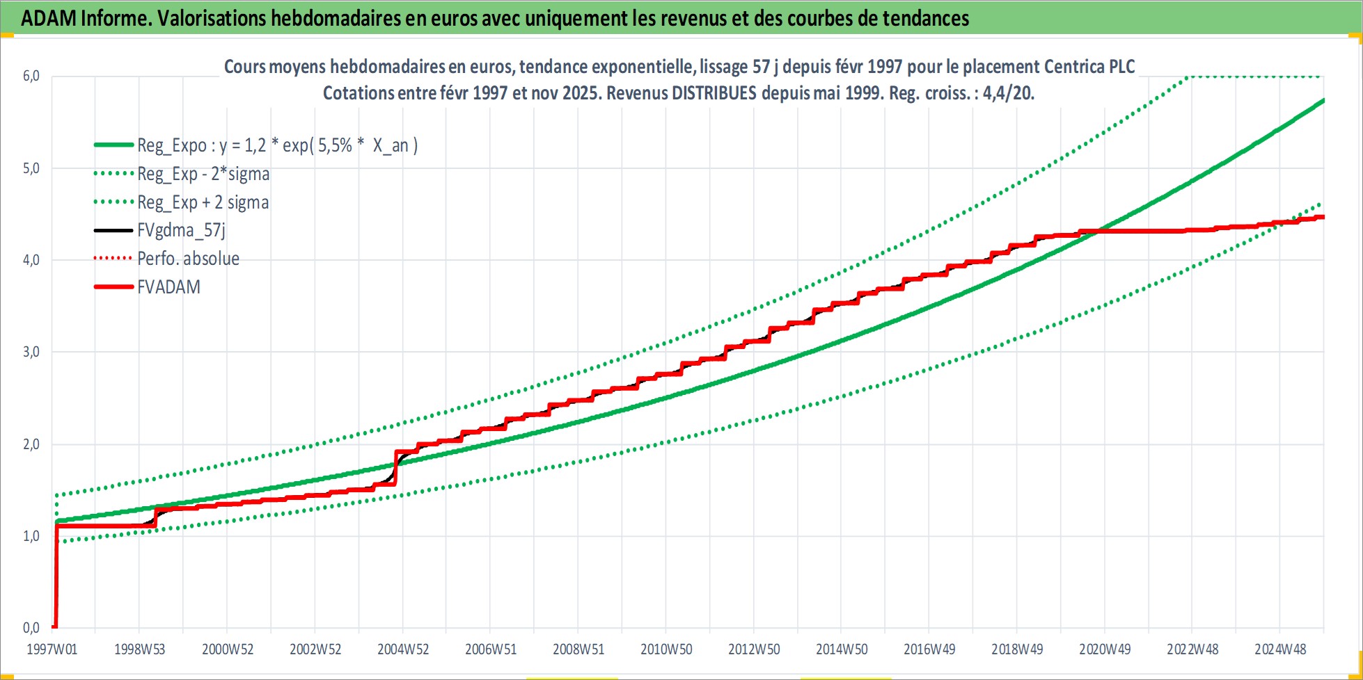 Site dédié aux investisseursPage dédiée sur site financeAnalyse des valorisations hebdomadaires de l'action Centrica PLC. Cet actif est cote en GBX. Les valorisations sont en contrevaleur EURO et couvrent les semaines 1997W07 a 2025W48. Les revenus de cet actif financier sont pris en compte depuis la semaine 1999W19. La note globale ESG de cet actif est estimee a 7.0 (apres rebasage entre 0 et 20).