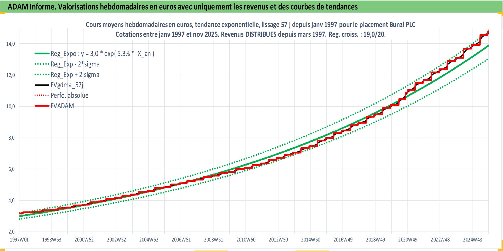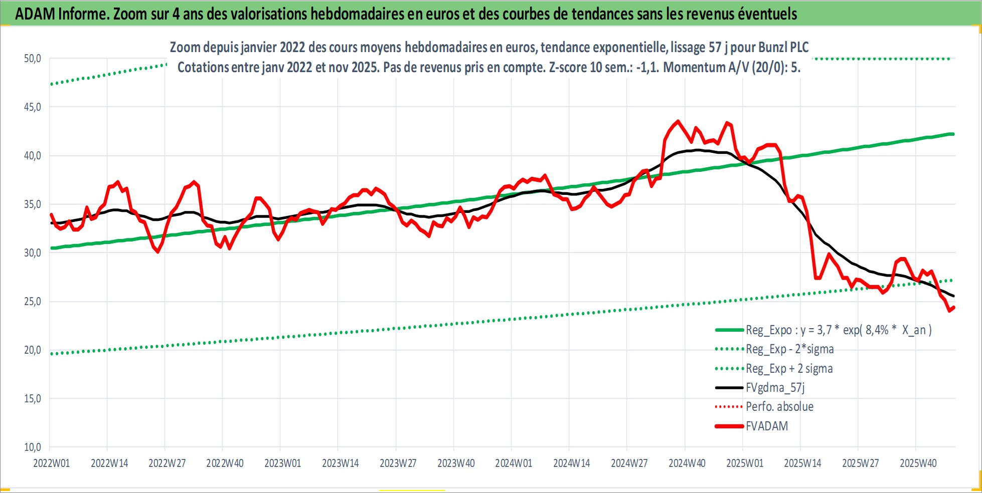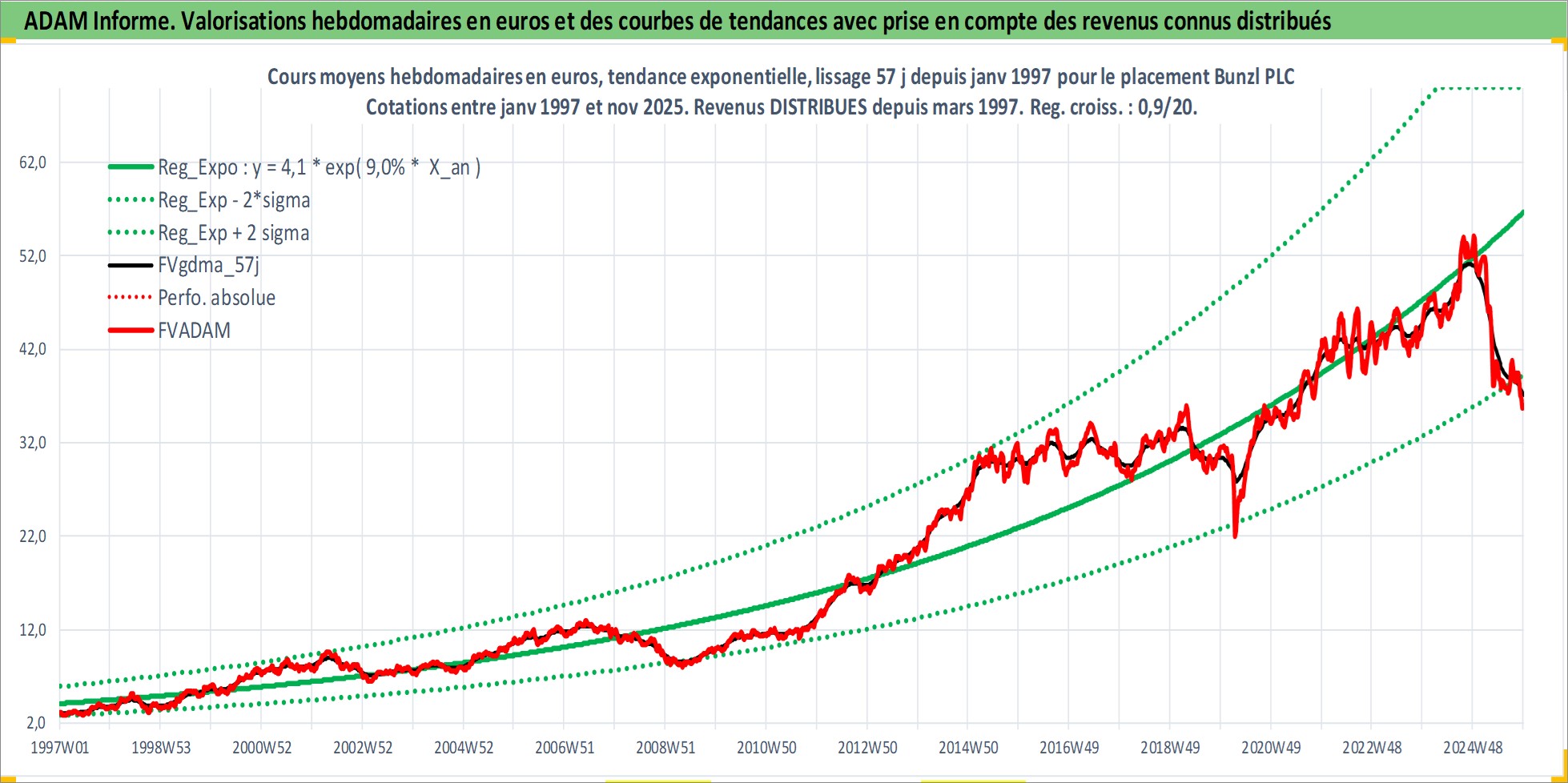 Site dédié aux investisseursPage dédiée sur site financeAnalyse des valorisations hebdomadaires de l'action Bunzl PLC. Cet actif est cote en GBX. Les valorisations sont en contrevaleur EURO et couvrent les semaines 1997W01 a 2025W48. Les revenus de cet actif financier sont pris en compte depuis la semaine 1997W13. La note globale ESG de cet actif est estimee a 13.0 (apres rebasage entre 0 et 20).