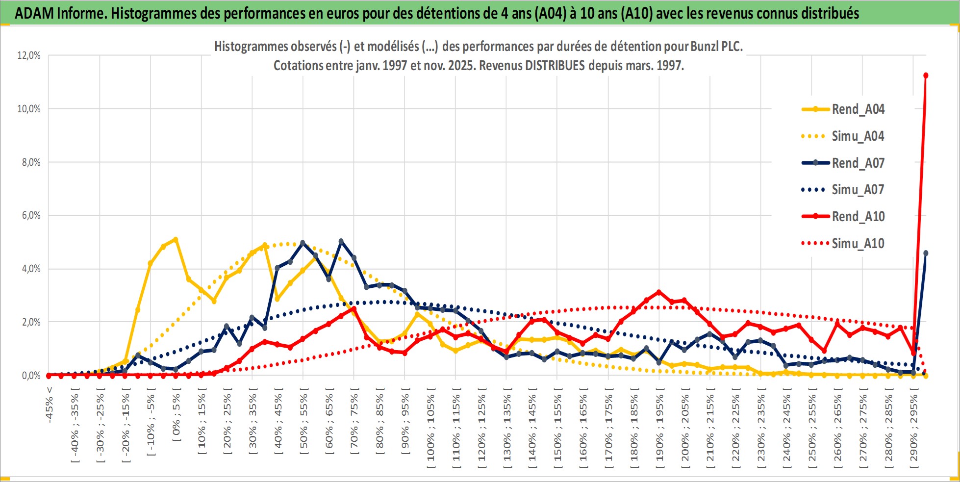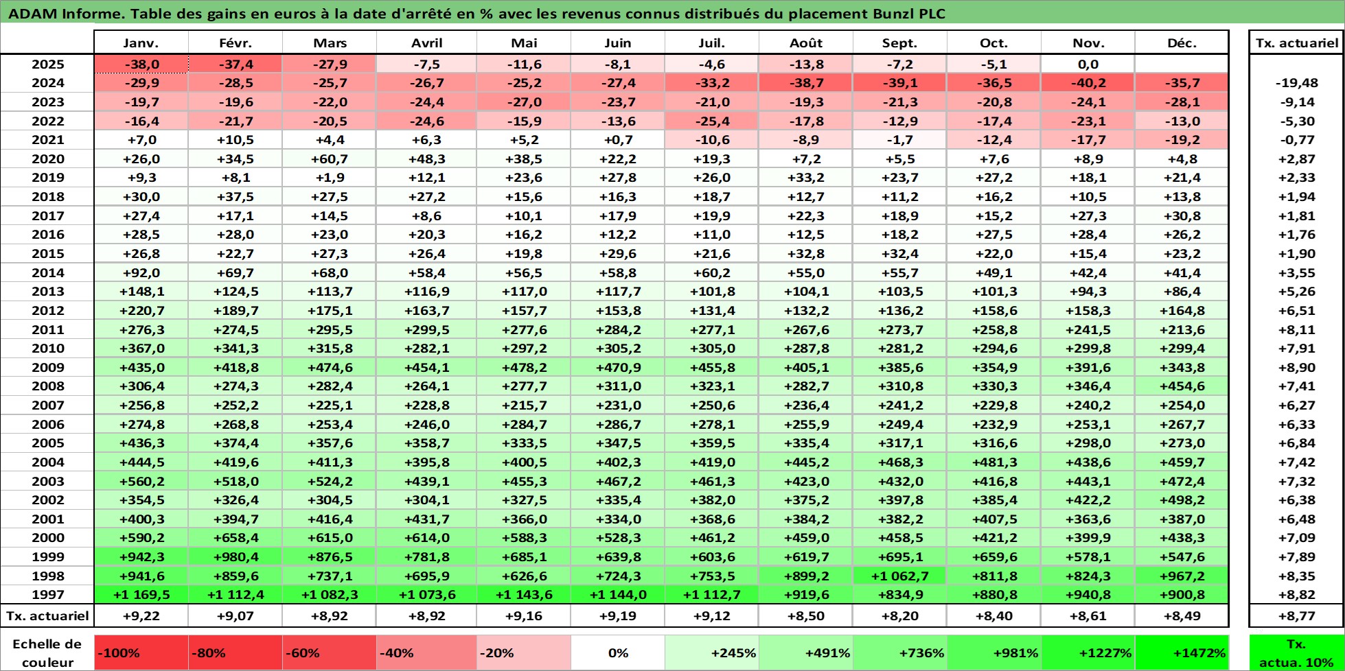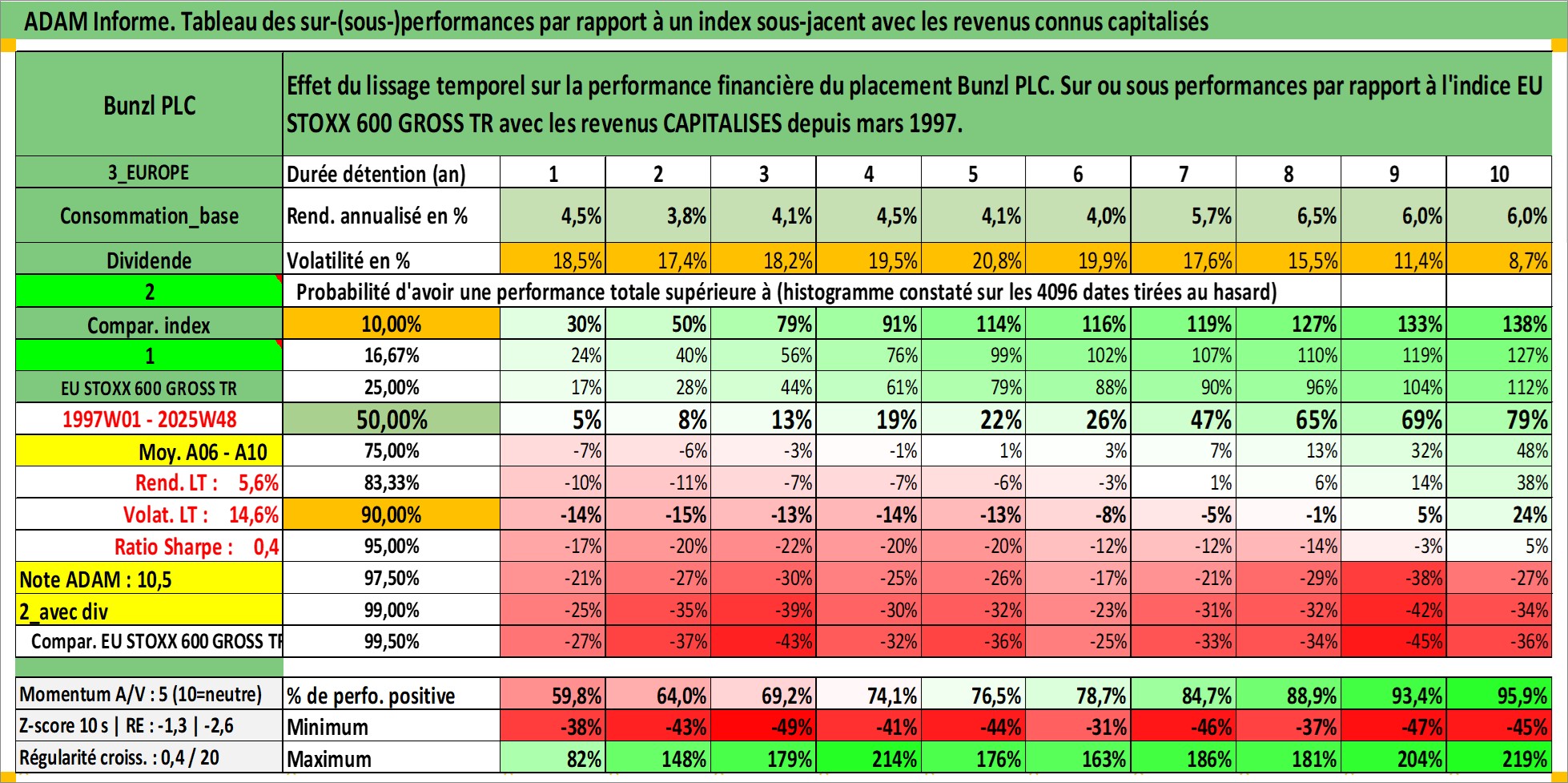 Site dédié aux investisseursPage dédiée sur site financeAnalyse des valorisations hebdomadaires de l'action Bunzl PLC. Cet actif est cote en GBX. Les valorisations sont en contrevaleur EURO et couvrent les semaines 1997W01 a 2025W48. Les revenus de cet actif financier sont pris en compte depuis la semaine 1997W13. La note globale ESG de cet actif est estimee a 13.0 (apres rebasage entre 0 et 20).