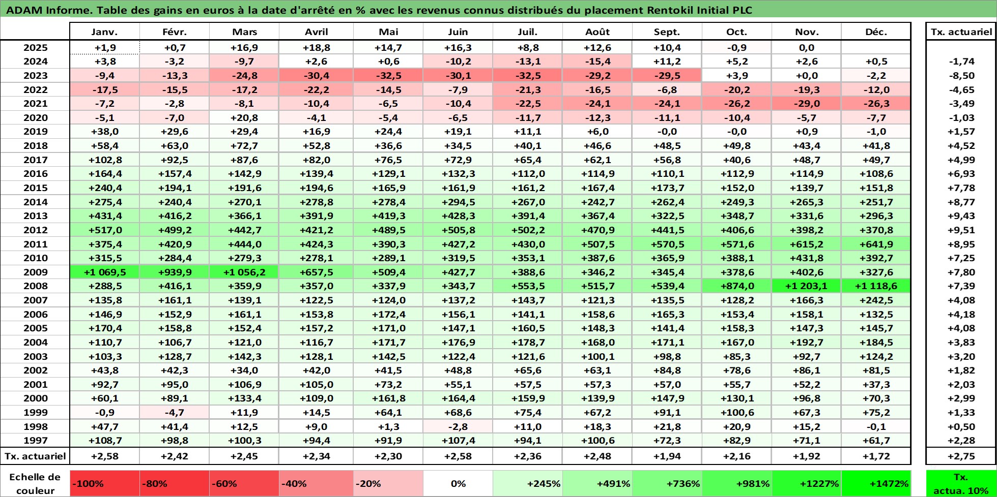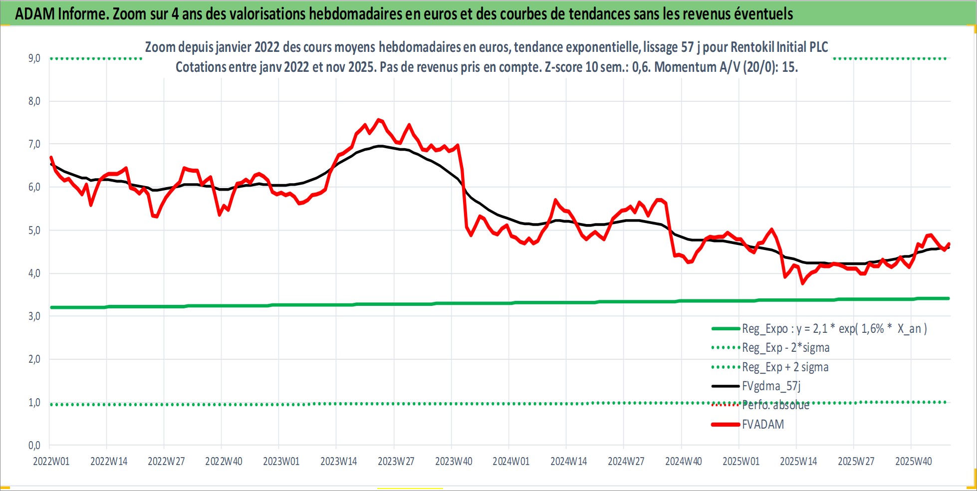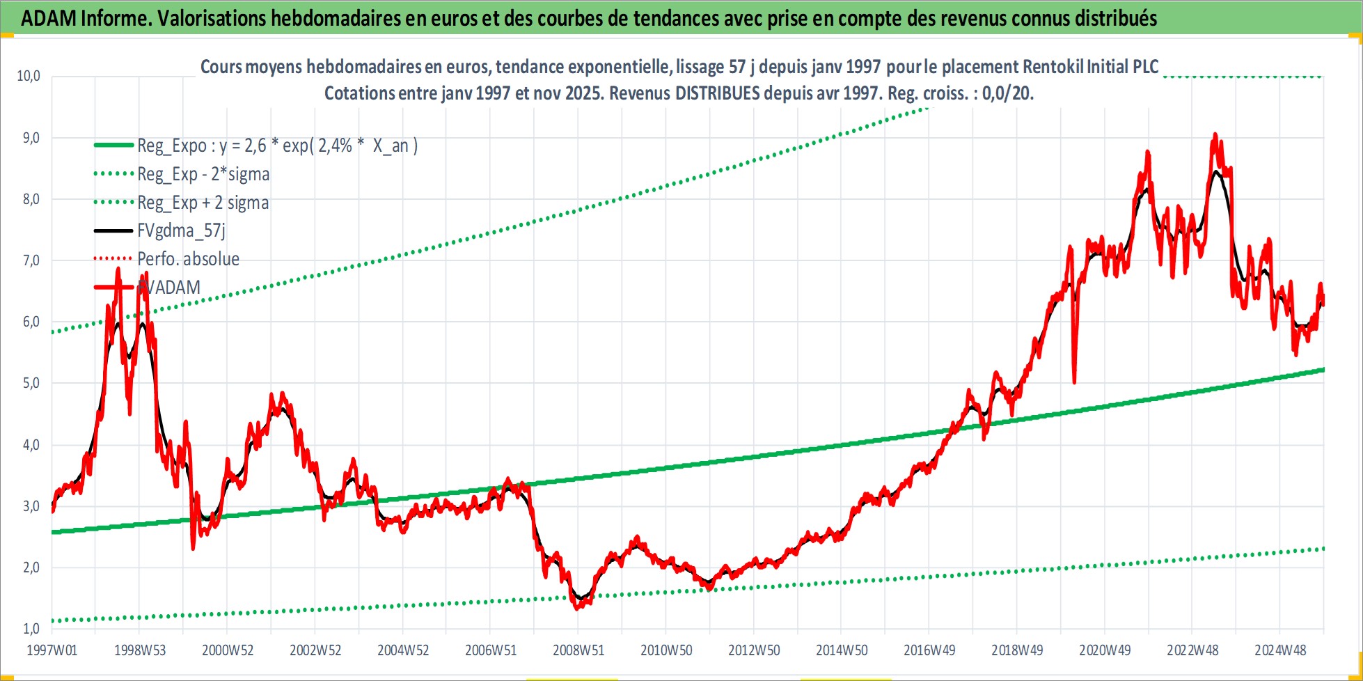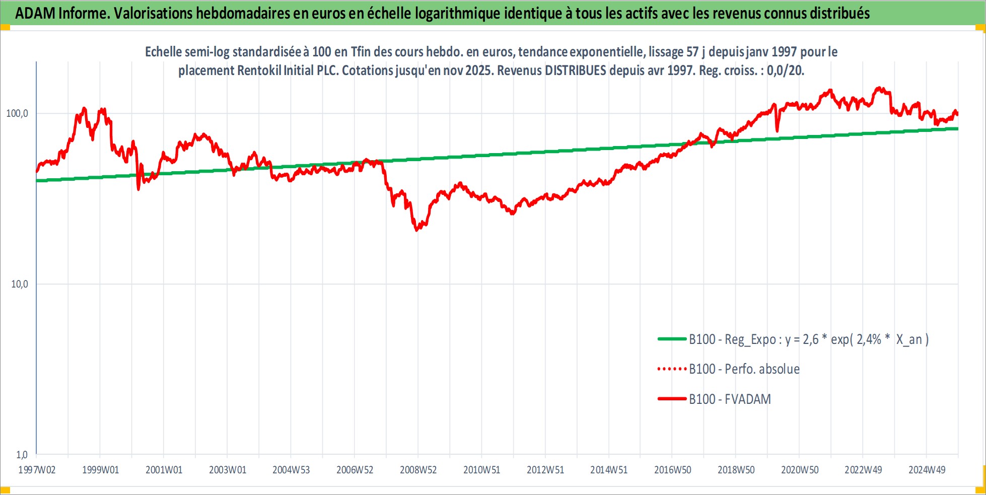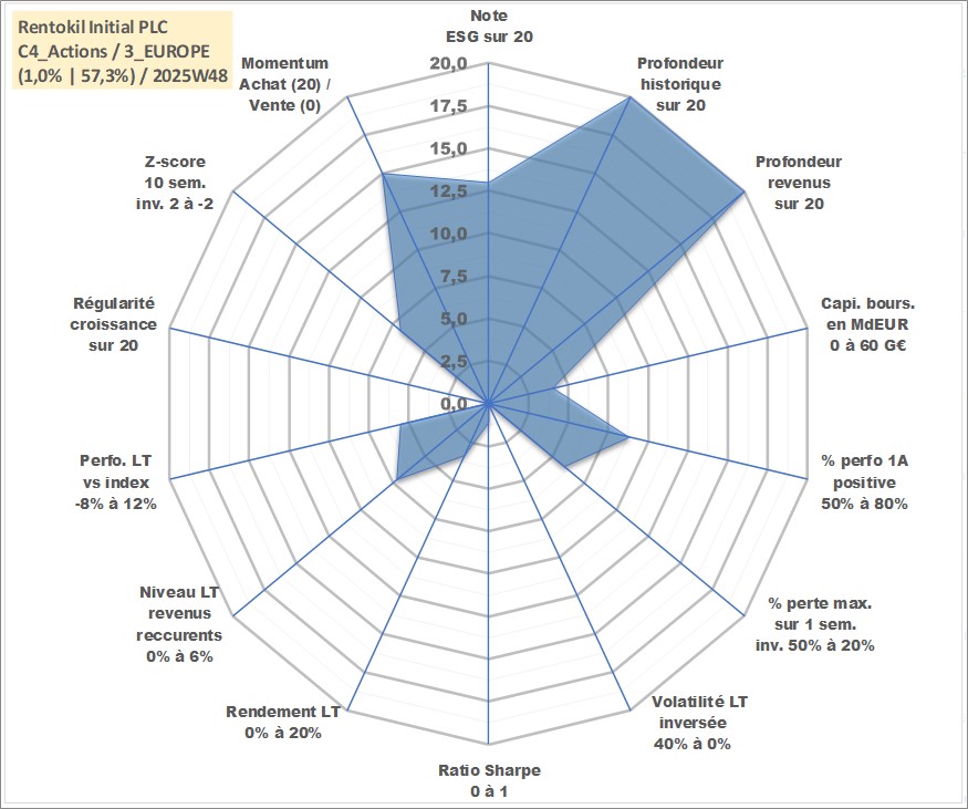 Site dédié aux investisseursPage dédiée sur site financeAnalyse des valorisations hebdomadaires de l'action Rentokil Initial PLC. Cet actif est cote en GBX. Les valorisations sont en contrevaleur EURO et couvrent les semaines 1997W01 a 2025W48. Les revenus de cet actif financier sont pris en compte depuis la semaine 1997W16. La note globale ESG de cet actif est estimee a 13.0 (apres rebasage entre 0 et 20).