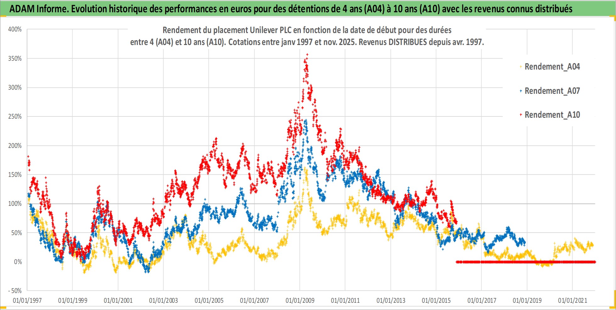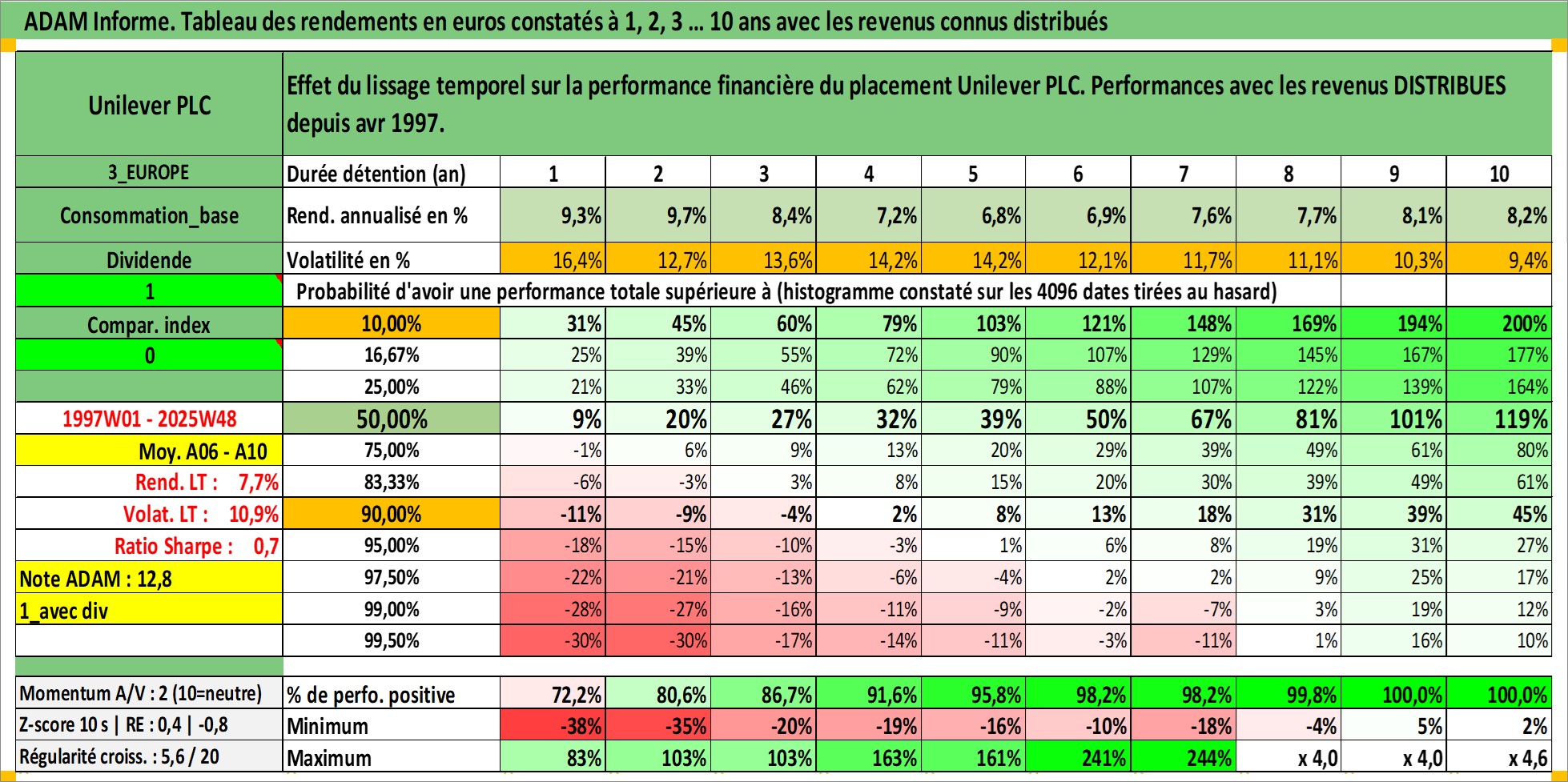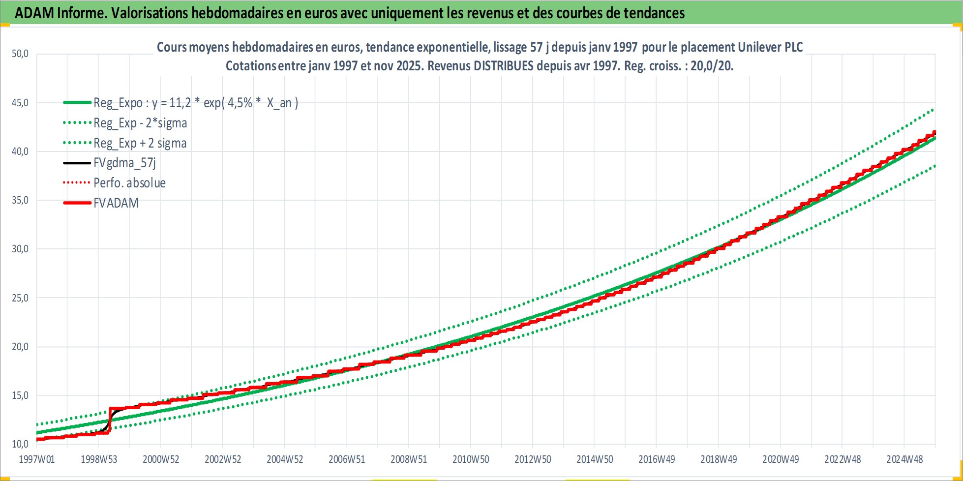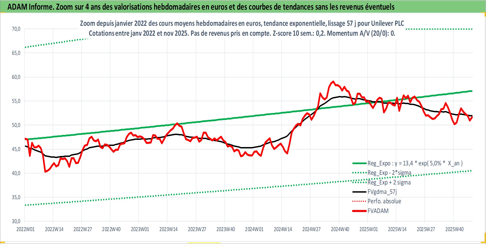 Site dédié aux investisseursPage dédiée sur site financeAnalyse des valorisations hebdomadaires de l'action Unilever PLC. Cet actif est cote en GBX. Les valorisations sont en contrevaleur EURO et couvrent les semaines 1997W01 a 2025W48. Les revenus de cet actif financier sont pris en compte depuis la semaine 1997W15. La note globale ESG de cet actif est estimee a 10.0 (apres rebasage entre 0 et 20).