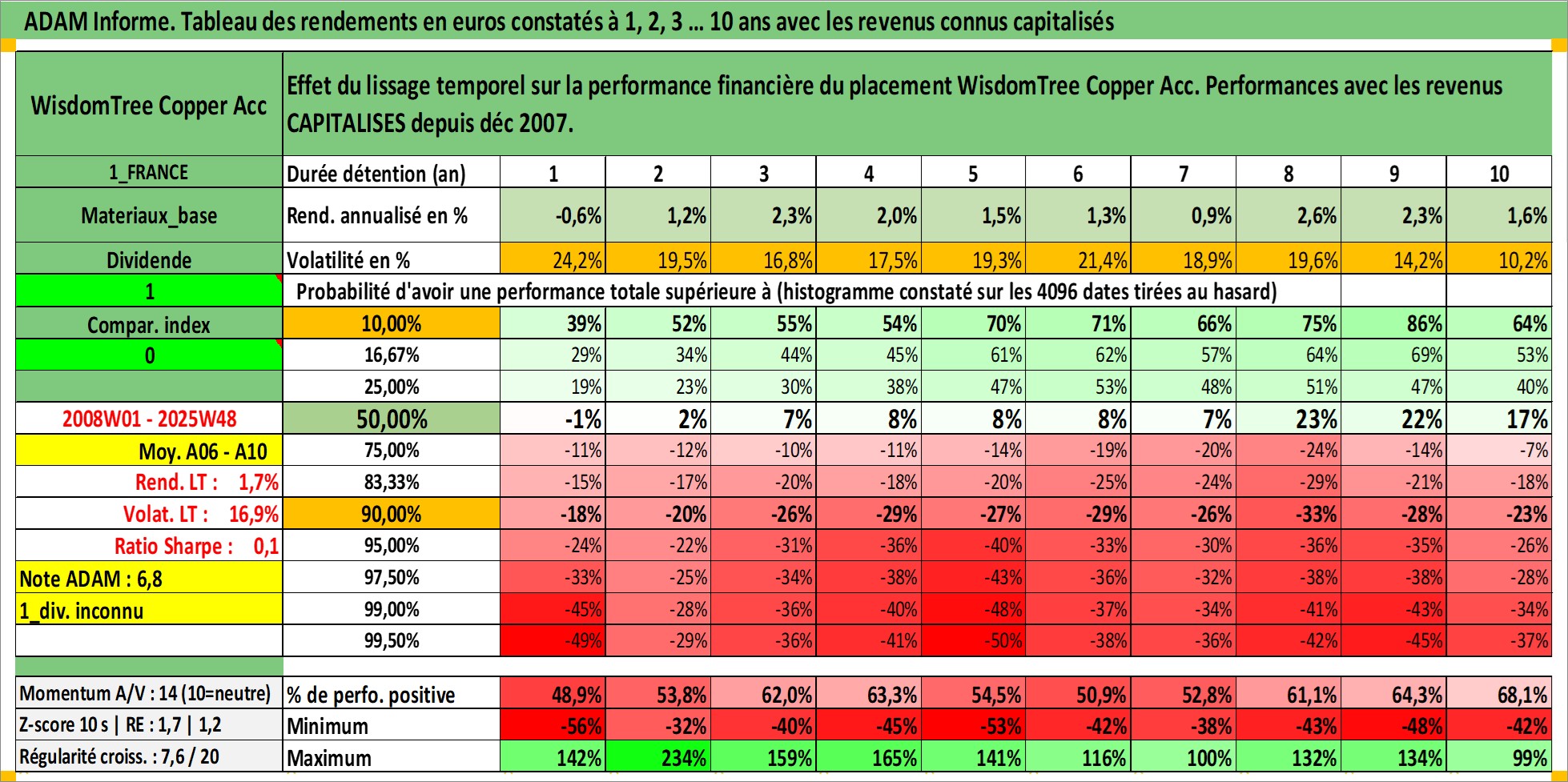 Site dédié aux investisseursPage dédiée sur site financeAnalyse des valorisations hebdomadaires du fonds WisdomTree Copper Acc. Cet actif est cote en USD. Les valorisations sont en contrevaleur EURO et couvrent les semaines 2008W01 a 2025W48. Les revenus de cet actif financier sont pris en compte depuis la semaine 2008W01. La note ESG de cet actif n'est pas connue.