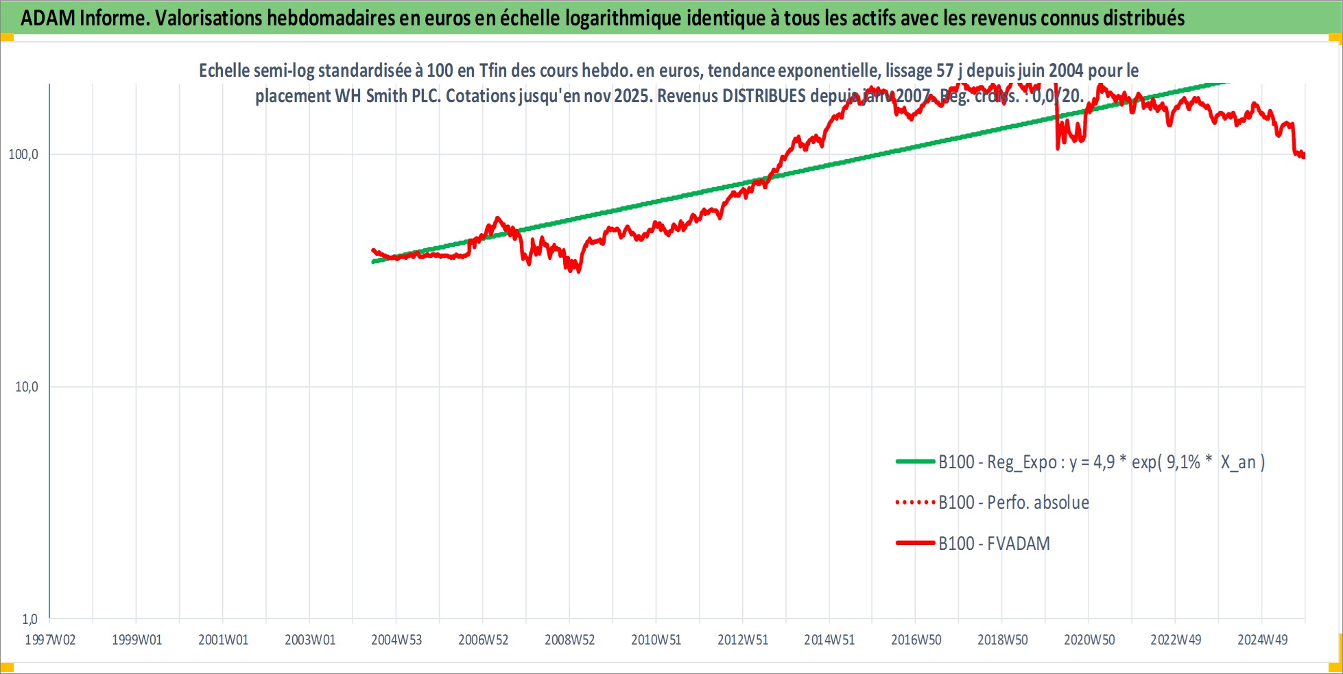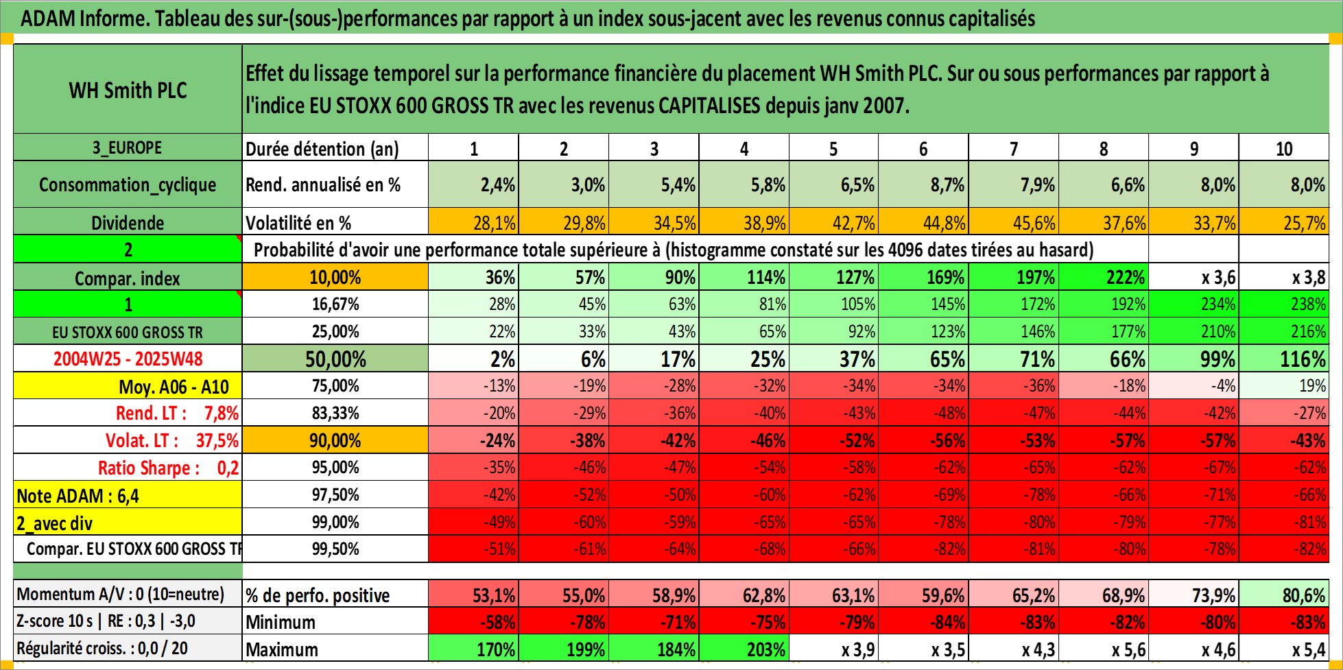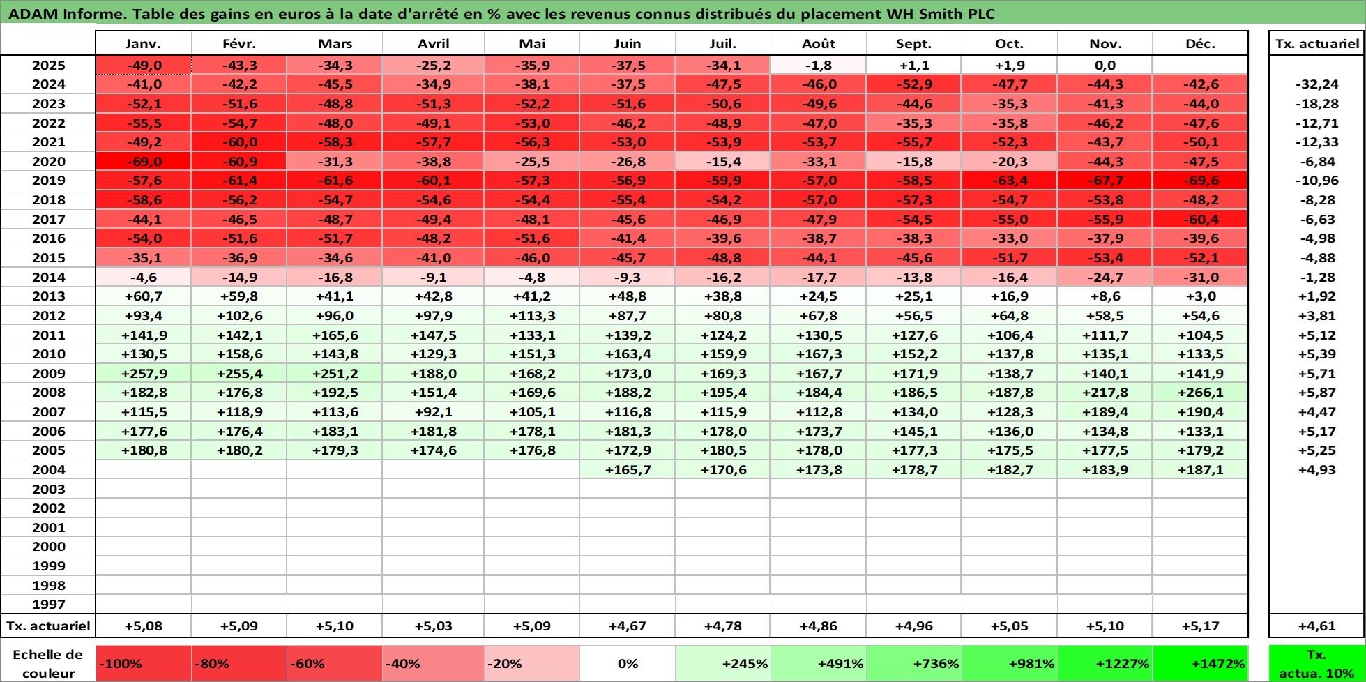 Site dédié aux investisseursPage dédiée sur site financeAnalyse des valorisations hebdomadaires de l'action WH Smith PLC. Cet actif est cote en GBX. Les valorisations sont en contrevaleur EURO et couvrent les semaines 2004W25 a 2025W48. Les revenus de cet actif financier sont pris en compte depuis la semaine 2007W01. La note ESG de cet actif n'est pas connue.