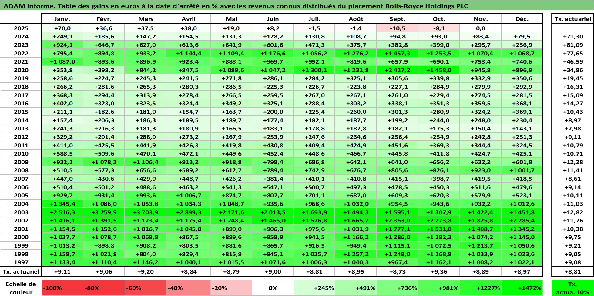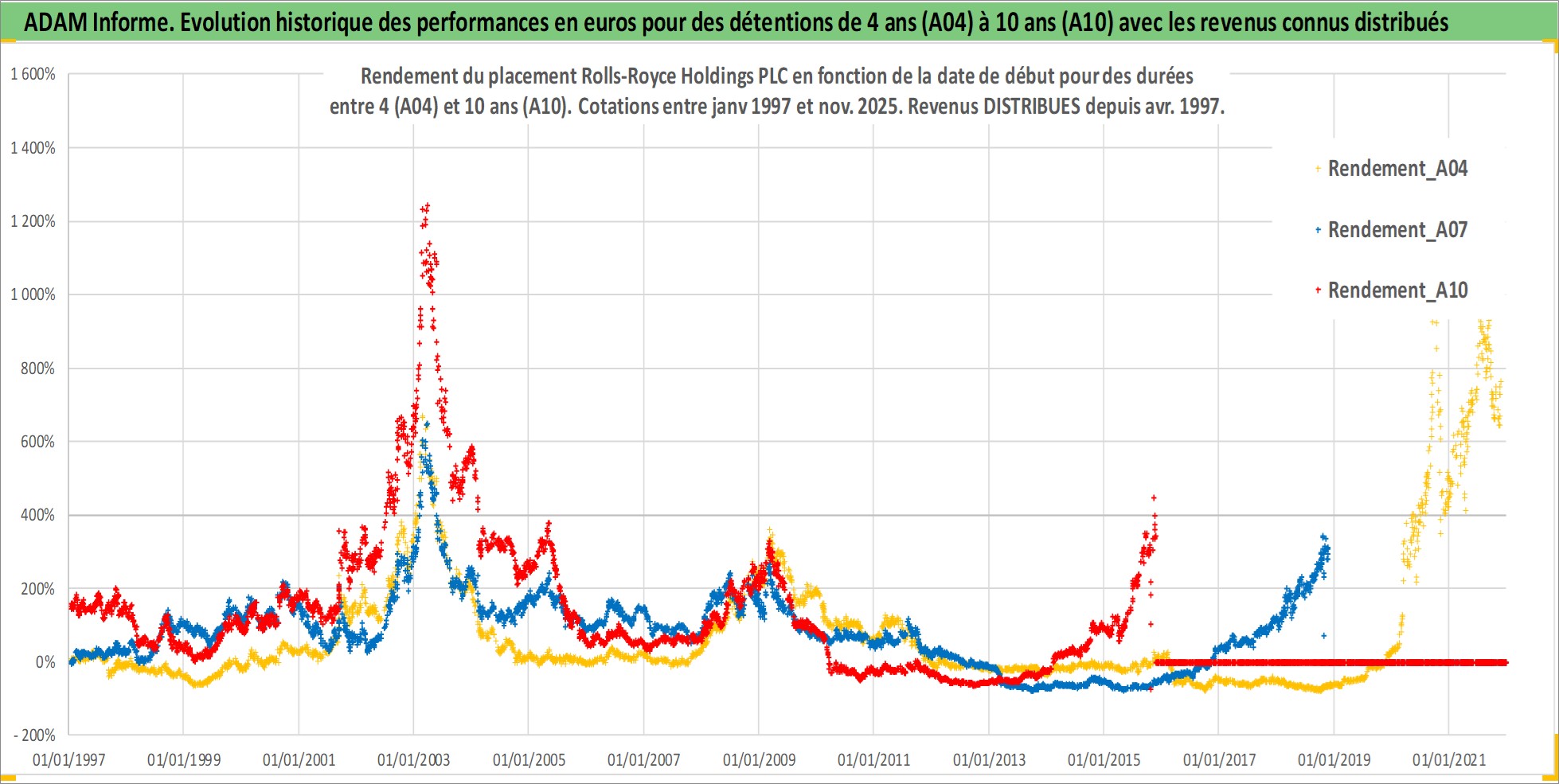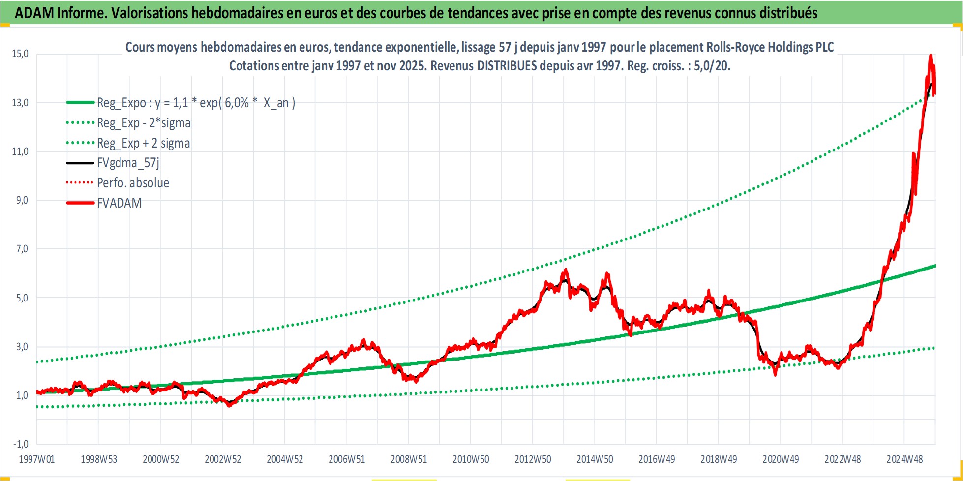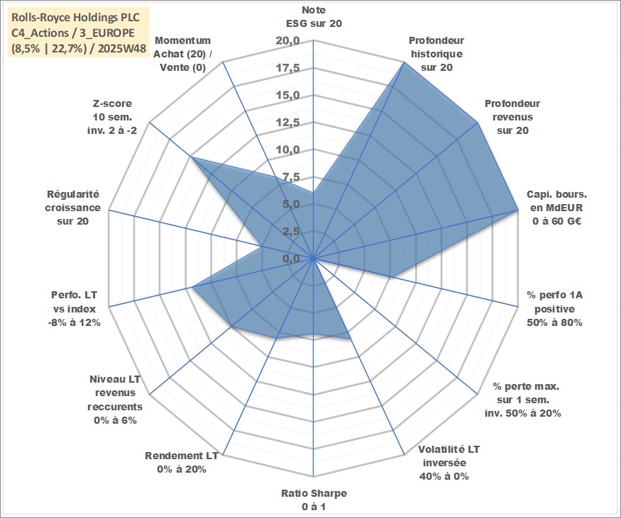 Site dédié aux investisseursPage dédiée sur site financeAnalyse des valorisations hebdomadaires de l'action Rolls-Royce Holdings PLC. Cet actif est cote en GBX. Les valorisations sont en contrevaleur EURO et couvrent les semaines 1997W01 a 2025W48. Les revenus de cet actif financier sont pris en compte depuis la semaine 1997W17. La note globale ESG de cet actif est estimee a 6.0 (apres rebasage entre 0 et 20).